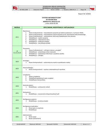 ISO 9001:2000 TECHNOLOGIA OBSŁUGI KONTRAKTÓW INFORMACJA O AKTUALIZACJI SYSTEMU Dokument: Raport Numer: 3/2016 Wydanie: 2008-04-22 Waga: 90 Raport Nr 3/2016 SYSTEM INFORMATYCZNY KS-SOLAB'2016 WERSJA Nr 2016.01.0.0 z dnia 2016-05-09 MODUŁ LB11 LB 21,22,23,24 OPIS ZMIAN, MODYFIKACJI i AKTUALIZACJI Rejestracja: 1. Nowa funkcjonalność – wyszukiwanie pacjenta po kodzie paskowym z numerem PESEL 2. Nowa funkcjonalność – wyszukiwanie zleceń pacjenta przez skanowanie kodu kreskowego 3. Nowa funkcjonalność – wyświetlanie informacji dodatkowych dla zlecenia 4. Modyfikacja – wybór pacjenta 5. Modyfikacja – odświeżanie okna 6. Modyfikacja – podmiana kodów 7. Modyfikacja – weryfikacja próbek Pracownie: 1. Nowa funkcjonalność – cofnięcie statusu „przyjęte” 2. Modyfikacja – prezentacja zmian statusów 3. Modyfikacja – prezentacja informacji o wysłaniu wyniku 4. Modyfikacja – ePodpis LB23 Serologia: 1. Nowa funkcjonalność – automatyczny wynik na podstawie reakcji LB25 Patomorfologia: 1. Nowa funkcjonalność – wydruk niekompletnych wyników LB33 Urządzenia: 1. Nowe urządzenia 2. Modyfikacje globalnych opcji urządzeń 3. Modyfikacje sterowników LB34 Kontrola jakości: 1. Modyfikacja – sortowanie metod LB51 Zestawienia: 1. Modyfikacja – rozszerzenie eksportowalnych pól LB52 Konfiguracja systemu: 1. Modyfikacja – struktura badań LB53 Konfiguracja wydruków: 1. Nowe pola na wydruku 2. Modyfikacje LB61 Administrator: 1. Nowe opcje 2. Nowe uprawnienia SOLAB-RAPORT Wykonał: MDYLSKI Sprawdził: PKUPKA Zatwierdził: MDYLSKI Strona 1 z 2 ISO 9001:2000 TECHNOLOGIA OBSŁUGI KONTRAKTÓW INFORMACJA O AKTUALIZACJI SYSTEMU Dokument: Raport Numer: 3/2016 Wydanie: 2008-04-22 LB64 Kontrakty: 1. Nowa funkcjonalność – współczynniki w cennikach i umowach LB65 Rozliczenia: 1. Nowa funkcjonalność – indywidualne ustawienia dla kontrahentów INNE: 1. 2. 3. 4. 5. 6. SOLAB-RAPORT Waga: 90 HL7 –modyfikacja mechanizmu odbioru zleceń HL7 CDA – definicja danych logowania ZSIMED – dostosowanie KS-SOLAB do współpracy z systemem KS-ZSIMED Integracja SOLAB - SOMED – modyfikacje Integracja SOLAB - SOMED – nowa funkcja – podgląd podpisanych skierowań elektronicznych OSOZ – modyfikacja słowników badań Wykonał: MDYLSKI Sprawdził: PKUPKA Zatwierdził: MDYLSKI Strona 2 z 2