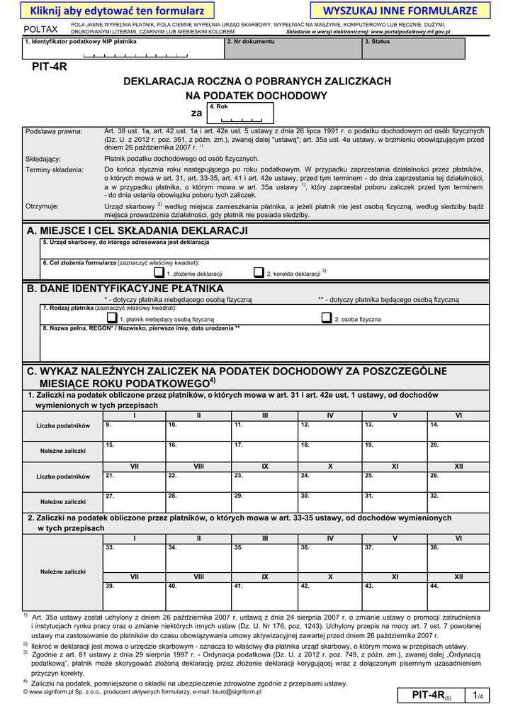 Kliknij aby edytować ten formularz POLTAX WYSZUKAJ INNE FORMULARZE POLA JASNE WYPEŁNIA PŁATNIK, POLA CIEMNE WYPEŁNIA URZĄD SKARBOWY. WYPEŁNIAĆ NA MASZYNIE, KOMPUTEROWO LUB RĘCZNIE, DUŻYMI, DRUKOWANYMI LITERAMI, CZARNYM LUB NIEBIESKIM KOLOREM. Składanie w wersji elektronicznej: www.portalpodatkowy.mf.gov.pl 1. Identyfikator podatkowy NIP płatnika 2. Nr dokumentu 3. Status PIT-4R DEKLARACJA ROCZNA O POBRANYCH ZALICZKACH NA PODATEK DOCHODOWY za Podstawa prawna: 4. Rok Art. 38 ust. 1a, art. 42 ust. 1a i art. 42e ust. 5 ustawy z dnia 26 lipca 1991 r. o podatku dochodowym od osób fizycznych (Dz. U. z 2012 r. poz. 361, z późn. zm.), zwanej dalej "ustawą"; art. 35a ust. 4a ustawy, w brzmieniu obowiązującym przed dniem 26 października 2007 r. 1) Składający: Płatnik podatku dochodowego od osób fizycznych. Terminy składania: Do końca stycznia roku następującego po roku podatkowym. W przypadku zaprzestania działalności przez płatników, o których mowa w art. 31, art. 33-35, art. 41 i art. 42e ustawy, przed tym terminem - do dnia zaprzestania tej działalności, a w przypadku płatnika, o którym mowa w art. 35a ustawy 1), który zaprzestał poboru zaliczek przed tym terminem - do dnia ustania obowiązku poboru tych zaliczek. Otrzymuje: Urząd skarbowy 2) według miejsca zamieszkania płatnika, a jeżeli płatnik nie jest osobą fizyczną, według siedziby bądź miejsca prowadzenia działalności, gdy płatnik nie posiada siedziby. ' ' ' ' ' ' A. MIEJSCE I CEL SKŁADANIA DEKLARACJI 5. Urząd skarbowy, do którego adresowana jest deklaracja 6. Cel złożenia formularza (zaznaczyć właściwy kwadrat): 2. korekta deklaracji 1. złożenie deklaracji 3) B. DANE IDENTYFIKACYJNE PŁATNIKA * - dotyczy płatnika niebędącego osobą fizyczną ** - dotyczy płatnika będącego osobą fizyczną 7. Rodzaj płatnika (zaznaczyć właściwy kwadrat): 1. płatnik niebędący osobą fizyczną 8. Nazwa pełna, REGON* / Nazwisko, pierwsze imię, data urodzenia ** 2. osoba fizyczna C. WYKAZ NALEŻNYCH ZALICZEK NA PODATEK DOCHODOWY ZA POSZCZEGÓLNE MIESIĄCE ROKU PODATKOWEGO4) 1. Zaliczki na podatek obliczone przez płatników, o których mowa w art. 31 i art. 42e ust. 1 ustawy, od dochodów wymienionych w tych przepisach I Liczba podatników II III IV V VI 9. 10. 11. 12. 13. 14. 15. 16. 17. 18. 19. 20. Należne zaliczki VII Liczba podatników VIII IX X XI XII 21. 22. 23. 24. 25. 26. 27. 28. 29. 30. 31. 32. Należne zaliczki 2. Zaliczki na podatek obliczone przez płatników, o których mowa w art. 33-35 ustawy, od dochodów wymienionych w tych przepisach II I 33. Należne zaliczki VII 39. 1) 2) 3) 4) 34. III 35. VIII 40. IV 36. IX 41. V X 42. VI 38. 37. XI 43. XII 44. Art. 35a ustawy został uchylony z dniem 26 października 2007 r. ustawą z dnia 24 sierpnia 2007 r. o zmianie ustawy o promocji zatrudnienia i instytucjach rynku pracy oraz o zmianie niektórych innych ustaw (Dz. U. Nr 176, poz. 1243). Uchylony przepis na mocy art. 7 ust. 7 powołanej ustawy ma zastosowanie do płatników do czasu obowiązywania umowy aktywizacyjnej zawartej przed dniem 26 października 2007 r. Ilekroć w deklaracji jest mowa o urzędzie skarbowym - oznacza to właściwy dla płatnika urząd skarbowy, o którym mowa w przepisach ustawy. Zgodnie z art. 81 ustawy z dnia 29 sierpnia 1997 r. - Ordynacja podatkowa (Dz. U. z 2012 r. poz. 749, z późn. zm.), zwanej dalej „Ordynacją podatkową”, płatnik może skorygować złożoną deklarację przez złożenie deklaracji korygującej wraz z dołączonym pisemnym uzasadnieniem przyczyn korekty. Zaliczki na podatek, pomniejszone o składki na ubezpieczenie zdrowotne zgodnie z przepisami ustawy. © www.signform.pl Sp. z o.o., producent aktywnych formularzy, e-mail: [email protected] PIT-4R(5) 1/4 ' ' POLTAX POLA JASNE WYPEŁNIA PŁATNIK, POLA CIEMNE WYPEŁNIA URZĄD SKARBOWY. WYPEŁNIAĆ NA MASZYNIE, KOMPUTEROWO LUB RĘCZNIE, DUŻYMI, DRUKOWANYMI LITERAMI, CZARNYM LUB NIEBIESKIM KOLOREM. Składanie w wersji elektronicznej: www.portalpodatkowy.mf.gov.pl 3. Suma należnych zaliczek za poszczególne miesiące roku podatkowego wykazanych w wierszach 1 i 2 I 45. Suma należnych zaliczek II 46. VII 51. III 47. VIII 52. IX 53. V IV 48. 49. X 54. VI 50. XI 55. XII 56. 4. Zaliczki na podatek, których pobór został ograniczony na podstawie art. 32 ust. 2 ustawy I 57. Kwoty zaliczek II 58. VII 63. III 59. VIII 64. IV 60. IX X 66. 65. V 61. VI 62. XI XII 68. 67. 5. Zaliczki, które przypadały do pobrania w związku z ograniczeniem poboru zaliczek w poprzednich miesiącach na podstawie art. 32 ust. 2 ustawy I 69. Kwoty zaliczek II 70. VII 75. III 71. VIII 76. IV 72. IX 77. V 73. X 78. VI 74. XI 79. XII 80. 6. Dodatkowo pobrany podatek wynikający z rozliczenia za rok ubiegły I 81. Kwoty podatku II 82. VII III VIII IV V VI X XI XII 84. 83. IX 7. Nadpłaty wynikające z rozliczenia za rok ubiegły oraz zwrot nadpłat w gotówce, zaliczone na poczet należnej zaliczki I 85. Kwota nadpłaty zaliczonej oraz zwróconej w gotówce II 86. VII 91. III 87. VIII 92. IV 88. IX 93. V 89. X 94. VI 90. XI 95. XII 96. 8. Pobrany podatek, przekazany na PFRON oraz zakładowy fundusz rehabilitacji osób niepełnosprawnych albo zakładowy fundusz aktywności I 97. Kwoty podatku VII 103. PIT-4R(5) II 98. 2/4 III 99. VIII 104. IV 100. IX 105. V 101. X 106. VI 102. XI 107. © www.signform.pl Sp. z o.o., producent aktywnych formularzy, e-mail: [email protected] XII 108. POLTAX POLA JASNE WYPEŁNIA PŁATNIK, POLA CIEMNE WYPEŁNIA URZĄD SKARBOWY. WYPEŁNIAĆ NA MASZYNIE, KOMPUTEROWO LUB RĘCZNIE, DUŻYMI, DRUKOWANYMI LITERAMI, CZARNYM LUB NIEBIESKIM KOLOREM. Składanie w wersji elektronicznej: www.portalpodatkowy.mf.gov.pl 9. Zaliczki na podatek pobrane od świadczeń z tytułu działalności określonej w art. 13 pkt 2 i 4-9 oraz art. 18 ustawy I 109. Kwoty zaliczek II 110. VII 115. III 111. VIII 116. IV 112. IX 117. V VI 113. XI X 118. 114. XII 119. 120. 10. Zaliczki na podatek pobrane od inn