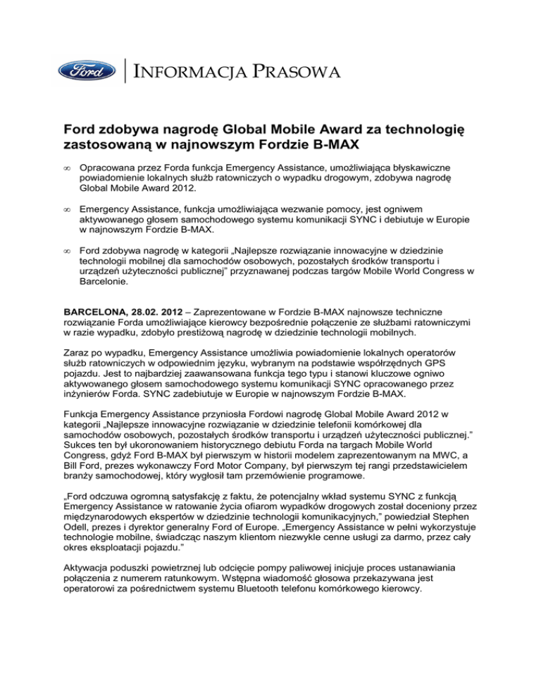 INFORMACJA PRASOWA Ford zdobywa nagrodę Global Mobile Award za technologię zastosowaną w najnowszym Fordzie B-MAX • Opracowana przez Forda funkcja Emergency Assistance, umoŜliwiająca błyskawiczne powiadomienie lokalnych słuŜb ratowniczych o wypadku drogowym, zdobywa nagrodę Global Mobile Award 2012. • Emergency Assistance, funkcja umoŜliwiająca wezwanie pomocy, jest ogniwem aktywowanego głosem samochodowego systemu komunikacji SYNC i debiutuje w Europie w najnowszym Fordzie B-MAX. • Ford zdobywa nagrodę w kategorii „Najlepsze rozwiązanie innowacyjne w dziedzinie technologii mobilnej dla samochodów osobowych, pozostałych środków transportu i urządzeń uŜyteczności publicznej” przyznawanej podczas targów Mobile World Congress w Barcelonie. BARCELONA, 28.02. 2012 – Zaprezentowane w Fordzie B-MAX najnowsze techniczne rozwiązanie Forda umoŜliwiające kierowcy bezpośrednie połączenie ze słuŜbami ratowniczymi w razie wypadku, zdobyło prestiŜową nagrodę w dziedzinie technologii mobilnych. Zaraz po wypadku, Emergency Assistance umoŜliwia powiadomienie lokalnych operatorów słuŜb ratowniczych w odpowiednim języku, wybranym na podstawie współrzędnych GPS pojazdu. Jest to najbardziej zaawansowana funkcja tego typu i stanowi kluczowe ogniwo aktywowanego głosem samochodowego systemu komunikacji SYNC opracowanego przez inŜynierów Forda. SYNC zadebiutuje w Europie w najnowszym Fordzie B-MAX. Funkcja Emergency Assistance przyniosła Fordowi nagrodę Global Mobile Award 2012 w kategorii „Najlepsze innowacyjne rozwiązanie w dziedzinie telefonii komórkowej dla samochodów osobowych, pozostałych środków transportu i urządzeń uŜyteczności publicznej.” Sukces ten był ukoronowaniem historycznego debiutu Forda na targach Mobile World Congress, gdyŜ Ford B-MAX był pierwszym w historii modelem zaprezentowanym na MWC, a Bill Ford, prezes wykonawczy Ford Motor Company, był pierwszym tej rangi przedstawicielem branŜy samochodowej, który wygłosił tam przemówienie programowe. „Ford odczuwa ogromną satysfakcję z faktu, Ŝe potencjalny wkład systemu SYNC z funkcją Emergency Assistance w ratowanie Ŝycia ofiarom wypadków drogowych został doceniony przez międzynarodowych ekspertów w dziedzinie technologii komunikacyjnych,” powiedział Stephen Odell, prezes i dyrektor generalny Ford of Europe. „Emergency Assistance w pełni wykorzystuje technologie mobilne, świadcząc naszym klientom niezwykle cenne usługi za darmo, przez cały okres eksploatacji pojazdu.” Aktywacja poduszki powietrznej lub odcięcie pompy paliwowej inicjuje proces ustanawiania połączenia z numerem ratunkowym. Wstępna wiadomość głosowa przekazywana jest operatorowi za pośrednictwem systemu Bluetooth telefonu komórkowego kierowcy. W oparciu o informacje pochodzące z pokładowego urządzenia GPS, mapę i telefon komórkowy, system określa równieŜ współrzędne miejsca wypadku, co pozwala zaoszczędzić bezcenne sekundy łącząc się od razu z odpowiednim operatorem słuŜb ratowniczych (a nie ogólną centralą ratunkową). Podczas opracowywania funkcji Emergency Assistance, Ford współpracował z Europejskim Stowarzyszeniem Numeru Alarmowego 112 (EENA), którego wkład w zaprojektowanie systemu okazał się niezwykle cenny. Celem EENA jest zapewnienie wysokiego poziomu reagowania na zgłoszenia pod numer 112 na terenie Europy. „Miło nam, Ŝe podczas opracowywania funkcji Emergency Assistance Ford konsultował się z naszym stowarzyszeniem i europejskimi centralami numeru 112,” stwierdził Gary Machado, dyrektor wykonawczy EENA. „Jesteśmy przekonani, Ŝe systemy zapewniające komunikację pojazdu z operatorami numeru 112 pozwolą uratować Ŝycie niejednego Europejczyka.” Klienci będą mogli korzystać z funkcji Emergency Assistance bezpłatnie, w ramach uniwersalnej (modyfikowalnej) platformy SYNC ich pojazdu. System SYNC, którego ogniwem jest Emergency Assistance, funkcjonuje juŜ w ponad 4 mln samochodów poruszających się po drogach USA, zadebiutuje w Europie w Fordzie B-MAX. SYNC odczytuje na głos SMS-y wpływające z kompatybilnych telefonów komórkowych. System współpracuje z odtwarzaczami cyfrowymi, w tym urządzeniami takimi jak iPod-y czy napędy USB typu flash. SYNC aktualizuje automatycznie dane telefoniczne, a pliki audio przegląda według gatunku muzyki, wykonawcy, albumu, utworu i listy nagrań, reagując na proste polecenia głosowe. Port USB pozwala równieŜ na wprowadzenie ulepszeń do oprogramowania umoŜliwiających udoskonalanie całego systemu. Ford B-MAX zostanie po raz pierwszy zaprezentowany w marcu podczas Salonu Samochodowego w Genewie i jeszcze w tym roku trafi do sprzedaŜy. ### Aktualności dotyczące firmy Ford, zdjęcia oraz filmy w wysokiej rozdzielczości dostępne są na stronach prasowych firmy Ford Motor Company http://media.ford.com oraz http://fordmedia.eu Odwiedź nas na www.facebook.com/fordofeurope, www.twitter.com/FordEu lub www.youtube.com/fordofeurope 2