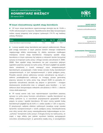 ANALIZY MAKROEKONOMICZNE KOMENTARZ BIEŻĄCY 25 marca 2014 W lutym nieoczekiwany spadek stopy bezrobocia BIURO ANALIZ MAKROEKONOMICZNYCH W lutym stopa bezrobocia rejestrowanego obniżyła się do 13,9% z 14,0% odnotowanych w styczniu. Opublikowane dane były korzystniejsze [email protected] wobec naszej prognozy oraz prognoz rynkowych (14,1% wg mediany ankiety Parkietu). ŁUKASZ TARNAWA dane stopa bezrobocia rejestrowanego sty 14 lut 14 14,0 13,9 % prognoza BOŚ Bank 14,1 22-850-86-75 [email protected] Lutowy spadek stopy bezrobocia jest sporym zaskoczeniem. Biorąc pod uwagę notowane w lutym jeszcze (ostatni miesiąc) zwiększenie negatywnego efektu sezonowego (tj. efekty sezonowe implikujące miesięczny wzrost stopy bezrobocia), miesięczny spadek stopy bezrobocia w lutym notowany był jedynie w okresach bardzo korzystnej sytuacji na krajowym rynku pracy i silnego wzrostu zatrudnienia (l. 20062008). Sam spadek stopy bezrobocia nie jest oczywiście jedynym sygnałem poprawy sytuacji na rynku pracy. W lutym pogłębił się spadek (dane uśrednione z trzech miesięcy) nowo zarejestrowanych bezrobotnych, przyspieszyło z kolei tempo wzrostu liczby bezrobotnych wyrejestrowanych, w tym wyrejestrowanych z tytułu podjęcia pracy. Ponadto szeroki zakres sektorowy wzrostu zatrudnienia wg danych z sektora przedsiębiorstw wskazuje na trwający proces generalnej poprawy sytuacji na rynku pracy (wg. danych GUS na początku br. dynamika zatrudnienia obniżała się jedynie w górnictwie – trwające dostosowania strukturalne oraz w usługach poza handlem – w tym sektorze dużo korzystniejsze wskaźniki zatrudnienia w 2013 r. i obecnie niższa skala poprawy). Główny Ekonomista W naszej ocenie cały czas najważniejszym czynnikiem poprawy sytuacji na rynku pracy (wzrostu zatrudnienia i spadku bezrobocia) są efekty cykliczne tj. w warunkach przyspieszenia gospodarki wzrost popytu na pracę i spadek bezrobocia. W lutym roczny spadek liczby bezrobotnych pogłębił się do 3,5% r/r, wobec spadku o 1,5% w styczniu. O pozytywnym wpływie efektów cyklicznych świadczy wciąż wysoka dynamika wyrejestrowanych z tytułu podjęcia pracy niesubsydiowanej oraz silny wzrost ofert pracy niesubsydiowanej (odpowiadające za tzw. „rynkowy” komponent rynku pracy). Z drugiej strony nie wykluczamy, że część z tego efektu jest jednak wynikiem bardziej sprzyjających warunków atmosferycznych, tj. generalnie ciepłej zimy, w szczególności ALEKSANDRA ŚWIĄTKOWSKA Ekonomista 22-850-88-12 [email protected] w porównaniu z okresem sprzed roku. Na pewien wpływ tego czynnika może wskazywać przyspieszenie w lutym dynamiki bezrobotnych wyrejestrowanych z tytułu podjęcia pracy o charakterze sezonowym. Szacujemy, że stopa bezrobocia po oczyszczeniu z wahań sezonowych obniżyła się o do 13,1-13,2% z 13,3% odnotowanych w styczniu. Z drugiej strony, choć cały czas głównym motorem poprawy sytuacji na rynku pracy są efekty cykliczne, to w niemałym stopniu na silniejszy spadek stopy bezrobocia wpływa zapewne uruchomienie kolejnej puli środków funduszu wsparcia rynku pracy. O ile faktycznie dynamika wzrostu wyrejestrowanych z tytułu podjęcia pracy niesubsydiowanej lub ofert pracy niesubsydiowanej jest zdecydowanie wyższa niż pracy subsydiowanej, to w ostatnich miesiącach silniej rośnie dynamika właśnie wyrejestrowanych z tytułu podjęcia pracy subsydiowanej. Te dane wskazują na dużo mniejszy roczny spadek wyrejestrowanych i ofert pracy w stosunku do danych z II poł. 2013 r. Ponadto wyraźnie przyspiesza także dynamika wzrostu wyrejestrowanych z tytułu przyznania środków na rozpoczęcie działalności gospodarczej. Biorąc pod uwagę powyższe, sądzimy, że w pewnym stopniu na poprawę danych dot. bezrobocia na przełomie 2013 i 2014 r. wpływa także zwiększenie wsparcia publicznego rynku pracy, a dokładniej wygasanie efektu z II poł. 2013 r. jego wyraźnego ograniczenia. Poza zmianami w zakresie liczby bezrobotnych, wydaje się, że na stopę bezrobocia, że także silniej zaczynają wpływać zmiany w zakresie podaży pracy, tj. liczby aktywnych zawodowo. Biorąc pod uwagę wyraźny spadek rocznej dynamiki wzrostu aktywnych zawodowo w styczniu i lutym oraz analizy NBP dot. sytuacji na rynku pracy wydaje się, że trochę wcześniej niż zakładaliśmy, dotychczasowy wzrost aktywnych zawodowo (zmiany w systemie emerytalnym oraz procesy demograficzne) zaczyna wygasać. Tym samym wygasa dotychczasowy trend wzrostu bezrobocia związany ze zwiększoną podażą pracy, co krótkookresowo wpływało na wzrost bezrobocia, szczególnie że przypadło (w minionych kwartałach) na okres spowolnienia gospodarczego i spadku popytu na pracę. O ile podtrzymujemy naszą prognozę relatywnie wolnego wzrostu popytu na pracę i wzrostu zatrudnienia, to czynnik wolniejszego niż dotychczas wzrostu podaży pracy może skutkować szybszym, wobec naszych założeń, spadkiem stopy bezrobocia w roku bieżącym. Biorąc pod uwagę, że luty jest zwyczajowo ostatnim miesiącem wzrostu bezrobocia z tytułu efektów sezonowych, jak również utrzymującą się poprawę cykliczną sytuacji na krajowym rynku pracy (wzrost zatrudnienia), oczekujemy 2 2014-03-25 dalszego spadku stopy bezrobocia w miesiącach kolejnych do 12,3-12,4% w III kw. oraz do ok. 13,1% w grudniu 2013 r. Jednocześnie biorąc pod uwagę tendencje kształtowania się podaży pracy dostrzegamy szanse na szybszy spadek stopy bezrobocia wobec naszej prognozy bazowej. Liczba bezrobotnych i aktywnych zawodowo Stopa bezrobocia rejestrowanego 22,0 % roczna zmiana liczby bezrobotnych (P) stopa bezrobocia rejestrowanego 600 16,5 4,0 mln tys. mln 18,0 300 3,3 16,0 14,0 0 2,5 15,5 10,0 -300 1,8 -600 1,0 sty-03 mar-04 maj-05 lip-06 wrz-07 lis-08 sty-10 mar-11maj-12 lip-13 15,0 liczba bezrobotnych liczba aktywnych zawodowo (P) 6,0 sty-03 mar-04maj-05 lip-06 wrz-07 lis-08 sty-10 mar-11maj-12 lip-13 xródło: GUS ródło: GUS liczba bezrobotnych % tys