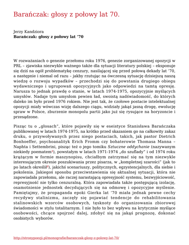 Barańczak: głosy z połowy lat 70. Jerzy Kandziora Barańczak: głosy z połowy lat ’70 W rozważaniach o genezie przełomu roku 1976, genezie zorganizowanej opozycji w PRL – zjawiska niezwykle ważnego także dla sytuacji literatury polskiej – eksponuje się dziś na ogół problematykę cenzury, nasilającej się przed połową dekady lat ’70, a następnie i niemal od razu – jakby rzutując na ówczesną sytuację dzisiejszą naszą wiedzę o rozwoju wypadków – przechodzi się do powstania drugiego obiegu wydawniczego i ugrupowań opozycyjnych jako odpowiedzi na tamtą opresję. Narusza to jednak prawdę o stanie, w latach 1974-1975, opozycyjnie myślących umysłów. Nadaje tym umysłom pewien ład, swoistą nadświadomość, do których daleko im było przed 1976 rokiem. Nie jest tak, że czołowe postacie intelektualnej opozycji miały wówczas wizję dalszego ciągu, widziały jakąś jasną drogę, ewolucję spraw w Polsce, zburzenie monopolu partii jako już się rysujące na horyzoncie i przesądzone. Pisząc tu o „głosach”, które pojawiły się w eseistyce Stanisława Barańczaka publikowanej w latach 1974-1975, na krótko przed skazaniem go na całkowity zakaz druku, o przywoływanych przez niego postaciach, takich, jak pastor Dietrich Bonhoeffer, psychoanalityk Erich Fromm czy bohaterowie Thomasa Manna – Naphta i Settembrini, pisząc też o jego tomiku Sztuczne oddychanie (nazywanym niekiedy poematem1), powstałym w latach 1971-1974 „do szuflady” i od 1974 roku krążącym w formie maszynopisu, chciałbym zatrzymać się na tym niezwykle interesującym okresie poszukiwania przez pisarza, w „kompletnej szarości” (jak to po latach określił2), jakichś scenariuszy, politycznych, egzystencjalnych, dla siebie i pokolenia. Jakiegoś sposobu przeciwstawienia się aktualnej sytuacji, która nie zapowiadała przełomu, ale raczej narastającą opresyjność systemu, bezwyjściowość, represyjność nie tylko cenzuralną. Która zapowiadała także postępującą izolację, osamotnienie jednostek decydujących się na odmowę i opozycyjne myślenie. Pamiętajmy, że propaganda epoki Gierka lat ’70 miała jednak pewne cechy recydywy stalinizmu, zaczęły się pojawiać tendencje do rehabilitowania stalinowskich wzorców osobowych, tęsknoty do organizowania zbiorowej świadomości w stylu totalitarnym. I nie było to bez wpływu na krytycznie myślące osobowości, chcące spojrzeć dalej, zdobyć się na jakąś prognozę, dokonać osobistych wyborów. http://stronypoezji.pl/monografie/baranczak-glosy-z-polowy-lat-70/ W dwóch głośnych esejach Barańczaka z lat 1974 i 1975 – Notatki na marginesach Bonhoeffera3 i Zmieniony głos Settembriniego4 – interesuje mnie kilka spraw: ujawnione w tych tekstach lektury młodego autora, które dostarczyły mu wzorców analitycznego myślenia o ówczesnej realności PRL, kierunek wpisanych w oba eseje scenariuszy rozwoju sytuacji, prowadzona w tych esejach gra z cenzorem i zawarty w nich swoisty kryptotekst, a wreszcie, bardzo osobisty i poruszający rys pewnej wewnętrznej konsolidacji, determinacji, wyraźny zwłaszcza w Notatkach na marginesach Bonhoeffera, świadczący o dojrzewaniu pisarza do zasadniczej i nieliczącej się z kosztami konfrontacji z systemem. Zaplecze intelektualne ówczesnej refleksji Barańczaka na temat PRL musi dzisiaj zaskakiwać. Były to między innymi wydane oficjalnie w kraju – w 1970 roku – książki na temat Niemiec hitlerowskich. Poza Wyborem pism Dietricha Bonhoeffera, do którego odwołują się Notatki…, trzeba wymienić książkę Anny Morawskiej o Bonhoefferze Chrześcijanin w Trzeciej Rzeszy, ale także przywołane w eseju Zmieniony głos Settembriniego dzieło Ericha Fromma Ucieczka od wolności. Fromm, Bonhoeffer i Morawska, były to lektury ważne zarówno dla Barańczaka, jak i dla jego pokolenia.5 Ten kierunek przywołań wskazuje, po pierwsze, że autor miał ugruntowane przeświadczenie o pokrewieństwie komunizmu i nazizmu. Po wtóre, że zdawał on sobie sprawę, iż wszelka refleksja o systemie faszystowskim może nabierać cech paraboli i być narzędziem diagnozowania i opisu sytuacji w PRL – kraju realnego socjalizmu. Z dzisiejszej perspektywy bardzo interesujące wydaje się pytanie o stopień interioryzacji przez Barańczaka tezy o podobieństwie obu systemów. Pytanie o to, jak dalece był on skłonny wówczas wierzyć w ewolucję realności PRL ku systemowi terroru nazistowskich Niemiec, i – pytajmy dalej – ku wojnie powszechnej i zaborczej, którą tamten system rozpętał. Jak dalece ta analogia mogła pisarzem zawładnąć? Można chyba wyrazić przypuszczenie, że wobec braku jakichkolwiek realnych oznak, na niebie i ziemi, zmierzchu systemu politycznego PRL, w sytuacji tkwienia w zawężającej się perspektywie losu własnego i pokolenia, tkwienia – jak pisał Woroszylski – „na kurczącym się skrawku”6, istniała atmosfera podatności na taki czarny scenariusz. Skoro doprawdy nie było czego się uchwycić, Barańczak mógł poruszać się gdzieś na granicy realnych diagnoz społecznych i projekcji poetyckiej wyobraźni, rozbudzonej dostrzeżonymi analogiami. Mój wywód będzie między innymi próbą rozważenia tej sytuacji. Znamienne, że nigdy później, w końcówce PRL, nie powróciła tak sugestywna, katastroficzna wizja przeobrażeń ku faszyzmowi, choć oczywiście poczucie pokrewieństw dwóch systemów totalitarnych stało się trwałym elementem opozycyjnej świadomości. Zasadnicze podobieństwo szkiców Notatki na marginesach Bonhoeffera oraz Zmieniony głos Settembriniego polega na identycznym w obu tekstach przywołaniu faszyzmu jako pewnego problemu poznawczego XX wieku. Powtarzającą się w http://stronypoezji.pl/monografie/baranczak-glosy-z-polowy-lat-70/ esejach figurą myśli jest refleksja brzmiąca wówczas chyba dość gładko dla cenzora, że XX wiek przyniósł zupełnie nowe doświadczenie w konf