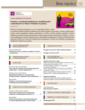 !!! TEMAT MIESI¥CA Joanna Narkiewicz-Tar³owska Przepisy o rezydencji podatkowej a opodatkowanie cudzoziemców w Polsce i Polaków za granic¹ czytaj na str. 7 Ostatnia nowelizacja przepisów u.p.d.o.f. wprowadzi³a zmiany w zakresie ustalania polskiej rezydencji podatkowej. Do ustawy dodano nowy przepis, w którym zdefiniowano pojêcie osoby posiadaj¹cej miejsce zamieszkania w Polsce. Autorka analizuje przes³anki, których spe³nienie prowadzi do uznania podatnika za osobê maj¹c¹ miejsce zamieszkania w Polsce, a tym samym podlegaj¹c¹ w Polsce nieograniczonemu obowi¹zkowi podatkowemu. Autorka omówi³a równie¿ praktyczne skutki tych zmian dla cudzoziemców pracuj¹cych w Polsce oraz Polaków prowadz¹cych dzia³alnoœæ zarobkow¹ za granic¹. G£OS DORADCÓW PODATKOWYCH ORZECZNICTWO Dariusz M. Malinowski Nowelizacja ustawy o podatku od spadków i darowizn – kontrowersje ................................................................... 3 PROFESJONALIŒCI O PODATKACH 5 PODATKI David Logan Hill, Tomasz Kardach Trust i prywatna fundacja jako narzêdzia planowania podatkowego – wybrane zagadnienia (1) ...................... 14 Waldemar Knap, Pawe³ Wójciak Optymalizacja podatkowa z wykorzystaniem jurysdykcji krajów o ³agodnym re¿imie podatkowym... 21 Marcin Panek Praktyka w zakresie interpretacji ustaw nowelizuj¹cych przepisy podatkowe ............................. 28 ORDYNACJA PODATKOWA W³odzimierz Nykiel, Dariusz Strzelec Interpretacje przepisów prawa podatkowego wydawane w indywidualnych sprawach (1)................. 34 Marek Olejnik Konsekwencje decyzji o umorzeniu postêpowania w sprawie odpowiedzialnoœci cz³onka zarz¹du ............ 41 Przegl¹d orzecznictwa s¹dów administracyjnych ........ 46 Przegl¹d orzecznictwa ETS ............................................. 48 WYJAŒNIENIA I INTERPRETACJE Podatek od towarów i us³ug Wywóz towaru poza Uniê Europejsk¹ na skutek dostawy dokonywanej dla kontrahenta z UE .................................... 54 Samochód osobowy nabyty po 1 maja 2004 r. a remanent likwidacyjny .................................................... 54 Zasady opodatkowania umów barterowych podatkiem od towarów i us³ug ............................................................ 55 Korekta wewn¹trzwspólnotowego nabycia towarów ........ 57 Odliczenie VAT – nabycie energii elektrycznej................... 58 Ordynacja podatkowa W³aœciwoœæ miejscowa organów podatkowych przy zaliczeniu nadp³aty na poczet zobowi¹zañ podatkowych... 59 FELIETONY Piotr Ambroziewicz Moja Wysokoœæ Podatnik................................................ 33 AKTUALNOŒCI Z BRUKSELI 62 MIESI¥C W PODATKACH 62 Prenumerata PP .......................................................... 64 Przegl¹d Podatkowy 5/2007 1 David Logan Hill, Tomasz Kardach Trust i prywatna fundacja jako narzêdzia planowania podatkowego – wybrane zagadnienia (1) • Jaka jest konstrukcja tradycyjnego trustu w systemie common law? • Jaki jest okres funkcjonowania trustu i jaki maj¹tek mo¿e wchodziæ w jego sk³ad? • Na jakich zasadach opodatkowane s¹ trusty? • Jakie s¹ skutki transferu aktywów do zagranicznego trustu w zakresie podatku od spadków i darowizn? czytaj na str. 14 Waldemar Knap, Pawe³ Wójciak Optymalizacja podatkowa z wykorzystaniem jurysdykcji krajów o ³agodnym re¿imie podatkowym • Jakie kraje okreœla siê mianem tzw. rajów podatkowych? • W jakim celu i w jaki sposób wykorzystuje siê jurysdykcjê krajów o ³agodnym re¿imie podatkowym? • Jakie dzia³ania podejmuj¹ spó³ki w zwi¹zku z optymalizacj¹ obci¹¿eñ podatkowych? czytaj na str. 21 Marcin Panek Praktyka w zakresie interpretacji ustaw nowelizuj¹cych przepisy podatkowe • Czy istniej¹ jakieœ zasady dotycz¹ce interpretacji zmian przepisów podatkowych? • W jaki sposób unikaæ automatyzmu przy ustalaniu „charakteru” zmiany legislacyjnej? • Jaka wyk³adnia powinna mieæ decyduj¹ce znaczenie przy odczytaniu rzeczywistej treœci norm podatkowych? • Jakie podejœcie do interpretacji przepisów wydaje siê najw³aœciwsze? czytaj na str. 24 Marek Olejnik Konsekwencje decyzji o umorzeniu postêpowania w sprawie odpowiedzialnoœci cz³onka zarz¹du • Jakie s¹ ogólne zasady odpowiedzialnoœci cz³onków zarz¹du za zaleg³oœci podatkowe spó³ki? • Z czego wynika odpowiedzialnoœæ osoby trzeciej za cudze zobowi¹zania? • Do czego prowadzi wskazanie przez cz³onka zarz¹du maj¹tku spó³ki, z którego mo¿liwe jest prowadzenie egzekucji, jeœli wszczêto ju¿ wobec tej osoby postêpowanie na podstawie art. 116 o.p.? • Jaki charakter maj¹ decyzje umarzaj¹ce postêpowanie w sprawie odpowiedzialnoœci cz³onka zarz¹du? czytaj na str. 41 2 Przegl¹d Podatkowy 5/2007
