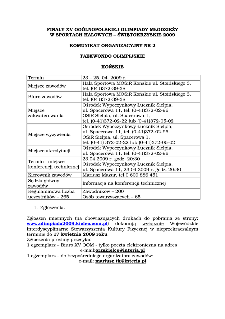 FINAŁY XV OGÓLNOPOLSKIEJ OLIMPIADY MŁODZIEŻY W SPORTACH HALOWYCH – ŚWIĘTOKRZYSKIE 2009 KOMUNIKAT ORGANIZACYJNY NR 2 TAEKWONDO OLIMPIJSKIE KOŃSKIE Termin 23 – 25. 04. 2009 r. Hala Sportowa MOSiR Końskie ul. Stoińskiego 3, Miejsce zawodów tel. (041)372-39-38 Hala Sportowa MOSiR Końskie ul. Stoińskiego 3, Biuro zawodów tel. (041)372-39-38 Ośrodek Wypoczynkowy Łucznik Sielpia, Miejsce ul. Spacerowa 11, tel. (0-41)372-02-96 zakwaterowania OSiR Sielpia, ul. Spacerowa 1, tel. (0-41)372-02-22 lub (0-41)372-05-02 Ośrodek Wypoczynkowy Łucznik Sielpia, ul. Spacerowa 11, tel. (0-41)372-02-96 Miejsce wyżywienia OSiR Sielpia, ul. Spacerowa 1, tel. (0-41) 372-02-22 lub (0-41)372-05-02 Ośrodek Wypoczynkowy Łucznik Sielpia, Miejsce akredytacji ul. Spacerowa 11, tel. (0-41)372-02-96 23.04.2009 r. godz. 20:30 Termin i miejsce Ośrodek Wypoczynkowy Łucznik Sielpia, konferencji technicznej ul. Spacerowa 11, 23.04.2009 r. godz. 20:30 Kierownik zawodów Mariusz Mazur, tel.0 600 886 451 Sędzia główny Informacja na konferencji technicznej zawodów Regulaminowa liczba Zawodników – 200 uczestników – 265 Osób towarzyszących – 65 1. Zgłoszenia. Zgłoszeń imiennych (na obowiązujących drukach do pobrania ze strony: www.olimpiada2009.kielce.com.pl) dokonują wyłącznie Wojewódzkie Interdyscyplinarne Stowarzyszenia Kultury Fizycznej w nieprzekraczalnym terminie do 17 kwietnia 2009 roku. Zgłoszenia prosimy przesyłać: 1 egzemplarz – Biuro XV OOM - tylko pocztą elektroniczną na adres e-mail:[email protected] 1 egzemplarz – do bezpośredniego organizatora zawodów: e-mail: [email protected] 2. Warunki uczestnictwa. W Finałach XV OOM w sportach halowych mogą brać udział zawodnicy zakwalifikowani (zgodnie z wykazami sporządzonymi przez Polski Związek Sportowy) posiadający aktualną licencję w ilościach oraz rocznikach podanych w Regulaminie Współzawodnictwa Sportowego Dzieci i Młodzieży zamieszczonego na stronie Polskiej Federacji Sportu Młodzieżowego www.sportmlodziezowy.pl 3. Program zawodów: 23.04.2009 – czwartek przyjazd do kolacji godz. 17:00 – 19:00 godz. 19:00 – 20:00 godz. 20:30 24.04.2009 – piątek godz. 7:00 – 8:00 godz. 9:00 – 12:00 godz. 13:00 – 14:30 godz. 14:30 godz. 15:00 godz. 19:00 – 20:30 25.04.2009 – sobota godz. 7:00 – 8:00 godz. 9:00 – 12:00 godz. 13:00 – 14:30 godz. 14:30 godz. 17:00 ważenie zawodników: Hala Sportowa MOSiR Końskie ul. Stoińskiego 3 kolacja konferencja techniczna śniadanie konkurencje sprawnościowe, poomse, walki eliminacyjne, kategorie: dziewcząt, K1, K2, K3, K5, K7, K9 chłopców, M1, M2, M3, M5, M7,M9 obiad uroczyste otwarcie XV OOM w Taekwondo Olimpijskim półfinały, finały kolacja śniadanie konkurencje sprawnościowe, poomse, walki eliminacyjne, kategorie: dziewczęta, K4, K6, K8, K10 chłopcy, M4, M6, M8, M10 obiad półfinały, finały dekoracja i zakończenie zawodów