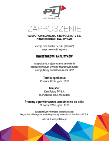 Zaproszenie na spotkanie Zarządu Kino Polska TV S.A. z Inwestorami i Analitykami Zarząd Kino Polska TV S.A. („Spółka”) ma przyjemność zaprosić Inwestorów i Analityków na spotkanie, mające na celu omówienie zaprezentowanych wyników finansowych Spółki oraz jej Grupy Kapitałowej za rok 2012 Termin spotkania: 25 marca 2013 r. godz. 12:00 Miejsce: Kino Polska TV S.A. ul. Puławska 435A, Warszawa Prosimy o potwierdzenie uczestnictwa do dnia: 21 marca 2013 r., godz. 16:00 Szczegółowych informacji o spotkaniu udziela: Magda Kruk - Manager ds. controllingu i relacji inwestorskich Kino Polska TV S.A. [email protected]