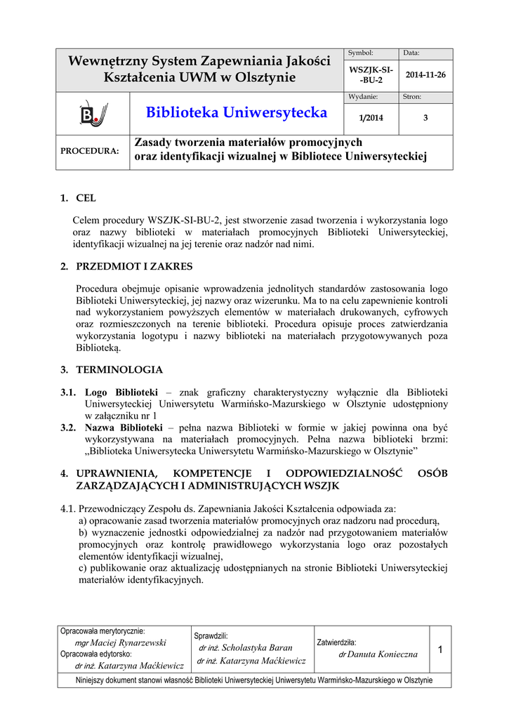 Wewnętrzny System Zapewniania Jakości Kształcenia UWM w Olsztynie Symbol: WSZJK-SI-BU-2 Wydanie: Biblioteka Uniwersytecka PROCEDURA: Data: 2014-11-26 Stron: 1/2014 3 Zasady tworzenia materiałów promocyjnych oraz identyfikacji wizualnej w Bibliotece Uniwersyteckiej 1. CEL Celem procedury WSZJK-SI-BU-2, jest stworzenie zasad tworzenia i wykorzystania logo oraz nazwy biblioteki w materiałach promocyjnych Biblioteki Uniwersyteckiej, identyfikacji wizualnej na jej terenie oraz nadzór nad nimi. 2. PRZEDMIOT I ZAKRES Procedura obejmuje opisanie wprowadzenia jednolitych standardów zastosowania logo Biblioteki Uniwersyteckiej, jej nazwy oraz wizerunku. Ma to na celu zapewnienie kontroli nad wykorzystaniem powyższych elementów w materiałach drukowanych, cyfrowych oraz rozmieszczonych na terenie biblioteki. Procedura opisuje proces zatwierdzania wykorzystania logotypu i nazwy biblioteki na materiałach przygotowywanych poza Biblioteką. 3. TERMINOLOGIA 3.1. Logo Biblioteki – znak graficzny charakterystyczny wyłącznie dla Biblioteki Uniwersyteckiej Uniwersytetu Warmińsko-Mazurskiego w Olsztynie udostępniony w załączniku nr 1 3.2. Nazwa Biblioteki – pełna nazwa Biblioteki w formie w jakiej powinna ona być wykorzystywana na materiałach promocyjnych. Pełna nazwa biblioteki brzmi: „Biblioteka Uniwersytecka Uniwersytetu Warmińsko-Mazurskiego w Olsztynie” 4. UPRAWNIENIA, KOMPETENCJE I ODPOWIEDZIALNOŚĆ ZARZĄDZAJĄCYCH I ADMINISTRUJĄCYCH WSZJK OSÓB 4.1. Przewodniczący Zespołu ds. Zapewniania Jakości Kształcenia odpowiada za: a) opracowanie zasad tworzenia materiałów promocyjnych oraz nadzoru nad procedurą, b) wyznaczenie jednostki odpowiedzialnej za nadzór nad przygotowaniem materiałów promocyjnych oraz kontrolę prawidłowego wykorzystania logo oraz pozostałych elementów identyfikacji wizualnej, c) publikowanie oraz aktualizację udostępnianych na stronie Biblioteki Uniwersyteckiej materiałów identyfikacyjnych. Opracowała merytorycznie: mgr Maciej Rynarzewski Opracowała edytorsko: dr inż. Katarzyna Maćkiewicz Sprawdzili: dr inż. Scholastyka Baran dr inż. Katarzyna Maćkiewicz Zatwierdziła: dr Danuta Konieczna Niniejszy dokument stanowi własność Biblioteki Uniwersyteckiej Uniwersytetu Warmińsko-Mazurskiego w Olsztynie 1 4.2. Kierownik Jednostki Organizacyjnej Biblioteki Uniwersyteckiej (Jednostki Odpowiedzialnej) wyznaczonej do nadzoru nad prawidłowym wykorzystaniem odpowiada za: a) zlecanie realizacji materiałów promocyjnych oraz identyfikacyjnych na wewnętrzne potrzeby Biblioteki, b) nadzór nad kształtem oraz prawidłowym wykorzystaniem logo i nazwy Biblioteki w materiałach realizowanych przez Bibliotekę, d) nadzór nad wykorzystaniem logo i nazwy Biblioteki w materiałach reklamowych przygotowywanych poza Biblioteką, e) wdrożenie rekomendacji Zespołu ds. Zapewniania Jakości Kształcenia, zawartych w rocznym raporcie z badań nad jakością kształcenia i dokumentach pokrewnych. 4.3. Administratorzy stron internetowych Biblioteki odpowiadają za publikowanie na stronach internetowych treści dotyczących realizacji procedury, a udostępnionych przez Zespół ds. Zapewniania Jakości Kształcenia. 5. OPIS POSTĘPOWANIA 5.1. Zespół ds. Zapewniania Jakości Kształcenia przygotowuje pakiet materiałów graficznych wraz z instrukcją ich wykorzystania (załącznik nr 1). 5.2. Administrator strony internetowej Biblioteki Uniwersyteckiej umieszcza pakiet materiałów graficznych wraz z instrukcją ich wykorzystania (załącznik nr 1) w ogólnodostępnym miejscu na stronie internetowej. 5.3. Przewodniczący Zespołu ds. Zapewniania Jakości Kształcenia wyznacza Jednostkę Odpowiedzialną za nadzór nad zachowaniem jednolitych standardów wykorzystania logo i nazwy Biblioteki Uniwersyteckiej. 5.4. Jednostka Odpowiedzialna zlecając przygotowanie materiałów promocyjnych przekazuje osobie realizującej zamówienie pakiet materiałów graficznych wraz z instrukcją ich wykorzystania. 5.5. Wykorzystanie logo i nazwy Biblioteki wymaga zgody Jednostki Odpowiedzialnej oraz skorzystania z plików i instrukcji zawartych w pakiecie pobranym ze strony internetowej Biblioteki. 5.6. Jednostka Odpowiedzialna zachowuje po jednym egzemplarzu materiałów przygotowanych na zlecenie Biblioteki (lub ich reprodukcji) oraz materiałów, które wykorzystywały logo i nazwę biblioteki. Zebrane materiały stają się załącznikiem do raportu podsumowującego działalność Jednostki Odpowiedzialnej w zakresie nadzoru nad wykorzystaniem logo i nazwy Biblioteki. 5.7. Jednostka Odpowiedzialna przekazuje raport podsumowujący swoją działalność Zespołowi ds. Zapewniania Jakości Kształcenia. 5.8. W przypadkach szczególnych Dyrektor Biblioteki może powołać odrębny Zespół Roboczy w celu przygotowania lub nadzoru nad przygotowaniem materiałów reklamowych. Zespół po zakończeniu swojej działalności zobowiązany jest do stworzenia raportu podsumowującego. 5.9. Zespół ds. Zapewniania Jakości Kształcenia opracowuje raport roczny w oparciu o otrzymane materiały i wraz z rekomendacjami przekazuje go na ręce Dyrektora Biblioteki Uniwersyteckiej. 5.10. Procedura uznawana jest za zakończoną w momencie opublikowania raportu rocznego na stronie Biblioteki Uniwersyteckiej. Opracowała merytorycznie: mgr Maciej Rynarzewski Opracowała edytorsko: dr inż. Katarzyna Maćkiewicz Sprawdzili: dr inż. Scholastyka Baran dr inż. Katarzyna Maćkiewicz Zatwierdziła: dr Danuta Konieczna Niniejszy dokument stanowi własność Biblioteki Uniwersyteckiej Uniwersytetu Warmińsko-Mazurskiego w Olsztynie 2 6. DOKUMENTY ZWIĄZANE Z PRZEDMIOTEM I ZAKRESEM PROCEDURY 6.1. Decyzja o wyznaczeniu Jednostki Odpowiedzialnej za nadzór nad procedurą. 6.2. Raport podsumowujący działalność Jednostki Odpowiedzialnej. 6.3. Raport podsumowujący działalność Zespołu Roboczego. 6.4. Raport roczny przygotowany przez Zespół ds. Zapewniania Jakości Kształcenia. 6.5. Decyz