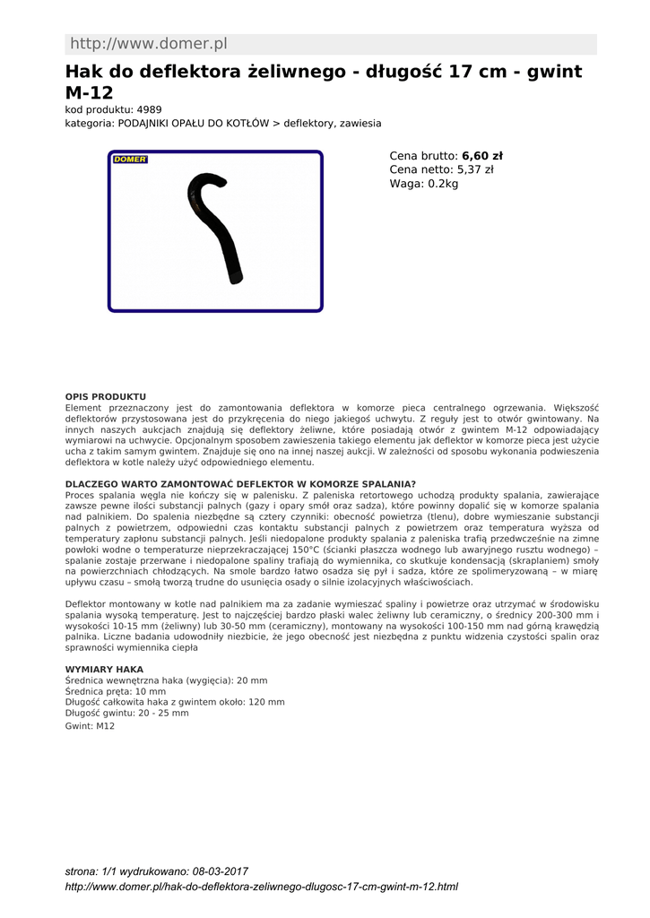http://www.domer.pl Hak do deflektora żeliwnego - długość 17 cm - gwint M-12 kod produktu: 4989 kategoria: PODAJNIKI OPAŁU DO KOTŁÓW > deflektory, zawiesia Cena brutto: 6,60 zł Cena netto: 5,37 zł Waga: 0.2kg OPIS PRODUKTU Element przeznaczony jest do zamontowania deflektora w komorze pieca centralnego ogrzewania. Większość deflektorów przystosowana jest do przykręcenia do niego jakiegoś uchwytu. Z reguły jest to otwór gwintowany. Na innych naszych aukcjach znajdują się deflektory żeliwne, które posiadają otwór z gwintem M-12 odpowiadający wymiarowi na uchwycie. Opcjonalnym sposobem zawieszenia takiego elementu jak deflektor w komorze pieca jest użycie ucha z takim samym gwintem. Znajduje się ono na innej naszej aukcji. W zależności od sposobu wykonania podwieszenia deflektora w kotle należy użyć odpowiedniego elementu. DLACZEGO WARTO ZAMONTOWAĆ DEFLEKTOR W KOMORZE SPALANIA? Proces spalania węgla nie kończy się w palenisku. Z paleniska retortowego uchodzą produkty spalania, zawierające zawsze pewne ilości substancji palnych (gazy i opary smół oraz sadza), które powinny dopalić się w komorze spalania nad palnikiem. Do spalenia niezbędne są cztery czynniki: obecność powietrza (tlenu), dobre wymieszanie substancji palnych z powietrzem, odpowiedni czas kontaktu substancji palnych z powietrzem oraz temperatura wyższa od temperatury zapłonu substancji palnych. Jeśli niedopalone produkty spalania z paleniska trafią przedwcześnie na zimne powłoki wodne o temperaturze nieprzekraczającej 150°C (ścianki płaszcza wodnego lub awaryjnego rusztu wodnego) – spalanie zostaje przerwane i niedopalone spaliny trafiają do wymiennika, co skutkuje kondensacją (skraplaniem) smoły na powierzchniach chłodzących. Na smole bardzo łatwo osadza się pył i sadza, które ze spolimeryzowaną – w miarę upływu czasu – smołą tworzą trudne do usunięcia osady o silnie izolacyjnych właściwościach. Deflektor montowany w kotle nad palnikiem ma za zadanie wymieszać spaliny i powietrze oraz utrzymać w środowisku spalania wysoką temperaturę. Jest to najczęściej bardzo płaski walec żeliwny lub ceramiczny, o średnicy 200-300 mm i wysokości 10-15 mm (żeliwny) lub 30-50 mm (ceramiczny), montowany na wysokości 100-150 mm nad górną krawędzią palnika. Liczne badania udowodniły niezbicie, że jego obecność jest niezbędna z punktu widzenia czystości spalin oraz sprawności wymiennika ciepła WYMIARY HAKA Średnica wewnętrzna haka (wygięcia): 20 mm Średnica pręta: 10 mm Długość całkowita haka z gwintem około: 120 mm Długość gwintu: 20 - 25 mm Gwint: M12 strona: 1/1 wydrukowano: 08-03-2017 http://www.domer.pl/hak-do-deflektora-zeliwnego-dlugosc-17-cm-gwint-m-12.html