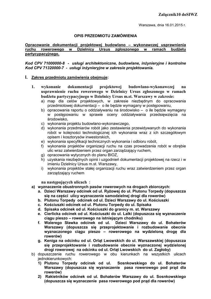 Załącznik10 doSIWZ Warszawa, dnia 16.01.2015 r. OPIS PRZEDMIOTU ZAMÓWIENIA Opracowanie dokumentacji projektowej budowlano – wykonawczej usprawnienia ruchu rowerowego w Dzielnicy Ursus zgłoszonego w ramach budżetu partycypacyjnego, Kod CPV 71000000-8 - usługi architektoniczne, budowlane, inżynieryjne i kontrolne Kod CPV 71320000-7 - usługi inżynieryjne w zakresie projektowania. I. Zakres przedmiotu zamówienia obejmuje: 1. wykonanie dokumentacji projektowej budowlano-wykonawczej na usprawnienie ruchu rowerowego w Dzielnicy Ursus zgłoszonego w ramach budżetu partycypacyjnego w Dzielnicy Ursus m.st. Warszawy w zakresie: a) map dla celów projektowych, w zakresie niezbędnym do opracowania przedmiotowej dokumentacji – o ile będzie wymagany w postępowaniu, b) opracowania raportu o oddziaływaniu na środowisko – o ile będzie wymagany w postępowaniu w sprawie oceny oddziaływania przedsięwzięcia na środowisko, c) wykonania projektu budowlano-wykonawczego, d) wykonania przedmiarów robót jako zestawienia przewidywanych do wykonania robót w kolejności technologicznej ich wykonania wraz z ich szczegółowym opisem i kosztorysów inwestorskich, e) wykonania specyfikacji technicznych wykonania i odbioru robót, f) wykonania projektów organizacji ruchu na czas prowadzenia robót w obrębie ulic wraz zatwierdzeniem przez organ zarządzający ruchem, g) opracowania wytycznych do planu BIOZ, h) uzyskania niezbędnych opinii i uzgodnień dokumentacji projektowej na rzecz i w imieniu Dzielnicy Ursus m.st. Warszawy, i) wykonania projektów stałej organizacji ruchu wraz zatwierdzeniem przez organ zarządzający ruchem na następujących ulicach : a) wyznaczenie obustronnych pasów rowerowych na drogach zbiorczych: a. Dzieci Warszawy odcinek od ul. Ryżowej do ul. Plutonu Torpedy (dopuszcza się na części ulicy wyznaczenie samodzielnej drogi dla rowerów) b. Plutonu Torpedy odcinek od ul. Dzieci Warszawy do ul. Kościuszki c. Kościuszki odcinek od ul. Plutonu Torpedy do ul. Spisaka d. Spisaka odcinek od ul. Kościuszki do granicy m. st. Warszawy e. Cierlicka odcinek od ul. Kościuszki do ul. Lalki (dopuszcza się wyznaczenie ciągu pieszo – rowerowego na istniejącym chodniku) f. Walerego Sławka odcinek od ul. Dzieci Warszawy do ul. Bohaterów Warszawy (dopuszcza się przeprojektowanie i rozbudowanie obecnie wyznaczonego ciągu pieszo – rowerowego na wydzieloną drogę dla rowerów) g. Keniga na odcinku od ul. Orląt Lwowskich do ul. Warszawskiej (dopuszcza się przeprojektowanie i rozbudowanie obecnie wyznaczonej wydzielonej drogi rowerowej na odcinku od ul. Orląt Lwowskich do ul. Zagłoby) b) dopuszczenie ruchu rowerowego w obu kierunkach na wszystkich ulicach jednokierunkowych: 1) Plutonu Torpedy odcinek od ul. Sosnkowskiego do ul. Bohaterów Warszawy (dopuszcza się wyznaczenie pasa rowerowego pod prąd dla rowerów) 2) Rakietników odcinek od ul. Bohaterów Warszawy do ul. Sosnkowskiego (dopuszcza się wyznaczenie pasa rowerowego pod prąd dla rowerów) 3) Cierlicka odcinek od ul. Rynkowej do ul. Plutonu Torpedy (dopuszcza się wyznaczenie pasa rowerowego pod prąd dla rowerów) 4) Braterstwa Broni odcinek od ul. Bohaterów Warszawy do ul. Osieńskiego (dopuszcza się wyznaczenie pasa rowerowego pod prąd dla rowerów) 5) Sosnkowskiego odcinek od ul. Regulskiej do ul. Kościuszki (dopuszcza się wyznaczenie pasa rowerowego pod prąd dla rowerów) 6) Spisaka odcinek od ul. Kościuszki do ul. Regulskiej (dopuszcza się wyznaczenie pasa rowerowego pod prąd dla rowerów) 7) Wiosny Ludów odcinek od ul. Bohaterów Warszawy do ul. Osieńskiego 8) Wiosny Ludów odcinek od ul. Dzieci Warszawy do ul. Opieńskiego 9) Achera odcinek od ul. Rakietników do ul. Plutonu Torpedy (dopuszcza się wyznaczenie pasa rowerowego pod prąd dla rowerów) 10) Orderu Uśmiechu odcinek od ul. Braterstwa Broni do ul. Kościuszki 11) Konińska odcinek od ul.1-go Maja do ul. W. Sławka 12) Adamieckiego odcinek od ul. W. Sławka do ul.1-go Maja 13) Nurzyńska odcinek od ul. 1-go Maja do ul. Obrońców Helu (dopuszcza się przeprojektowanie ulicy na drogę jednokierunkową) 14) Wapowskiego odcinek od ul. Obrońców Helu do ul. Plac 1905 roku 15) Plac 1905 roku odcinek 16) Komunardów odcinek od ul. Wapowskiego do ul. Pużaka 17) Rydzyńska odcinek od ul. Bandurskiego do ul. Legnickiej 18) Zaczarowanej Dorożki odcinek od ul. Bony do ul. Królów Polskich (dopuszcza się możliwość wprowadzenia elementów uspokojenia ruchu) 19) Grabskiego odcinek od ul. Przemysława do ul. W. Kadłubka 20) Laskonogiego odcinek od ul. W. Kadłubka do ul. Orłów Piastowskich (dopuszcza się wyznaczenie pasa rowerowego pod prąd dla rowerów) 21) Czerwona Droga odcinek od ul. Orłów Piastowskich do ul. W. Kadłubka (dopuszcza się wyznaczenie pasa rowerowego pod prąd dla rowerów) 22) Konotopska odcinek od ul. W. Kadłubka do ul. Leszczyńskiego ew. Gierdziejewskiego 23) W. Kadłubka odcinek od ul. Czerwona Droga do ul. Laskonogiego (dopuszcza się wyznaczenie pasa rowerowego pod prąd dla rowerów) 24) Królów Polskich odcinek od ul. Zaczarowanej Dorożki do Barbary Radziwiłłówny (dopuszcza się możliwość wprowadzenia elementów uspokojenia ruchu) 25) Brzechwy odcinek od ul. Sosnkowskiego do ul. Cierlickiej 2. pełnienie nadzoru autorskiego w czasie trwania budowy w zakresie objętym niniejszym opisem bez dodatkowego wynagrodzenia. II. Wymagania dotyczące przygotowania dokumentacji projektowej budowlanowykonawczej: 1. Pozyskanie niezbędnych map do wykonania przedmiotu zamówienia należy do obowiązków projektanta i odbywa się na jego koszt. 2. Przygotowanie wszystkich materiałów niezbędnych do uzyskania decyzji lokalizacji celu publicznego – o ile będzie wymagany w postępowaniu . 3. Dokumentację należy opracować w oparciu o warunki uzyskane od Zamawiającego i od zarządcy dróg tj. Urzędu Dzielnicy Ursus m. st. Warszawy, Zarządu Dróg Miejskich oraz Zarząd Transportu Miejskiego – na