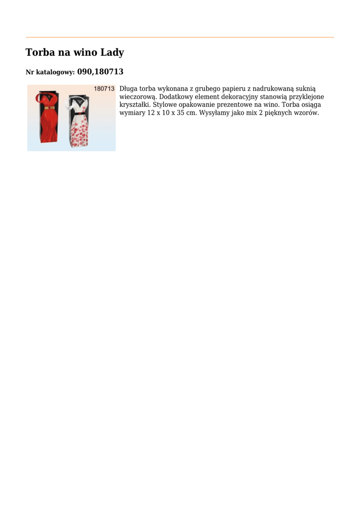 Torba na wino Lady Nr katalogowy: 090,180713 Długa torba wykonana z grubego papieru z nadrukowaną suknią wieczorową. Dodatkowy element dekoracyjny stanowią przyklejone kryształki. Stylowe opakowanie prezentowe na wino. Torba osiąga wymiary 12 x 10 x 35 cm. Wysyłamy jako mix 2 pięknych wzorów.