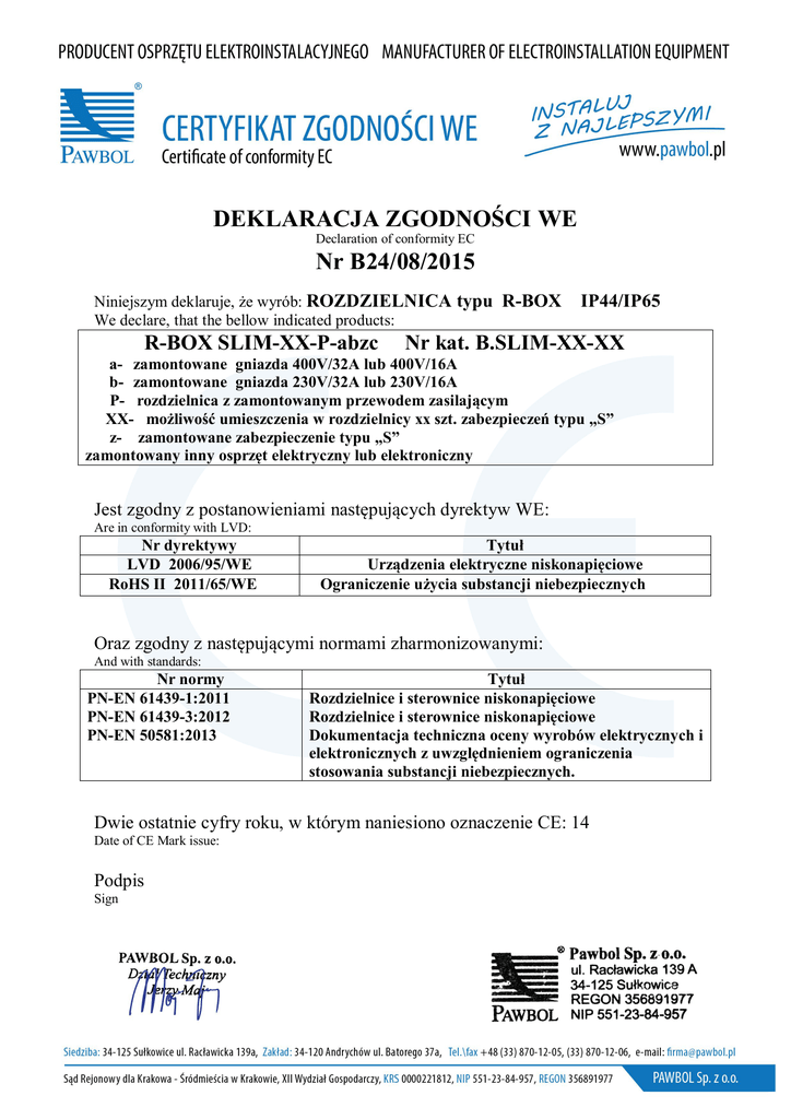 DEKLARACJA ZGODNOŚCI WE Declaration of conformity EC Nr B24/08/2015 Niniejszym deklaruje, że wyrób: ROZDZIELNICA typu R-BOX We declare, that the bellow indicated products: R-BOX SLIM-XX-P-abzc IP44/IP65 Nr kat. B.SLIM-XX-XX a- zamontowane gniazda 400V/32A lub 400V/16A b- zamontowane gniazda 230V/32A lub 230V/16A P- rozdzielnica z zamontowanym przewodem zasilającym XX- możliwość umieszczenia w rozdzielnicy xx szt. zabezpieczeń typu „S” z- zamontowane zabezpieczenie typu „S” zamontowany inny osprzęt elektryczny lub elektroniczny Jest zgodny z postanowieniami następujących dyrektyw WE: Are in conformity with LVD: Nr dyrektywy LVD 2006/95/WE RoHS II 2011/65/WE Tytuł Urządzenia elektryczne niskonapięciowe Ograniczenie użycia substancji niebezpiecznych Oraz zgodny z następującymi normami zharmonizowanymi: And with standards: Nr normy PN-EN 61439-1:2011 PN-EN 61439-3:2012 PN-EN 50581:2013 Tytuł Rozdzielnice i sterownice niskonapięciowe Rozdzielnice i sterownice niskonapięciowe Dokumentacja techniczna oceny wyrobów elektrycznych i elektronicznych z uwzględnieniem ograniczenia stosowania substancji niebezpiecznych. Dwie ostatnie cyfry roku, w którym naniesiono oznaczenie CE: 14 Date of CE Mark issue: Podpis Sign