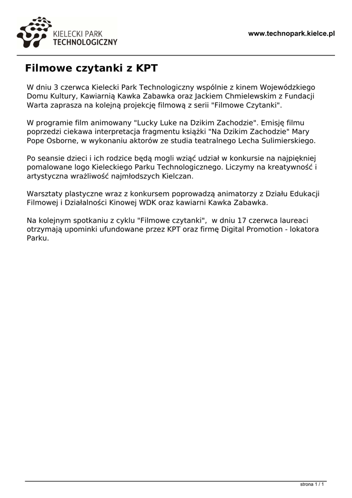 www.technopark.kielce.pl Filmowe czytanki z KPT W dniu 3 czerwca Kielecki Park Technologiczny wspólnie z kinem Wojewódzkiego Domu Kultury, Kawiarnią Kawka Zabawka oraz Jackiem Chmielewskim z Fundacji Warta zaprasza na kolejną projekcję filmową z serii "Filmowe Czytanki". W programie film animowany "Lucky Luke na Dzikim Zachodzie". Emisję filmu poprzedzi ciekawa interpretacja fragmentu książki "Na Dzikim Zachodzie" Mary Pope Osborne, w wykonaniu aktorów ze studia teatralnego Lecha Sulimierskiego. Po seansie dzieci i ich rodzice będą mogli wziąć udział w konkursie na najpiękniej pomalowane logo Kieleckiego Parku Technologicznego. Liczymy na kreatywność i artystyczna wrażliwość najmłodszych Kielczan. Warsztaty plastyczne wraz z konkursem poprowadzą animatorzy z Działu Edukacji Filmowej i Działalności Kinowej WDK oraz kawiarni Kawka Zabawka. Na kolejnym spotkaniu z cyklu "Filmowe czytanki", w dniu 17 czerwca laureaci otrzymają upominki ufundowane przez KPT oraz firmę Digital Promotion - lokatora Parku. strona 1 / 1 Powered by TCPDF (www.tcpdf.org)