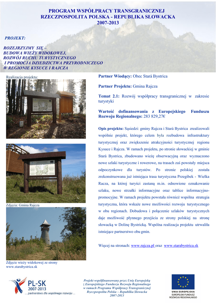 PROGRAM WSPÓŁPRACY TRANSGRANICZNEJ RZECZPOSPOLITA POLSKA - REPUBLIKA SŁOWACKA 2007-2013 PROJEKT: ROZEJRZYJMY SIĘ – BUDOWA WIEŻY WIDOKOWEJ, ROZWÓJ RUCHU TURYSTYCZNEGO I PROMOCJA DZIEDZICTWA PRZYRODNICZEGO W REGIONIE KYSUCE I RAJCZA Realizacja projektu: Partner Wiodący: Obec Stará Bystrica Partner Projektu: Gmina Rajcza Temat 2.1: Rozwój współpracy transgranicznej w zakresie turystyki Wartość dofinansowania z Europejskiego Rozwoju Regionalnego: 283 829,27€ Funduszu Opis projektu: Sąsiedzi: gminy Rajcza i Stará Bystrica zrealizowali wspólnie projekt, którego celem była rozbudowa infrastruktury turystycznej oraz zwiększenie atrakcyjności turystycznej regionu Kysuce i Rajcza. W ramach projektu, po stronie słowackiej w gminie Stará Bystrica, zbudowano wieżę obserwacyjną oraz wyznaczono nowe szlaki turystyczne i rowerowe, na trasach zaś powstały miejsca odpoczynkowe dla turystów. Po stronie polskiej została zrekonstruowana już istniejąca trasa turystyczna Przegibek - Wielka Racza, na której turyści zastaną m.in. odnowione oznakowanie szlaku, nowe strzałki informacyjne oraz tablice informacyjnopromocyjne. W ramach projektu powstała również wspólna strategia Zdjęcia: Gmina Rajcza turystyczna, która wskaże nowe możliwości rozwoju turystycznego w obu regionach. Dobudowa i połączenie szlaków turystycznych daje możliwość płynnego przejścia ze strony polskiej na stronę słowacką w Dolinę Bystricką. Wspólna realizacja projektu utrwaliła istniejące partnerstwo obu gmin. Więcej na stronach: www.rajcza.pl oraz www.starabystrica.sk Zdjęcie wieży widokowej ze strony www.starabystrica.sk Projekt współfinansowany przez Unię Europejską z Europejskiego Funduszu Rozwoju Regionalnego w ramach Programu Współpracy Transgranicznej Rzeczpospolita Polska – Republika Słowacka 2007-2013 PROGRAM CEZHRANIČNEJ SPOLUPRÁCE POL’SKO – SLOVENSKÁ REPUBLIKA 2007-2013 PROJEKT: ROZHĽAĎME SA - VÝSTAVBA ROZHĽADNE, ROZVOJ CESTOVNÉHO RUCHU A PROPAGÁCIA PRÍRODNÉHO DEDIČSTVA V REGIÓNE KYSUCE A RAJCZA Realizácia projektu: Vedúci partner: Obec Stará Bystrica Projektový partner: Obec Rajcza Oblast` podpory 2.1: Rozvoj cezhraničnej spolupráce v oblasti turizmu Hodnota dofinacovania z Európskeho fondu regionálneho rozvoja: 283 829,27 € Popis projektu: Susedia: obce Rajcza a Stará Bystrica spoločne Fotografie: Gmina Rajcza realizovali projekt, ktorého cieľom bolo rozostavenie infraštruktúry pre turizmus a zvýšenie atraktivity regiónu Kysuce a Rajcza. V rámci projektu, po slovenskej strane v obci Stará Bystrica bola postavená rozhľadňa aj vytyčené nové turistické a cyklistické trasy, na cestách vznikli miesta oddýchu pre turistov. Na poľskej strane bol rekonštruovaný už existujúci turistický chodník Przegibek - Wielka Racza, pri ktorom návštevnici nájdu obnovené značkovanie chodníka, nove informačné šípky a informačné a propagačné tabuľky. V rámci projektu vznikla aj spoločná turistická stratégia, ktorá ktorá vytýči nové možnosti turistického vývoja v obidvoch regiónov. Pristavanie a spojenie turistických ciest dáva možnosť plynulého prechodu z poľskej strany na slovenskú stranu v Bystrickú dolinu. Kvôli tomu zväčší sa počet návštevníkov v obidvoch partnerských obciach, a aj v celom regióne, v dôsledku čoho bude sa zvyšovať počet ubytovacích miest a vývine sa infraštruktúra spojená s turizmom, čo ovplyvní aj rozvoj malých a stredných podnikov v obidvoch regiónoch. Spoločná realizácia projektu posilnila existujúce partnerstvo obidvoch obcí. Fotografia rozhľadne zo stránky www. viac na stránkach: www.rajcza.pl; www.starabystrica.sk Fotografia rozhľadne zo stránky: www.starabystrica.sk Projekt spolufinancovaný Európskou úniou z Európskeho fondu regionálneho rozvoja v rámci Programu cezhraničnej spolupráce Poľsko – Slovenská republika 2007-2013