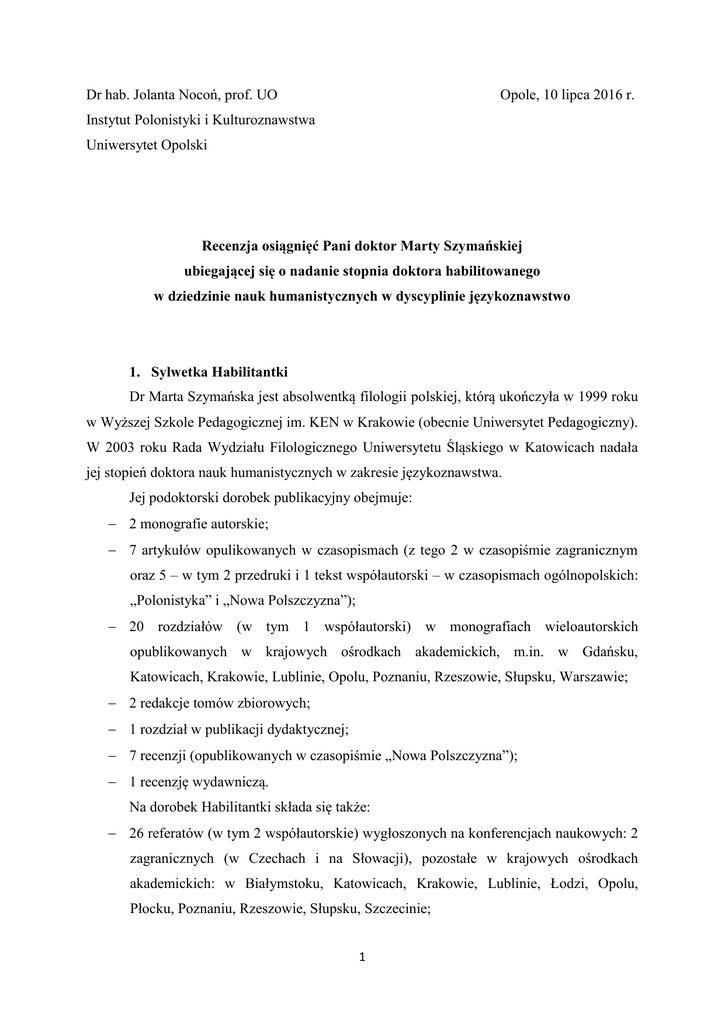 Dr hab. Jolanta Nocoń, prof. UO Opole, 10 lipca 2016 r. Instytut Polonistyki i Kulturoznawstwa Uniwersytet Opolski Recenzja osiągnięć Pani doktor Marty Szymańskiej ubiegającej się o nadanie stopnia doktora habilitowanego w dziedzinie nauk humanistycznych w dyscyplinie językoznawstwo 1. Sylwetka Habilitantki Dr Marta Szymańska jest absolwentką filologii polskiej, którą ukończyła w 1999 roku w Wyższej Szkole Pedagogicznej im. KEN w Krakowie (obecnie Uniwersytet Pedagogiczny). W 2003 roku Rada Wydziału Filologicznego Uniwersytetu Śląskiego w Katowicach nadała jej stopień doktora nauk humanistycznych w zakresie językoznawstwa. Jej podoktorski dorobek publikacyjny obejmuje: 2 monografie autorskie; 7 artykułów opulikowanych w czasopismach (z tego 2 w czasopiśmie zagranicznym oraz 5 – w tym 2 przedruki i 1 tekst współautorski – w czasopismach ogólnopolskich: „Polonistyka” i „Nowa Polszczyzna”); 20 rozdziałów (w tym 1 współautorski) w monografiach wieloautorskich opublikowanych w krajowych ośrodkach akademickich, m.in. w Gdańsku, Katowicach, Krakowie, Lublinie, Opolu, Poznaniu, Rzeszowie, Słupsku, Warszawie; 2 redakcje tomów zbiorowych; 1 rozdział w publikacji dydaktycznej; 7 recenzji (opublikowanych w czasopiśmie „Nowa Polszczyzna”); 1 recenzję wydawniczą. Na dorobek Habilitantki składa się także: 26 referatów (w tym 2 współautorskie) wygłoszonych na konferencjach naukowych: 2 zagranicznych (w Czechach i na Słowacji), pozostałe w krajowych ośrodkach akademickich: w Białymstoku, Katowicach, Krakowie, Lublinie, Łodzi, Opolu, Płocku, Poznaniu, Rzeszowie, Słupsku, Szczecinie; 1 organizacja 4 ogólnopolskich konferencji naukowych z cyklu Jesienna Szkoła Dydaktyków Literatury i Języka Polskiego. Ponadto Habilitantka jest: sekretarzem redakcji czasopisma „Annales Universitatis Paedagogicae Cracoviensis. Studia ad Didacticam Litterarum Polonarum et Linguae Polonae”; członkiem międzynarodowego komitetu redakcyjnego czasopisma LLCE “International Journal on Language, Literature and Culture in Education”. Pod względem ilościowym dorobek naukowy dr Marty Szymańskiej należy uznać za wystarczający do ubiegania się o stopień doktora habilitowanego. Jest on różnorodny, dobrze świadczy o rozwoju naukowym Habilitantki od czasu doktoratu i o jej istotnej aktywności naukowej o zasięgu przede wszystkim krajowym. Co należy podkreślić, jest ona osobą rozpoznawalną i cenioną w środowisku lingwodydaktów, także jako współautorka nowatorskich pod względem koncepcji kształcenia językowego podręczników do języka polskiego z cyklu „To lubię!”. 2. Ocena osiągnięć naukowych w obszarze nauk humanistycznych Główym osiągnięciem naukowym dr Marty Szymańskiej jest książka pt. Między nauką o języku a nauczaniem języka. Koncepcje kształcenia językowego na przełomie XX i XXI wieku (Wydawnictwo Naukowe Uniwersytetu Pedagogicznego, Kraków 2016, ss. 344). Opracowanie to, sytuujące się w obszarze językoznawstwa stosowanego, dotyka niezwykle ważkich problemów szkolnej edukacji językowej w zakresie języka ojczystego, przy tym odwołuje się do teorii lingwistycznych i do dorobku innych nauk (neurobiologii, psycholingwistyki, psychologii itp.). To zaleta publikacji – rozważania Habilitantki zostały mocno osadzone w teorii, co uprawomocnia przedstawioną w książce autorską koncepcję kształcenia językowego nazwaną podejściem komunikacyjno-kognitywnym. Już w tym miejscu podkreślić należy niezwykle bogate doświadczenie lekturowe Habilitantki, o czym świadczy m.in. obszerne zestawienie bibliograficzne, niezamykające się wyłącznie w obszarze lingwistyki i lingwodydaktyk i nie tylko w dorobku polskiej nauki, a także umiejętne wykorzystanie literatury przedmiotu do zbudowania i uzasadnienia własnej teorii. Zdaniem Habilitantki tzw. tradycyjny model kształcenia językowego wymaga zmiany. Argumentów dostarcza jest współczesna rzeczywistość kulturowo-cywilizacyjna, gwałtownie dokonujące się w niej przemiany o charakterze przełomowym i nowe potrzeby uczniów, których szkoła powinna przygotować do życia w tej rzeczywistości (nie negując en-kulturacji jako edukacyjnej powinności szkoły). Autorka stawia zasadną tezę, że w czasach zmiany powinna się zmienić też szkoła. W erze transkulturowości stają przed nią nowe wyzwania, 2 także w obszarze nauczania języka ojczystego, m.in. przeciwdziałanie dehumanizacji świata, uczenie poruszania się w świcie zdominowanym przez obraz i nowe technologie informacyjno-komunikacyjne. Tym samym książka Habilitantki wpisuje się w jakże ważną dla współczesnej szkoły dyskusję nad DOBRĄ edukacją w nowej rzeczywistości kulturowej. Sposób udzielenia odpowiedzi na pytanie, jak powinno wyglądać DOBRE kształcenie językowe w nowych czasach, w pełni przekonuje mnie, że powstanie tej książki było potrzebne i może przynieść wiele pożytku edukacji polonistycznej. Omawiana publikacja wpisuje się w badania nad dyskursem edukacyjnym. Habilitantka przywołuje wąskie i szerokie konceptualizacje tej kategorii, odwołuje się do literatury polskiej i obcojęzycznej, głównie anglosaskiej. Na podstawie tej drugiej omawia spojrzenie na edukację jako narzędzie wpływu na społeczeństwo, sugerując konieczność również takiego ujęcia dyskursu edukacyjnego w koncepcjach wypracowanych przez polskich badaczy. W lingwistyce polskiej ukazały się opracowania poświęcone strefom wpływu w dyskursie edukacyjnym, zob. Agnieszka Rypel, Ideologiczny wymiar dyskursu edukacyjnego na przykładzie podręczników języka polskiego z lat 1918-2010. Poza tym implicytnie ideologia jest uwzględniana w różnych konceptualizacjach dyskursu – wystarczy przywołać van Dijka i jego ujęcie dyskursu jako tekstu w kontekście. To właśnie w kontekście sytuują się ideologie, które dyskurs współkształtują z innymi jego uwarunk