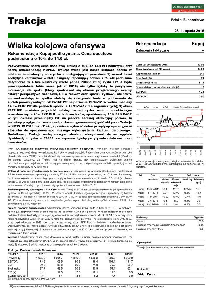 Trakcja Polska, Budownictwo 23 listopada 2015 Rekomendacja Wielka kolejowa ofensywa Kupuj – Zalecenia taktyczne 67.5md zł na budowę/modernizację torów kolejowych. Rząd przyjął we wrześniu plan budowy i modernizacji 8.5 km torów kolejowych opiewający na kwotę 67.5md zł. Plan ten ma być wdrożony do 2023 roku. Szacujemy, że średnio wydatki w ramach tego planu mogłyby teoretycznie wynosić rocznie około 8.5md zł (w okresie 2016E-23E) wobec 4.8md zł w latach 2009-15E. Ale ostatecznie wydatkowanie pieniędzy w ramach tego planu może się okazać mniej proporcjonalne i się np. kumulować w latach 2019-2020. Zaskakująco silny operacyjny CF w 3Q15. Wyniki Trakcji w 3Q15 zaskoczyły pozytywnie dzięki 1) wysokiemu zyskowi brutto na sprzedaży (10.9%), 2) 29% r/r obniżki kosztów ogólnego zarządu i sprzedaży, 3) bardzo solidnemu CF na poziomie 115mn zł, oraz 4) 82% r/r i 74% k/k spadku zadłużenia netto do jedynie 38mn zł. W 4Q15E spodziewamy się słabszych przepływów gotówkowych, choć dług netto spółki na koniec 2015 roku powinien być o 14% niższy r/r. Zmiany prognoz finansowych. Podwyższamy naszą prognozę zysku netto o 88% w 2016E. Co ciekawe, spółka już zagwarantowała sobie sprzedaż na poziomie 1.2md zł i powinna w nadchodzących miesiącach podpisać kolejne kontrakty, pozwalając jej jednocześnie na zwiększenie sprzedaż do ok. PLN1.5md w przyszłym roku i na uzyskanie wyników, jak w 2015 roku. Spodziewamy się, że wyniki Trakcji ustabilizują się w 2017 roku, a jej zyski odbudują w 2018 roku dzięki wyższym wydatkom PKP PLK na budowę i modernizację torów. Oczekujemy też, że Trakcja zacznie wypłacać dywidendy od 2016 roku dzięki zdrowemu poziomowi dochodów i stabilnej pozycji finansowej. Szacujemy, że dywidenda z zysku w 2015 roku powinna być jednak niewielka, nie większa niż 10mn-15mn zł. Wycena. Podwyższamy naszą cenę docelową w wyniki netto 1) zmian naszych prognoz finansowych i 2) wyższych założeń dotyczących CAPEX. Jednocześnie główne ryzyka, które widzimy, to: 1) ryzyko kurczenia się marż, 2) niższe od średnich marże na ostatnio podpisanych kontraktach. Cena docelowa (zł, 12-mies.) 14,00 Kapitalizacja (mln zł) 612 Free float (%) 71 Liczba akcji (mln) 51.4 Średni dzienny obrót (3 mies., akcje) 1,0 EURPLN 4,24 USDPLN 3,96 Buy Hold Sell Under Review / Suspended 14 TP 12 10 WIG Relative 8 6 TRK 4 2 Wykres pokazuje zmianę ceny akcji w stosunku do indeksu WIG. 19/11/2015 indeks WIG zamknął się na poziomie 49 178 punktów. Rek. Data (mm-dd-rr) Cena Performance W dniu 12-mies. absolutny Relatywny wydania rekomend (p.p) acja Kupuj 10-30-2015 10.13 12.70 17.5% 19.6 Kupuj 8-4-2015 9.24 12.00 9.6% 14.7 Kupuj 5-11-2015 10.20 12.00 -9.4% -1.9 Kupuj 2-6-2015 9.3 11.0 9.9% 0.7 Kupuj 11-12-2014 8.9 9.8 4.5% 5.6 Udziałowcy % głosów Comsa 28,8 Fundusz emerytalny Nationale-Nederlanden 9,95 Fundusz emertalny PZU Opis spółki Trakcja jest wykonawcą dróg oraz torów kolejowych. Trakcja: Podsumowanie finansowe mln PLN Przychody EBITDA EBIT Zysk netto P/E (x) EV/EBITDA (x) 2013 1 675.0 73.6 50.5 37.7 n.m. n.m. 2014 1 601.7 109.5 85.8 49.5 12.5 8.4 2015E 1 346.8 90.3 66.3 50.3 12.3 8.3 2016E 1 528.2 96.4 71.8 50.9 12.1 8.2 2017E 1 600.0 101.4 76.2 54.4 11.3 7.7 2018E 1 800.0 111.7 85.7 62.1 9.9 7.0 Oct-15 Jul-15 Apr-15 Oct-14 Jan-15 Jul-14 Apr-14 Jan-14 Oct-13 0 Jul-13 rozpoczął rozdawać długo wyczekiwane kontrakty o dużej wartości. Potencjalna pula kontraktów w tym roku (14md zł do końca YE15) może też okazać się znacznie wyższa niż inwestor oryginalnie zapowiadał (11md zł). To dlatego uważamy, że Trakcja jest na dobrej drodze, aby systematycznie zwiększać poziom zakontraktowanych projektów w nadchodzących miesiącach, co poprawi postrzeganie spółki i zapewni jej wzrost wyników począwszy od w 2018 roku. 12,05 Apr-13 PKP PLK zaskakuje pozytywnie dystrybucją kontraktów kolejowych. PKP PLK (inwestor) nareszcie Cena (zł, 20 listopada 2015) Jan-13 Podwyższamy naszą cenę docelową Trakcji o 10% do 14.0 zł i podtrzymujemy naszą rekomendację KUPUJ. Trakcja wciąż jest naszą ulubioną spółka w sektorze budowlanym, co wynika z następujących powodów: 1) wzrost ilości zdobytych kontraktów w 3Q15 osiągnął imponujący poziom 76% k/k; podpisano dotychczas w 4 kw. kontrakty warte ponad 700mn zł; 2) zyski FY16E będę prawdopodobnie takie same jak w 2015; nie tylko byłaby to pozytywna informacja dla rynku (który spodziewał się okresu przejściowego między “starą” perspektywą finansową UE a “nową” oraz spadku zysków), ale także spowodowałaby, że spółka stałaby się relatywnie tania w porównaniu do spółek porównywalnych (2015-16E P/E na poziomie 12.1x-12.3x wobec mediany 14.3x-13.0x P/E dla polskich spółek, a 15.9x-14.1x dla zagranicznych); 3) okres 2017-18E powinien przynieść solidny wzrost zysku wraz z oczekiwanym wzrostem wydatków PKP PLK na budowę torów; spodziewany 10% EPS CAGR w tym okresie przesunąłby P/E na jeszcze bardziej atrakcyjny poziom, 4) jesteśmy pozytywnie zaskoczeni poziomem generowanej gotówki przez Trakcję w 9M15. W 2016 roku Trakcja powinna wykazać dobre przepływy operacyjne w stosunku do spodziewanego niższego wykorzystania kapitału obrotowego. Dodatkowo, Trakcja może, naszym zdaniem, zdecydować się na wypłatę dywidendy z zysku w 2015E, co zapewne byłoby pozytywnie odebrane przez inwestorów. Oct-12 Rekomendacja Kupuj podtrzymana. Cena docelowa podniesiona o 10% do 14.0 zł. Dział Analiz Adrian Kyrcz Źródło: Dane spółki, szacunki DM BZ WBK Wyłączenie odpowiedzialności: Deklaracje ujawnienia zamieszczone na ostatniej stronie raportu stanowią integralną część tego dokumentu. 8,5 Trakcja 23 listopada 2015 Zmiany w prognozach i wycenie Tab. 1. Trakcja: Zmiany w prognozach mln PLN 2015E Bieżący Poprzedni 1434 Przychody 1347 89 EBITDA 90 65 EBIT 66 50 Zysk netto 50 Zmiana -6% 1% 2% 1% 2016E Bieżący