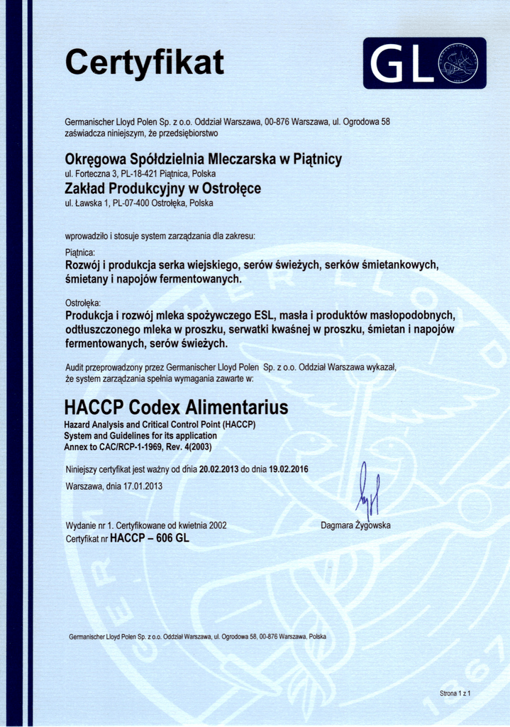 Certyfikat Germanischer zaswiadcza Lloyd Polen Sp. z 0.0. Oddzial Warszawa, 00-876 Warszawa, ul. Ogrodowa 58 niniejszym, ze przedsiebiorstwo Okregowa Spóldzielnia Mleczarska w Piatnicy ul. Forteczna 3, PL-18-421 Piatnica, Polska Zaklad Produkcyjny w Ostrolece ul. lawska '\, PL-07 -400 Ostroleka, Polska wprowadzilo i stosuje system zarzadzania dla zakresu: Piatnica: Rozwój i produkcja serka wiejskiego, serów swiezych, serków smietankowych, smietany i napojów ferm,entowanych. Ostroleka: Produkcja i rozwój mleka spozywczego ESL, masla i produktów maslo podobnych, odtluszczonego mleka w proszku, serwatki kwasnej w proszku, smietan i napojów fermentowanych, serów swiezych. Audit przeprowadzony przez Germanischer Lloyd Polen Sp. z 0.0. Oddzial Warszawa wykazal, ~e system zarzadzania spelnia wymagania zawarte w: HACCP Codex Alimentarius Hazard Analysis and Critical Contro' Point (HACCP) System and Guidelines for its application Annex to CAC/RCP·1·1969, Rev. 4(2003) Niniejszy certyfikat jest wazny od dnia 20.02.2013 do dnia 19.02.2016 Warszawa, dnia 17.01.2013 Wydanie nr 1. Certyfikowane Certyfikat nr od kwietnia 2002 Dagmara Zygowska HACCP - 606 GL Germanischer Lloyd Polen Sp. z 0.0. Oddzial Warszawa, ul. Ogrodowa 58, 00-876 Warszawa, Polska Strona 1 z 1