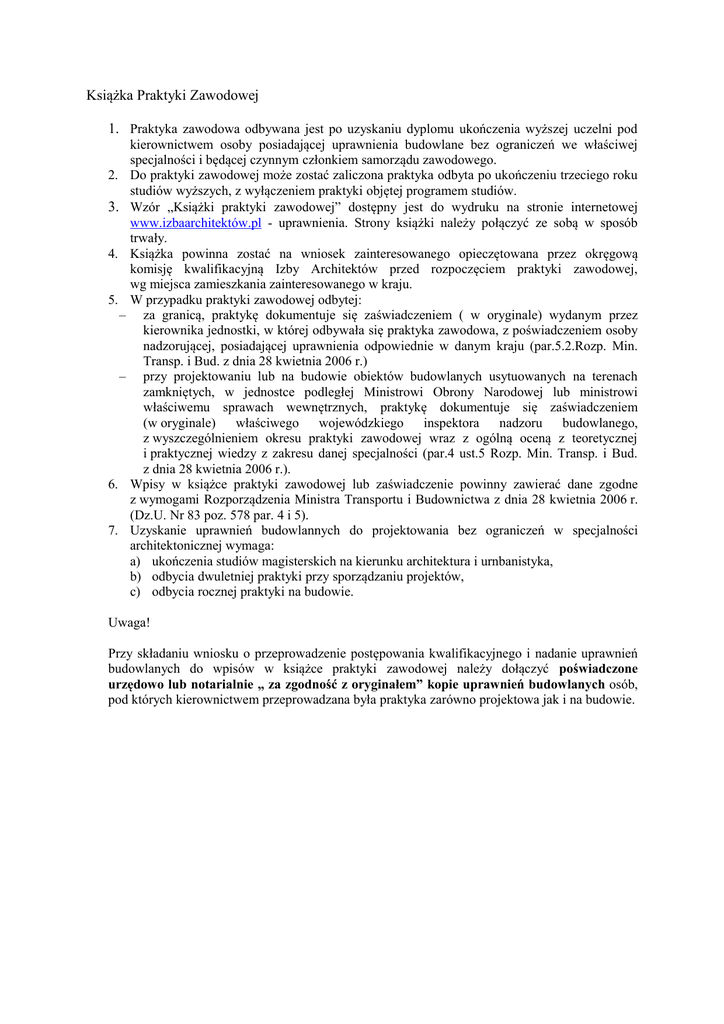 Książka Praktyki Zawodowej 1. Praktyka zawodowa odbywana jest po uzyskaniu dyplomu ukończenia wyższej uczelni pod 2. 3. 4. 5. – – 6. 7. kierownictwem osoby posiadającej uprawnienia budowlane bez ograniczeń we właściwej specjalności i będącej czynnym członkiem samorządu zawodowego. Do praktyki zawodowej może zostać zaliczona praktyka odbyta po ukończeniu trzeciego roku studiów wyższych, z wyłączeniem praktyki objętej programem studiów. Wzór „Książki praktyki zawodowej” dostępny jest do wydruku na stronie internetowej www.izbaarchitektów.pl - uprawnienia. Strony książki należy połączyć ze sobą w sposób trwały. Książka powinna zostać na wniosek zainteresowanego opieczętowana przez okręgową komisję kwalifikacyjną Izby Architektów przed rozpoczęciem praktyki zawodowej, wg miejsca zamieszkania zainteresowanego w kraju. W przypadku praktyki zawodowej odbytej: za granicą, praktykę dokumentuje się zaświadczeniem ( w oryginale) wydanym przez kierownika jednostki, w której odbywała się praktyka zawodowa, z poświadczeniem osoby nadzorującej, posiadającej uprawnienia odpowiednie w danym kraju (par.5.2.Rozp. Min. Transp. i Bud. z dnia 28 kwietnia 2006 r.) przy projektowaniu lub na budowie obiektów budowlanych usytuowanych na terenach zamkniętych, w jednostce podległej Ministrowi Obrony Narodowej lub ministrowi właściwemu sprawach wewnętrznych, praktykę dokumentuje się zaświadczeniem (w oryginale) właściwego wojewódzkiego inspektora nadzoru budowlanego, z wyszczególnieniem okresu praktyki zawodowej wraz z ogólną oceną z teoretycznej i praktycznej wiedzy z zakresu danej specjalności (par.4 ust.5 Rozp. Min. Transp. i Bud. z dnia 28 kwietnia 2006 r.). Wpisy w książce praktyki zawodowej lub zaświadczenie powinny zawierać dane zgodne z wymogami Rozporządzenia Ministra Transportu i Budownictwa z dnia 28 kwietnia 2006 r. (Dz.U. Nr 83 poz. 578 par. 4 i 5). Uzyskanie uprawnień budowlannych do projektowania bez ograniczeń w specjalności architektonicznej wymaga: a) ukończenia studiów magisterskich na kierunku architektura i urnbanistyka, b) odbycia dwuletniej praktyki przy sporządzaniu projektów, c) odbycia rocznej praktyki na budowie. Uwaga! Przy składaniu wniosku o przeprowadzenie postępowania kwalifikacyjnego i nadanie uprawnień budowlanych do wpisów w książce praktyki zawodowej należy dołączyć poświadczone urzędowo lub notarialnie „ za zgodność z oryginałem” kopie uprawnień budowlanych osób, pod których kierownictwem przeprowadzana była praktyka zarówno projektowa jak i na budowie.