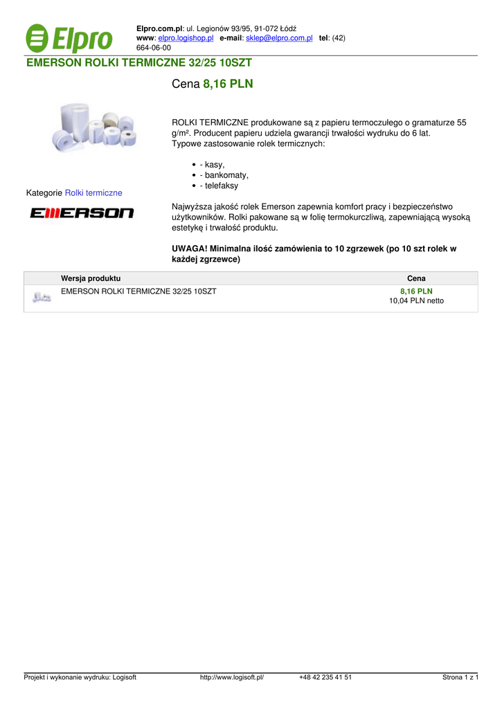 Elpro.com.pl: ul. Legionów 93/95, 91-072 Łódź www: elpro.logishop.pl e-mail: [email protected] tel: (42) 664-06-00 EMERSON ROLKI TERMICZNE 32/25 10SZT Cena 8,16 PLN ROLKI TERMICZNE produkowane są z papieru termoczułego o gramaturze 55 g/m². Producent papieru udziela gwarancji trwałości wydruku do 6 lat. Typowe zastosowanie rolek termicznych: Kategorie Rolki termiczne - kasy, - bankomaty, - telefaksy Najwyższa jakość rolek Emerson zapewnia komfort pracy i bezpieczeństwo użytkowników. Rolki pakowane są w folię termokurczliwą, zapewniającą wysoką estetykę i trwałość produktu. UWAGA! Minimalna ilość zamówienia to 10 zgrzewek (po 10 szt rolek w każdej zgrzewce) Wersja produktu Cena EMERSON ROLKI TERMICZNE 32/25 10SZT Projekt i wykonanie wydruku: Logisoft Powered by TCPDF (www.tcpdf.org) http://www.logisoft.pl/ 8,16 PLN 10,04 PLN netto +48 42 235 41 51 Strona 1 z 1