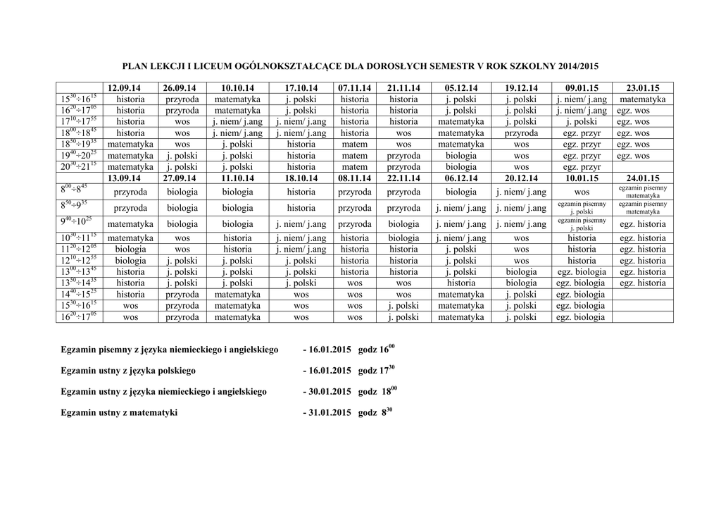 PLAN LEKCJI I LICEUM OGÓLNOKSZTAŁCĄCE DLA DOROSŁYCH SEMESTR V ROK SZKOLNY 2014/2015 1530÷1615 1620÷1705 1710÷1755 1800÷1845 1850÷1935 1940÷2025 2030÷2115 8 ÷8 00 45 850÷935 940÷1025 10 ÷11 1120÷1205 1210÷1255 1300÷1345 1350÷1435 1440÷1525 1530÷1615 1620÷1705 30 15 12.09.14 historia historia historia historia matematyka matematyka matematyka 13.09.14 przyroda 26.09.14 przyroda przyroda wos wos wos j. polski j. polski 27.09.14 biologia 10.10.14 matematyka matematyka j. niem/ j.ang j. niem/ j.ang j. polski j. polski j. polski 11.10.14 biologia 17.10.14 j. polski j. polski j. niem/ j.ang j. niem/ j.ang historia historia historia 18.10.14 historia 07.11.14 historia historia historia historia matem matem matem 08.11.14 przyroda 21.11.14 historia historia historia wos wos przyroda przyroda 22.11.14 przyroda 05.12.14 j. polski j. polski matematyka matematyka matematyka biologia biologia 06.12.14 biologia 19.12.14 j. polski j. polski j. polski przyroda wos wos wos 20.12.14 j. niem/ j.ang 09.01.15 j. niem/ j.ang j. niem/ j.ang j. polski egz. przyr egz. przyr egz. przyr egz. przyr 10.01.15 wos przyroda biologia biologia historia przyroda przyroda j. niem/ j.ang j. niem/ j.ang matematyka matematyka biologia biologia historia historia historia wos wos biologia wos wos j. polski j. polski j. polski przyroda przyroda przyroda biologia historia historia j. polski j. polski j. polski matematyka matematyka matematyka j. niem/ j.ang j. niem/ j.ang j. niem/ j.ang j. polski j. polski j. polski wos wos wos przyroda historia historia historia historia wos wos wos wos biologia biologia historia historia historia wos wos j. polski j. polski j. niem/ j.ang j. niem/ j.ang j. polski j. polski j. polski historia matematyka matematyka matematyka j. niem/ j.ang wos wos wos biologia biologia j. polski j. polski j. polski egzamin pisemny j. polski egzamin pisemny j. polski Egzamin pisemny z języka niemieckiego i angielskiego - 16.01.2015 godz 1600 Egzamin ustny z języka polskiego - 16.01.2015 godz 1730 Egzamin ustny z języka niemieckiego i angielskiego - 30.01.2015 godz 1800 Egzamin ustny z matematyki - 31.01.2015 godz 830 historia historia historia egz. biologia egz. biologia egz. biologia egz. biologia egz. biologia 23.01.15 matematyka egz. wos egz. wos egz. wos egz. wos egz. wos 24.01.15 egzamin pisemny matematyka egzamin pisemny matematyka egz. historia egz. historia egz. historia egz. historia egz. historia egz. historia