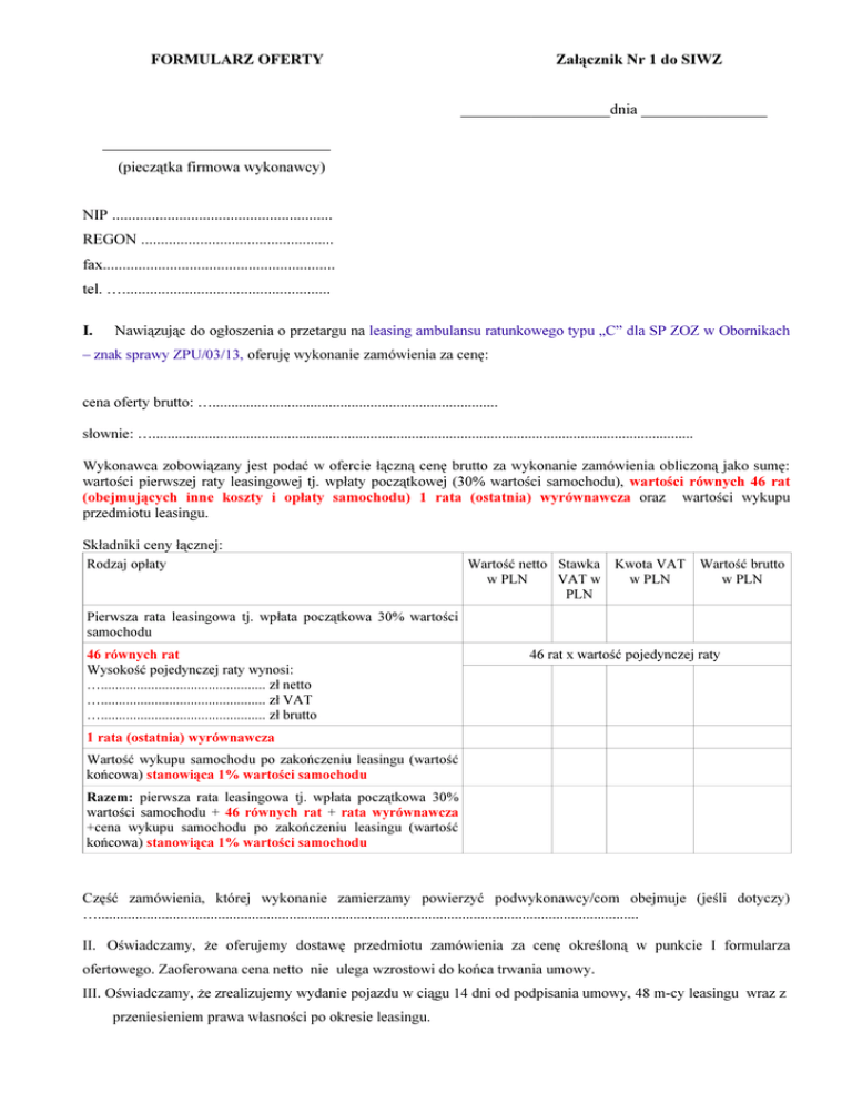 FORMULARZ OFERTY Załącznik Nr 1 do SIWZ ___________________dnia ________________ _____________________________ (pieczątka firmowa wykonawcy) NIP ........................................................ REGON ................................................. fax........................................................... tel. …..................................................... I. Nawiązując do ogłoszenia o przetargu na leasing ambulansu ratunkowego typu „C” dla SP ZOZ w Obornikach – znak sprawy ZPU/03/13, oferuję wykonanie zamówienia za cenę: cena oferty brutto: …............................................................................ słownie: …................................................................................................................................................ Wykonawca zobowiązany jest podać w ofercie łączną cenę brutto za wykonanie zamówienia obliczoną jako sumę: wartości pierwszej raty leasingowej tj. wpłaty początkowej (30% wartości samochodu), wartości równych 46 rat (obejmujących inne koszty i opłaty samochodu) 1 rata (ostatnia) wyrównawcza oraz wartości wykupu przedmiotu leasingu. Składniki ceny łącznej: Rodzaj opłaty Wartość netto Stawka Kwota VAT Wartość brutto w PLN VAT w w PLN w PLN PLN Pierwsza rata leasingowa tj. wpłata początkowa 30% wartości samochodu 46 równych rat Wysokość pojedynczej raty wynosi: ….............................................. zł netto ….............................................. zł VAT ….............................................. zł brutto 46 rat x wartość pojedynczej raty 1 rata (ostatnia) wyrównawcza Wartość wykupu samochodu po zakończeniu leasingu (wartość końcowa) stanowiąca 1% wartości samochodu Razem: pierwsza rata leasingowa tj. wpłata początkowa 30% wartości samochodu + 46 równych rat + rata wyrównawcza +cena wykupu samochodu po zakończeniu leasingu (wartość końcowa) stanowiąca 1% wartości samochodu Część zamówienia, której wykonanie zamierzamy powierzyć podwykonawcy/com obejmuje (jeśli dotyczy) …................................................................................................................................................ II. Oświadczamy, że oferujemy dostawę przedmiotu zamówienia za cenę określoną w punkcie I formularza ofertowego. Zaoferowana cena netto nie ulega wzrostowi do końca trwania umowy. III. Oświadczamy, że zrealizujemy wydanie pojazdu w ciągu 14 dni od podpisania umowy, 48 m-cy leasingu wraz z przeniesieniem prawa własności po okresie leasingu. IV. Oświadczamy, że przyjmujemy warunki gwarancji określone w załączniku Nr 2 do SIWZ: 1) mechaniczna - 24m-ce (bez limitu km) 2) lakier - 36 m-cy 3) perforacja - 144 m-cy V. Oświadczamy, że uważamy się za związanych ofertą przez okres 30 dni od daty otwarcia oferty. VI. Oświadczamy, że zapoznaliśmy się z SIWZ (w tym ze wzorem umowy) i nie wnosimy do niej zastrzeżeń oraz przyjmujemy warunki w niej zawarte. VII. Oświadczamy, że spełniamy wszystkie warunki udziału w postępowaniu zgodnie z wymogami zamawiającego określonymi w SIWZ. VIII. Należę/Należymy Nie należę/Nie należymy do tej samej grupy kapitałowej w rozumieniu ustawy z dn. 16.02.2007r o ochronie konkurencji i konsumentów (Dz. U. Nr 50, poz. 331 ze zm.). ** IX. Osobą upoważnioną do podpisania umowy w sprawie zamówienia publicznego jest …................................................................................... .................................................................. Podpis i pieczątka osoby uprawnionej do reprezentowania firmy ** niewłaściwe skreślić Załącznik nr 3 do SIWZ UMOWA USŁUGI LEASINGU – WZÓR ZPU/03/13 zawarta w dniu …........................... w Obornikach pomiędzy: Samodzielnym Publicznym Zakładem Opieki Zdrowotnej w Obornikach ul. Szpitalna 2 64- 600 Oborniki NIP 787 - 18 - 08 – 424 Regon 000306609 który reprezentuje: 1. mgr Małgorzata Ludzkowska - Dyrektor zwanym w dalszym ciągu umowy „Zamawiającym” (Leasingobiorcą) a........................................................................................................................................................... ........................................................................................................................................................... reprezentowanym przez : zwanym dalej „Wykonawcą” (Leasingodawcą) W rezultacie dokonania przez Zamawiającego wyboru oferty Wykonawcy w drodze przeprowadzonego przetargu nieograniczonego dokonanego na podstawie art. 10 ust.1 oraz art. 39-46 ustawy Pzp zostaje zawarta umowa następującej treści : §1 1. Przedmiotem umowy jest leasing operacyjny 1 sztuki fabryczne nowego ambulansu ratunkowego typu „C” dla SP ZOZ w Obornikach Model................., Marka......................., rok produkcji 2013; będącego pojazdem specjalnym – M1/samochód sanitarny. Okres leasingu 48 m-cy z opcją wykupu. Ambulans musi spełniać zapisy normy PN-EN 1789:2007+A1:2010. 2. Leasingodawca zobowiązuje się dostarczyć przedmiot umowy na własny koszt i ryzyko do Siedziby Leasingobiorcy. 3. Leasingodawca zobowiązany jest zapoznać i przeszkolić personel w zakresie obsługi i eksploatacji pojazdu. §2 Czas trwania umowy 48 miesięcy, licząc od daty przekazania przedmiotu leasingu tj. ambulansu ratunkowego typu „C” potwierdzonego protokołem zdawczo – odbiorczym. §3 1. Leasingodawca (Wykonawca) wyda Leasingobiorcy (Zamawiającemu) samochód w terminie 20 dni od zawarcia umowy. Wydanie samochodu nastąpi w dniach od poniedziałku do piątku, w godzinach 7:30 – 15:00. Samochód należy podstawić do Siedziby Zamawiającego przy ul. Szpitalnej 2 w Obornikach. 2. Samochód przedstawiony do odbioru Leasingobiorcy (Zamawiającego) powinien być: a) dopuszczony do ruchu przez właściwy organ administracji; b) z wykonanym przeglądem zerowym i gwarancją określoną 