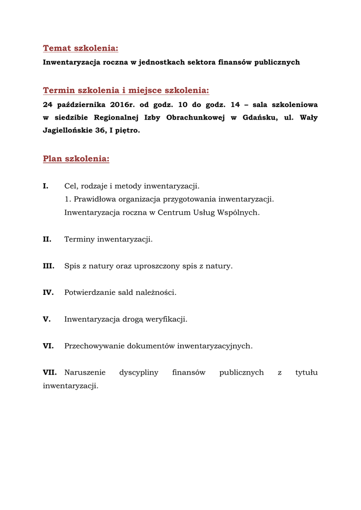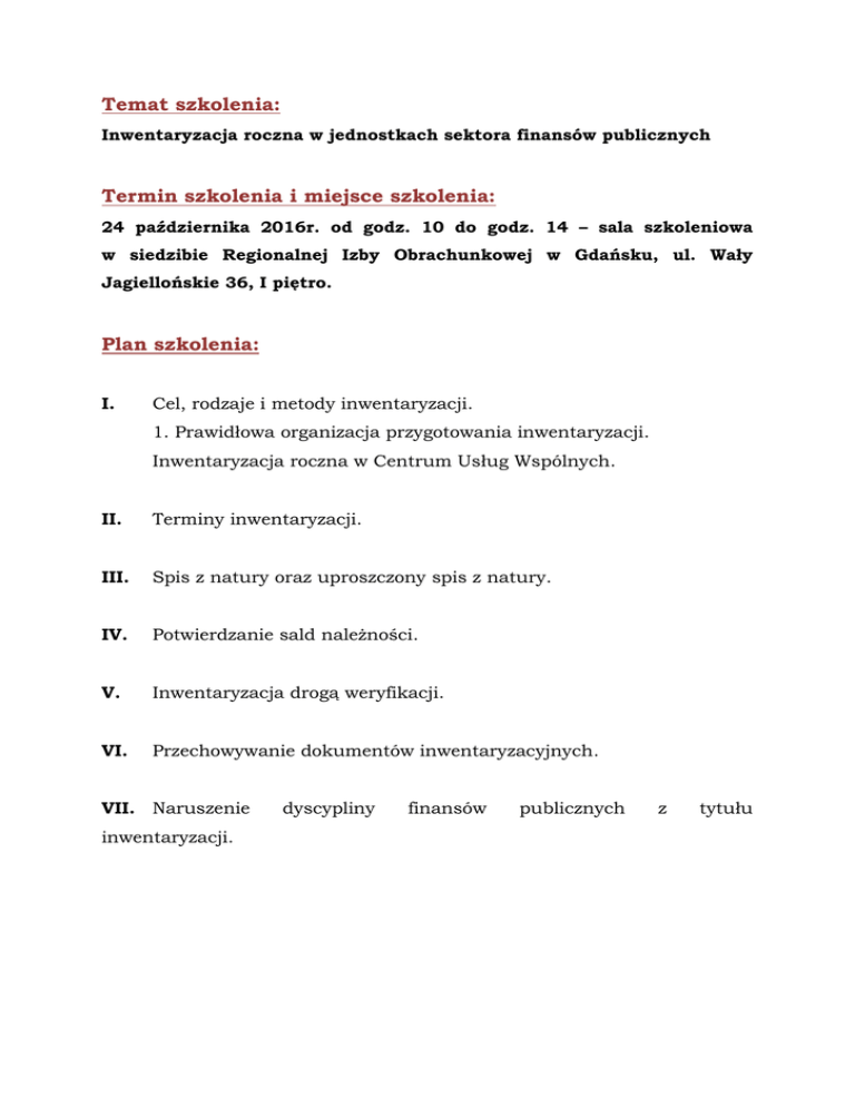 Temat szkolenia: Inwentaryzacja roczna w jednostkach sektora finansów publicznych Termin szkolenia i miejsce szkolenia: 24 października 2016r. od godz. 10 do godz. 14 – sala szkoleniowa w siedzibie Regionalnej Izby Obrachunkowej w Gdańsku, ul. Wały Jagiellońskie 36, I piętro. Plan szkolenia: I. Cel, rodzaje i metody inwentaryzacji. 1. Prawidłowa organizacja przygotowania inwentaryzacji. Inwentaryzacja roczna w Centrum Usług Wspólnych. II. Terminy inwentaryzacji. III. Spis z natury oraz uproszczony spis z natury. IV. Potwierdzanie sald należności. V. Inwentaryzacja drogą weryfikacji. VI. Przechowywanie dokumentów inwentaryzacyjnych. VII. Naruszenie inwentaryzacji. dyscypliny finansów publicznych z tytułu