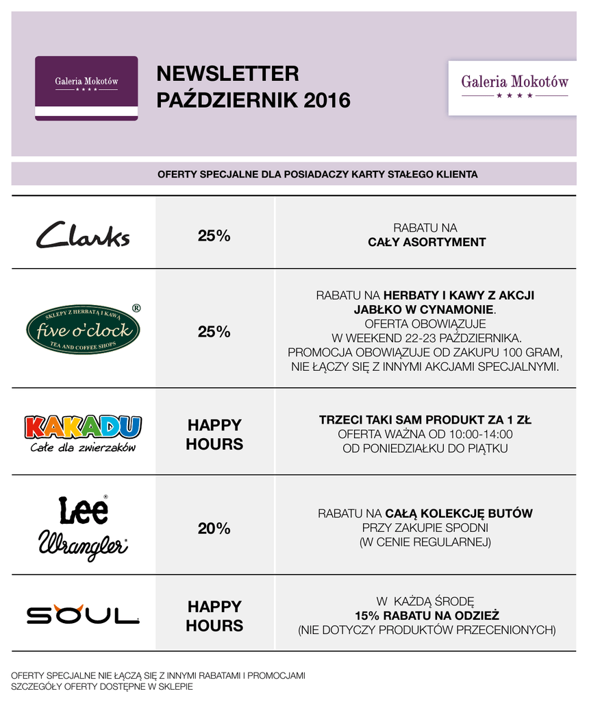 NEWSLETTER PAŹDZIERNIK 2016 OFERTY SPECJALNE DLA POSIADACZY KARTY STAŁEGO KLIENTA 25% RABATU NA CAŁY ASORTYMENT 25% RABATU NA HERBATY I KAWY Z AKCJI JABŁKO W CYNAMONIE. OFERTA OBOWIĄZUJE W WEEKEND 22-23 PAŹDZIERNIKA. PROMOCJA OBOWIĄZUJE OD ZAKUPU 100 GRAM, NIE ŁĄCZY SIĘ Z INNYMI AKCJAMI SPECJALNYMI. HAPPY HOURS TRZECI TAKI SAM PRODUKT ZA 1 ZŁ OFERTA WAŻNA OD 10:00-14:00 OD PONIEDZIAŁKU DO PIĄTKU 20% RABATU NA CAŁĄ KOLEKCJĘ BUTÓW PRZY ZAKUPIE SPODNI (W CENIE REGULARNEJ) HAPPY HOURS W KAŻDĄ ŚRODĘ 15% RABATU NA ODZIEŻ (NIE DOTYCZY PRODUKTÓW PRZECENIONYCH) OFERTY SPECJALNE NIE ŁĄCZĄ SIĘ Z INNYMI RABATAMI I PROMOCJAMI SZCZEGÓŁY OFERTY DOSTĘPNE W SKLEPIE