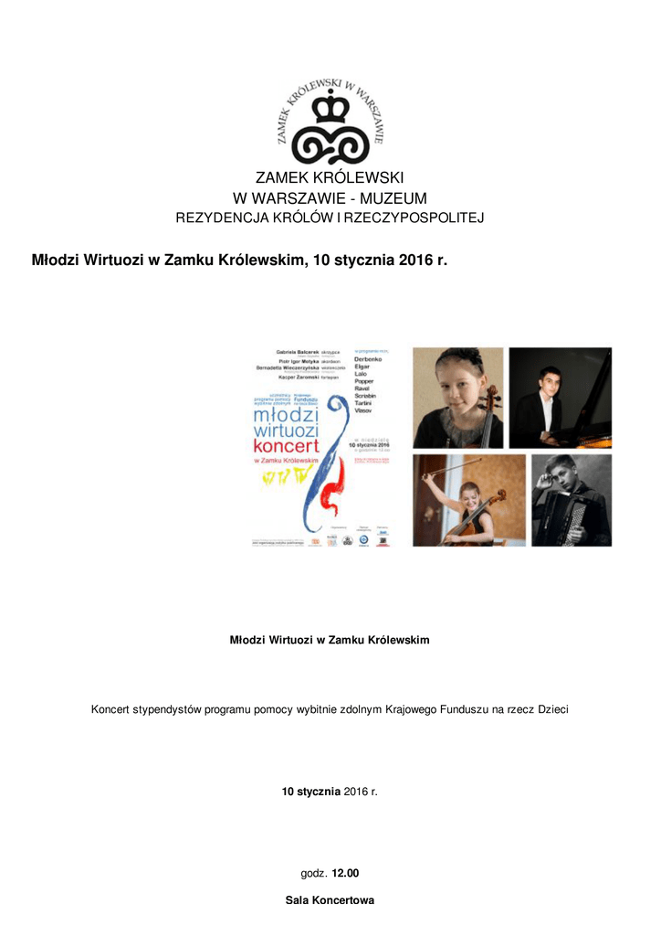ZAMEK KRÓLEWSKI W WARSZAWIE - MUZEUM REZYDENCJA KRÓLÓW I RZECZYPOSPOLITEJ Młodzi Wirtuozi w Zamku Królewskim, 10 stycznia 2016 r. Młodzi Wirtuozi w Zamku Królewskim Koncert stypendystów programu pomocy wybitnie zdolnym Krajowego Funduszu na rzecz Dzieci 10 stycznia 2016 r. godz. 12.00 Sala Koncertowa Sala Koncertowa Wystąpią znakomici instrumentaliści należący do najlepszych muzyków młodego pokolenia w Polsce: 13-letnia skrzypaczka Gabriela Balcerek z Odolanowa. Uczennica Poznańskiej Ogólnokształcącej Szkoły Muzycznej I st. nr 2 im. Tadeusza Szeligowskiego w klasie skrzypiec mgr Kariny Gidaszewskiej. Laureatka m. in.: Ogólnopolskich Przesłuchań Uczniów Szkół Muzycznych I i II st. CEA w Katowicach (I nagroda w 2015), Międzynarodowych Spotkań Młodych Skrzypków im. prof. M. Ławrynowicza w Płocku (II nagroda w 2015), Ogólnopolskiego Konkursu Skrzypcowego w Toruniu (I nagroda w 2015). 15-letni akordeonista Piotr Igor Motyka z Radomia. Uczeń Zespołu Szkół Muzycznych im. Oskara Kolberga w klasie mgr. Artura Miedzińskiego. Laureat m. in.: Słupeckich Spotkań Muzycznych (Grand Prix w 2015), Międzynarodowych Akordeonowych Dni w Pradze (I nagroda w 2015), Międzynarodowego Konkursu Akordeonowego w Klingenthal (I nagroda w 2015). 17-letnia wiolonczelistka Bernadetta Wieczerzyńska ze Zwolenia. Uczennica Ogólnokształcącej Szkoły Muzycznej II st. im. Zenona Brzewskiego w Warszawie w klasie prof. Romana Hoffmanna. Laureatka m. in.: Ogólnopolskiego Młodzieżowego Konkursu Instrumentów Smyczkowych w Elblągu (II nagroda w 2015), Warszawskiego Forum Muzyki Kameralnej (III nagroda i nagroda specjalna w 2015), Turnieju w Trzech Odsłonach w Bydgoszczy (II nagroda w 2015). 16-letni pianista Kacper Żaromski z Rymanowa Zdroju. Uczeń Ogólnokształcącej Szkoły Muzycznej II st. im. Ignacego Jana Paderewskiego w Krośnie w klasie mgr Doroty Skibickiej. Laureat m. in.: Ogólnopolskiego Turnieju Pianistycznego w Żaganiu (II nagroda w 2015), Ogólnopolskiego Forum Młodych Instrumentalistów im. K. i A. Szafranków w Rybniku (II nagroda w 2015), Międzynarodowego Festiwalu „Chopin i kompozytorzy francuscy” w Siedlcach (nagroda główna w 2015). W programie m. in.: Derbencko, Elgar, Lalo, Popper, Ravel, Skriabin, Tartini, Vlasov Serdecznie zapraszamy Krajowy Fundusz na rzecz Dzieci jest stowarzyszeniem społecznym; organizacją pożytku publicznego; KRS0000044710; powstał w 1981 roku; pomaga w rozwoju uczniom szkół ponadgimnazjalnych, gimnazjów i szkół podstawowych o wybitnych uzdolnieniach poznawczych, muzycznych, plastycznych i baletowych oraz stara się o poprawę opieki zdrowotnej nad dziećmi. Szersza informacja o Funduszu dostępna jest na stronie internetowej: www.fundusz.org Zamek Królewski w Warszawie - Muzeum. Rezydencja Królów i Rzeczypospolitej www.zamek-krolewski.pl