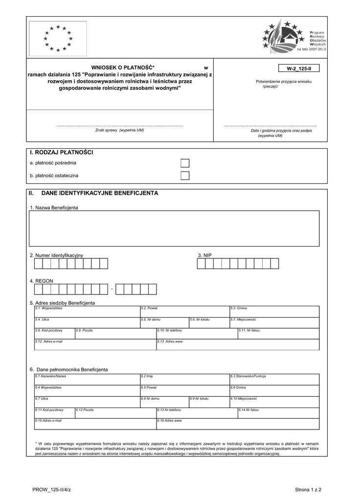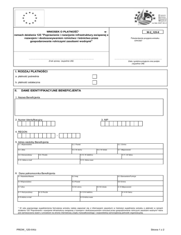 WNIOSEK O PŁATNOŚĆ* w ramach działania 125 "Poprawianie i rozwijanie infrastruktury związanej z rozwojem i dostosowywaniem rolnictwa i leśnictwa przez gospodarowanie rolniczymi zasobami wodnymi" ……………………………………..………..…………………… W-2_125-II Potwierdzenie przyjęcia wniosku /pieczęć/ ……………………………………...…………. Znak sprawy (wypełnia UM) Data i godzina przyjęcia oraz podpis (wypełnia UM) I. RODZAJ PŁATNOŚCI a. płatność pośrednia b. płatność ostateczna II. DANE IDENTYFIKACYJNE BENEFICJENTA 1. Nazwa Beneficjenta 2. Numer Identyfikacyjny 3. NIP 4. REGON – 5. Adres siedziby Beneficjenta 5.1. Województwo 5.2. Powiat 5.4. Ulica 5.5. Nr domu 5.8. Kod pocztowy 5.9. Poczta 5.3. Gmina 5.6. Nr lokalu 5.10. Nr telefonu 5.12. Adres e-mail 5.7. Miejscowość 5.11. Nr faksu 5.13. Adres www 6. Dane pełnomocnika Beneficjenta 6.1 Nazwisko/Nazwa 6.2 Imię 6.3 Stanowisko/Funkcja 6.4 Województwo 6.5 Powiat 6.6 Gmina 6.7 Ulica 6.8 Nr domu 6.11 Kod pocztowy 6.15 Adres e-mail 6.12 Poczta 6.13 Nr telefonu 6.9 Nr lokalu 6.10 Miejscowość 6.14 Nr faksu 6.16 Adres www * W celu poprawnego wypełnienienia formularza wniosku należy zapoznać się z informacjami zawartymi w Instrukcji wypełniania wniosku o płatność w ramach działania 125 "Poprawianie i rozwijanie infrastruktury związanej z rozwojem i dostosowywaniem rolnictwa przez gospodarowanie rolniczymi zasobami wodnymi" która jest zamieszczona razem z wnioskiem na stronie internetowej urzędu marszałkowskiego / wojewódzkiej samorządowej jednostki organizacyjnej. PROW_125-II/4/z Strona 1 z 2 7. Dane osoby uprawnionej do kontaktu 7.2. Imię 7.1. Nazwisko 7.3. Stanowisko/Funkcja 7.4. Województwo 7.5. Powiat 7.7. Ulica 7.8. Nr domu 7.11. Kod pocztowy 7.12. Poczta 7.6. Gmina 7.10. Miejscowość 7.9. Nr lokalu 7.13. Nr telefonu 7.15. Adres e-mail 7.14. Nr faksu 7.16. Adres www III. DANE Z DECYZJI O PRZYZNANIU POMOCY 8. Nazwa Funduszu: Europejski Fundusz Rolny na rzecz Rozwoju Obszarów Wiejskich 9. Tytuł operacji 10. Nr decyzji 11. Data wydania decyzji dzień miesiąc 2 0 rok 12. Kwota pomocy z decyzji przyznana dla całej operacji zł , IV. DANE DOTYCZĄCE WNIOSKU O PŁATNOŚĆ 13. Wniosek za okres: _ _ od dzień 2 miesiąc _ 0 _ do rok dzień miesiąc 2 0 rok 14. Koszty całkowite realizacji danego etapu operacji: , zł , zł , zł , zł 15. Koszty kwalifikowalne realizacji danego etapu operacji: 16. Koszty niekwalifikowalne realizacji danego etapu operacji: 17. Wnioskowana kwota pomocy dla danego etapu operacji: PROW_125-II/4/z Strona 2 z 2