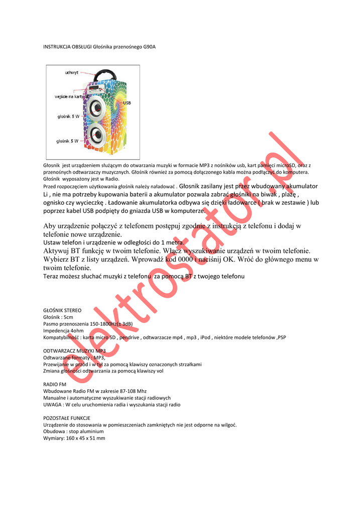 INSTRUKCJA OBSŁUGI Głośnika przenośnego G90A Głosnik jest urządzeniem służącym do otwarzania muzyki w formacie MP3 z nośników usb, kart pamięci microSD, oraz z przenośnych odtwarzaczy muzycznych. Głośnik również za pomocą dołączonego kabla można podłączyć do komputera. Głośnik wyposażony jest w Radio. Przed rozpoczęciem użytkowania głośnik należy naładować . Głosnik zasilany jest przez wbudowany akumulator Li , nie ma potrzeby kupowania baterii a akumulator pozwala zabrać głośniki na biwak , plażę , ognisko czy wycieczkę . Ładowanie akumulatorka odbywa się dzięki ładowarce ( brak w zestawie ) lub poprzez kabel USB podpięty do gniazda USB w komputerze. Aby urządzenie połączyć z telefonem postępuj zgodnie z instrukcją z telefonu i dodaj w telefonie nowe urządzenie. Ustaw telefon i urządzenie w odległości do 1 metra. Aktywuj BT funkcję w twoim telefonie. Włącz wyszukiwanie urządzeń w twoim telefonie. Wybierz BT z listy urządzeń. Wprowadź kod 0000 i naciśnij OK. Wróć do głównego menu w twoim telefonie. Teraz możesz słuchać muzyki z telefonu za pomocą BT z twojego telefonu GŁOŚNIK STEREO Głośnik : 5cm Pasmo przenoszenia 150-1800Hz(± 3dB) Impedencja 4ohm Kompatybilność : karta micro SD , pendrive , odtwarzacze mp4 , mp3 , iPod , niektóre modele telefonów ,PSP ODTWARZACZ MUZYKI MP3 Odtwarzane formaty : MP3, Przewijanie w przód i w tył za pomocą klawiszy oznaczonych strzałkami Zmiana głośności odtwarzania za pomocą klawiszy vol RADIO FM Wbudowane Radio FM w zakresie 87-108 Mhz Manualne i automatyczne wyszukiwanie stacji radiowych UWAGA : W celu uruchomienia radia i wyszukania stacji radio POZOSTAŁE FUNKCJE Urządzenie do stosowania w pomieszczeniach zamkniętych nie jest odporne na wilgoć. Obudowa : stop aluminium Wymiary: 160 x 45 x 51 mm