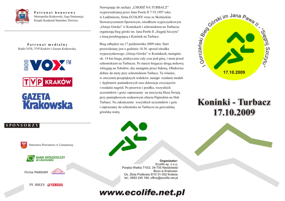 SPONSORZY Starostwo Powiatowe w Limanowej Firma MARKAM Organizator: Ecolife sp. z o.o. Porêba Wielka 710/2, 34-735 NiedŸwiedŸ Biuro w Krakowie: Os. Z³ota Podkowa 9/10 31-352 Kraków tel.; 0693 245 169, [email protected] PS BIKES www.ecolife.net.pl wa II gnij Szczytu” Bieg odbêdzie siê 17 paŸdziernika 2009 roku. Start przewidziany jest o godzinie 10.30 sprzed oœrodka wypoczynkowego „Ostoja Górska” w Koninkach, nastêpnie ok. 14 km biegu, praktycznie ca³y czas pod górê, i meta przed schroniskiem na Turbaczu. Po starcie biegacze drog¹ stokow¹ wbiegaj¹ na Tobo³ów, aby nastêpnie przez Suhorê, Obidowiec dobiec do mety przy schroniskiem Turbacz. Tu wlaœnie, w otoczeniu przepiêknych widoków, nast¹pi rozdanie medali i dyplomów pamiatkowych oraz dekoracja zwyciêzców i rozdanie nagród. Po przerwie i posi³ku, wszystkich uczestników i goœci zapraszamy na uroczyst¹ Mszê Œwiêt¹ przy pami¹tkowym sza³asowym oltarzu Papieskim na Hali Turbacz. Na zakoñczenie wszystkich uczestników i goœc i zapraszamy do schroniska na Turbaczu na gorczañsk¹ góralsk¹ watrê. Jana Pa Siê -” Patronat medialny Radio VOX, TVP Kraków i Gazeta Krakowska. i im k s ór G g Metropolita Krakowski, Jego Eminencja Ksi¹dz Kardyna³ Stanis³aw Dziwisz. orczañski Bi G e I Patronat honorowy Nawi¹zuj¹c do zachêty „CHOD NA TURBACZ” wypowiedzianej przez Jana Paw³a II 7.VI.1997 roku w LudŸmierzu, firma ECOLIFE wraz ze Skotnickim Stowarzyszeniem Sportowym, oœrodkiem wypoczynkowym „Ostoja Górska” w Koninkach i schroniskiem na Turbaczu organizuj¹ bieg górski im. Jana Paw³a II „Siêgnij Szczytu” z tras¹ przebiegaj¹c¹ z Koninek na Turbacz. 17.10.2009 Koninki - Turbacz 17.10.2009