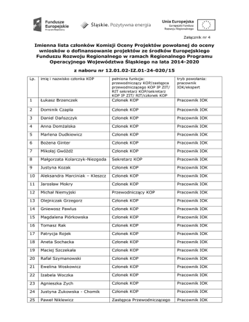 Załącznik nr 4 Imienna lista członków Komisji Oceny Projektów powołanej do oceny wniosków o dofinansowanie projektów ze środków Europejskiego Funduszu Rozwoju Regionalnego w ramach Regionalnego Programu Operacyjnego Województwa Śląskiego na lata 2014-2020 z naboru nr 12.01.02-IZ.01-24-020/15 Lp. imię i nazwisko członka KOP pełniona funkcja: przewodniczący KOP/zastępca przewodniczącego KOP IP ZIT/ RIT sekretarz KOP/sekretarz KOP IP ZIT/ RIT/członek KOP tryb powołania: pracownik IOK/ekspert 1 Łukasz Brzenczek Członek KOP Pracownik IOK 2 Dominik Czapla Członek KOP Pracownik IOK 3 Daniel Dańszczyk Członek KOP Pracownik IOK 4 Anna Domżalska Członek KOP Pracownik IOK 5 Marlena Dudkiewicz Członek KOP Pracownik IOK 6 Bożena Ginter Członek KOP Pracownik IOK 7 Mikołaj Gwóźdź Członek KOP Pracownik IOK 8 Małgorzata Kolarczyk-Niezgoda Sekretarz KOP Pracownik IOK 9 Justyna Kozak Członek KOP Pracownik IOK 10 Aleksandra Marciniak – Kleszcz Członek KOP Pracownik IOK 11 Jarosław Mokry Członek KOP Pracownik IOK 12 Michał Niemyjski Przewodniczący KOP Pracownik IOK 13 Olejniczak Grzegorz Członek KOP Pracownik IOK 14 Gniewosz Pawlus Członek KOP Pracownik IOK 15 Magdalena Piórkowska Członek KOP Pracownik IOK 16 Tomasz Rak Członek KOP Pracownik IOK 17 Patrycja Rojek Członek KOP Pracownik IOK 18 Aneta Sochacka Członek KOP Pracownik IOK 19 Maciej Szczekała Członek KOP Pracownik IOK 20 Rafał Szymanowski Członek KOP Pracownik IOK 21 Ewelina Woskowicz Członek KOP Pracownik IOK 22 Izabela Woczka Członek KOP Pracownik IOK 23 Agnieszka Zych Członek KOP Pracownik IOK 24 Justyna Żukowska - Chomik Członek KOP Pracownik IOK 25 Paweł Niklewicz Zastępca Przewodniczącego Pracownik IOK KOP IP RIT 26 Anita Szymańda - Dowbecka Członek KOP Pracownik IOK 27 Anna Korczyńska Członek KOP Pracownik IOK 28 Karolina Kędzierska Sekretarz KOP IP RIT Pracownik IOK 29 Izabela Michalik Członek KOP Ekspert 30 Anna Pawłowska - Koziar Członek KOP Ekspert 31 Natalia Ślazyk Członek KOP Ekspert 32 Janusz Wójcik Członek KOP Ekspert 33 Monika Zając Członek KOP Ekspert 34 Iwona Żabińska Członek KOP Ekspert