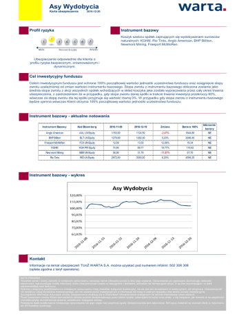 Asy Wydobycia Karta ubezpieczenia 2016-12-20 Profil ryzyka Instrument bazowy Koszyk sześciu spółek zajmujących się wydobywaniem surowców naturalnych: KGHM, Rio Tinto, Anglo American, BHP Billiton, Newmont Mining, Freeport McMoRen. Ubezpieczenie odpowiednie dla klienta o profilu ryzyka bezpiecznym, zrównoważonym i dynamicznym. Cel inwestycyjny funduszu Celem inwestycyjnym funduszu jest ochrona 100% początkowej wartości jednostki uczestnictwa funduszu oraz osiągnięcie stopy zwrotu uzależnionej od zmian wartości instrumentu bazowego. Stopa zwrotu z instrumentu bazowego obliczona zostanie jako średnia stopa zwrotu z akcji wszystkich spółek wchodzących w skład koszyka jaka została wypracowana przez cały okres trwania ubezpieczenia, z zastrzeżeniem że w przypadku, gdy stopa zwrotu danej spółki w trakcie trwania inwestycji przekroczy 60%, wówczas za stopę zwrotu dla tej spółki przyjmuje się wartość równą 0%. W przypadku gdy stopa zwrotu z instrumentu bazowego będzie ujemna wówczas Klient otrzyma 100% początkowej wartości jednostki uczestnictwa funduszu. Instrument bazowy - aktualne notowania Instrument Bazow y Kod Bloomberg 2016-11-08 2016-12-19 Zmiana Bariera 160% Uderzenie bariery Anglo American AAL LN Equity 1153,00 1124,50 -2,47% 1844,80 NIE BHP Billiton BLT LN Equity 1279,00 1282,00 0,23% 2046,40 NIE Freeport McMoRan FCX UN Equity 12,09 13,55 12,08% 19,34 NIE KGHM KGH PW Equity 74,95 89,77 19,77% 119,92 NIE New mont Mining NEM UN Equity 36,06 31,78 -11,87% 57,70 NIE Rio Tinto RIO LN Equity 2872,00 3050,00 6,20% 4595,20 NIE Instrument bazowy - wykres Kontakt Informacje na temat ubezpieczeń TUnŻ WARTA S.A. można uzyskać pod numerem infolinii: 502 308 308 (opłata zgodna z taryf operatora). NOTA PRAWNA Wszelkie opinie i oceny zawarte w niniejszym opracowaniu wyrażają opinie Ubezpieczyciela w dniu jego wydania. Opracowanie prz ygotowano dochowując należytej staranności, wykorzystując źródła informacji, które Ubezpieczyciel uważa za wiarygodne i dokładne, jednakże nie istnieje gwar ancja, iż są one wyczerpujące i w pełni odzwierciedlają stan faktyczny. Wykresy i diagramy przedstawione w niniejszym opracowaniu mają charakter wyłącznie ilustracyjny, nie są one ani doradztwem in westycyjnym, ani prognozą. Ubezpieczyciel nie świadczy usług doradztwa inwestycyjnego, ani nie udziela porad inwestycyjnych a informacje nie mają w żadnym wypadku char akteru porady inwestycyjnej. Szczegółowe informacje dotyczące umowy ubezpieczenia znajdują się w Warunkach Ubezpieczenia dostępnych na stronie internetowe j www.warta.pl. Przed zawarciem umowy Klient samodzielnie określa poziom akceptowalnego przez siebie ryzyka, potencjalne korzyści oraz straty z nią związane, jak również w szczególności charakterystykę, konsekwencje prawne, podatkowe i księgowe umowy. Powielanie bądź publikowanie niniejszego opracowania lub jego części bez pisemnej zgody Ubezpieczyciela jest zabronione. Nini ejszy materiał nie stanowi oferty w rozumieniu art. 66 Kodeksu cywilnego.