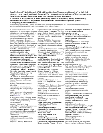 Zespół „Ruczaj" Koła Gospodyń Wiejskich - Ośrodka „Nowoczesna Gospodyni" w Kobylnicy pierwszy raz wystąpił publicznie 8 marca 1974 roku podczas obchodzonego Międzynarodowego Dnia Kobiet. Później śpiewające panie zaprezentowały się na dożynkach w Pobłociu, a przygotowała je do tej prezentacji dyrektor miejscowej Szkoły Podstawowej, Antonina Buraczewska. Na pianinie akompaniowała ówczesna nauczycielka śpiewu w Kobylnicy, Grażyna Hanulak. Za największy sukces zespół „Ruczaj" poczytuje sobie zdobycie trzeciego miejsca na I Krajowym Przeglądzie Zespołów Artystycznych Kół Gospodyń Wiejskich w listopadzie 1985 roku w Kielcach W kronice skrzętnie odnotowano, że w październiku 2002 roku na jej miejsce Więźniów Politycznych. Brał udział w tego samego, to jest 1974 roku zespół ten wybrano Teresę Żyszkowską. Nie tylko wieczerzach opłatkowych zajął pierwsze miejsce na dożynkach w same wokalistki doceniły ogromny wkład organizowanych Człuchowie, gdzie... "wręczył wieniec Cz. Bubnowskiej w rozwój zespołu. Od dla osób samotnych, w świętach towarzyszowi Pieńkowskiemu, a ten 1980 roku była ona członkiem Rady strażackich. Wykonywał kolędy oraz zawiózł go towarzyszowi Gierkowi". Nadzorczej pieśni religijne w kościołach i Kolejny ważny etap w dziejach Gminnej Spółdzielni "Samopomoc kaplicach. śpiewającej grupy pań, to przejęcie w Chłopska" w Słupsku, w lipcu 1982 Utwory wykonywane przez zespół marcu 1997 roku patronatu nad zespołem roku postanowieniem Wojewódzkiej emitowały rozgłośnie radiowe, o przez Spółdzielnię Kółek Rolniczych w Rady Narodowej została nagrodzona osiągnięciach Kobylnicy. Nadmiar obowiązków nie odznaką "Ruczaju" pisała prasa ogólnopolska, pozwalał A. Buraczewskiej "Za zasługi dla Województwa Słupskiego.regionalna i gminna. na kontynuację prób, dlatego W 1984 roku uhonorowano ją Stroje zespołu, podobnie jak repertuar w październiku 1983 roku "Medalem 40-lecia Polski Ludowej". W i skład personalny, zmieniały się. zaproponowała opiekę nad zespołem marcu 1985 roku Minister Kultury i Wokalistki Kazimierzowi Herdzie ze Słupsk . Jako Sztuki przyznał Czesławie najpierw występowały w czarnych, instruktor muzyczny nie tylko ćwiczył Bubnowskiej długich spódnicach oraz białych śpiew chóru, ale jednocześnie medal "Zasłużony Działacz Kultury", bluzkach. Od października 1985 roku akompaniował mu na akordeonie. zaś uchwałą Rady Państwa z 17 zaczęły używać bluzek z haftem Ponieważ próby zespołu odbywały się maja 1989 roku otrzymała ona "Złoty kurpiowskim w Ośrodku "Nowoczesna Gospodyni" Krzyż Zasługi" za... "wyróżniającą się czarno-czerwonym, które mieszczącym się na piętrze budynku pracę w instytucjach i placówkach były ich własnym dziełem. Od kwietnia nad sklepem spożywczym G.S. upowszechniania 1986 roku prezentowały się w stroju "Samopomoc Chłopska" przy ulicy kulturyę. Odznakę "Zasłużony kaszubskim. Pokazywały się w Głównej w Kobylnicy, opodal rzeczki Działacz Kultury" w 1994 roku czerwonych otrzymała również Zofia Urban. spódnicach z czarnymi koronkami "Kamionki", zdecydowano się Zespół odnosił wiele sukcesów, ale za oraz białych bluzkach i czarnych przyjąć nazwę "Ruczaj” największy poczytuje sobie zdobycie kamizelkach z haftem o motywach r W zasadzie od początku śpiewające trzeciego kaszubskich. panie nazywano raz zespołem, a raz miejsca na odbywającym się w W sierpniu 2002 roku zakupiono chórem. Nie miało to większego dniach 22-24 listopada 1985 roku w bursztynowe korale. Panie zaczęły znaczenia, Kielcach nosić barwne spódnice w kwiaty bo przez chór rozumie się zespół pod hasłem "Wsi, Regionowi, Ojczyźnie" z przewagą kolorów czerwonego i śpiewaków I Krajowym Przeglądzie Zespołów zielonego. wykonujących utwór muzyczny Artystycznych Kół Gospodyń WiejW repertuarze oprócz pieśni jednogłosowy albo wielogłosowy a skich. "Ruczaj" w wielokrotnie polskich zespół ma również pieśni capella reprezentował ludowe bądź w towarzystwie instrumentów. gminę Kobylnica na konkursach rosyjskie i ukraiński?. Po wydarzeniach "Ruczaj" śpiewał a capella, i miał śpiewaczych zespołów ludowych sierpniowych 1980 roku repertuar instrumentalistę. zespołu uległ zasadniczej W pierwszych dniach 1993 roku zespół szczebla transformacji. W kronice z 1985 przeniósł się do pomieszczeń Gminnego wojewódzkiego, regionalnego i powiatowego. roku już nie wymienia się pieśni Ośrodka Kultury w Kobylnicy Umilał uroczystości organizowane rosyjskich zlokalizowanego w Słupska z okazji "Święta i ukraińskich, lecz: ludowe, przy ulicy Głównej 1. Teraz dożynkowe, piosenki wojskowe, kolędy tutaj nadal raz w tygodniu kontynuowane Ludowego". Popisywał się na gminnych oraz utwory słowno-muzyczne. były próby, a zatrudniony od maja dożynkach, festynach, obchodach Obecnie "Ruczaj" wykonuje również 1999 roku Zbigniew Jelonek zaczął pieśni religijne. Na akademiach wspierać wokalistki i Kazimierza Herdę Międzynarodowego Dnia Kobiet, Dnia kombatanckich "Międzynarodówkę" grą na elektronicznych instrumentach Matki, Dnia Seniora, świąt zastąpiły "Legiony". klawiszowych narodowych, Skład personalny zespołu w i strunowych. Po rezygnacji rocznicach organizowanych poszczególnych wieloletniej przewodniczącej Koła przez Związek Bojowników o Wolność okresach jego istnienia Gospodyń i Demokrację, Związek Kombatantów był zróżnicowany tak pod względem Wiejskich Czesławy Bubnowskiej Rzeczypospolitej Polskiej i Byłych liczbowym, jak i wiekowym. Śpiewały w nim jednak zawsze panie. Obecnie są to: Czesława Bubnowska, Czesława Grygier, Teresa Żyszkowska, Krystyna Kulczyk, Jadwiga Kalska, Cecylia Dolata, Leokadia Harasimiuk, Kazimiera Gaj, Lucyna Konkołowicz, Małgorzata Kucharska, Czesława Kozaczuk i Iwona Kochańska. W przeszłości wokalistkami "Ruczaju" były: Luc