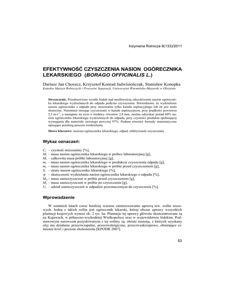 Inżynieria Rolnicza 8(133)/2011 EFEKTYWNOŚĆ CZYSZCZENIA NASION OGÓRECZNIKA LEKARSKIEGO (BORAGO OFFICINALIS L.) Dariusz Jan Choszcz, Krzysztof Konrad Jadwisieńczak, Stanisław Konopka Katedra Maszyn Roboczych i Procesów Separacji, Uniwersytet Warmińsko-Mazurski w Olsztynie Streszczenie. Przedstawiono wyniki badań nad możliwością odzyskiwania nasion ogórecznika lekarskiego wydzielanych do odpadu podczas czyszczenia. Stwierdzono, że wydzielenie nasion ogórecznika z odpadu przy stosowaniu tylko kanału aspiracyjnego lub sit jest mało skuteczne. Natomiast stosując czyszczenie w kanale aspiracyjnym, przy prędkości powietrza 5,5 m⋅s-1, a następnie na sicie o średnicy otworów 2,8 mm, można odzyskać ponad 60% nasion ogórecznika lekarskiego wydzielonych do odpadu, przy czystości produktu spełniającej wymagania dla materiału siewnego powyżej 97%. Podano również formuły matematyczne opisujące przebieg procesu rozdzielania. Słowa kluczowe: nasiona ogórecznika lekarskiego, odpad, efektywność czyszczenia Wykaz oznaczeń: Ci – czystość mieszaniny [%], Mi – masa nasion ogórecznika lekarskiego w próbce laboratoryjnej [g], Mc – całkowita masa próbki laboratoryjnej [g], mi – masa nasion ogórecznika lekarskiego w produkcie czyszczenia odpadu [g], mc – masa nasion ogórecznika lekarskiego w próbie przed czyszczeniem [g], Si – straty nasion ogórecznika lekarskiego [%], η – skuteczność wydzielania nasion ogórecznika lekarskiego z odpadu [%], Mzc – masa zanieczyszczeń w próbie przed czyszczeniem [g], Mz – masa zanieczyszczeń w próbie po czyszczeniu [g], Uz – udział zanieczyszczeń w odpadzie przeznaczonym do czyszczenia [%]. Wprowadzenie W ostatnich latach coraz bardziej wzrasta zainteresowanie uprawą tzw. roślin niszowych. Jedną z takich roślin jest ogórecznik lekarski, której obszar uprawy wszystkich plantacji krajowych wynosi ok. 2 tys. ha. Plantacje tej uprawy głównie skoncentrowane są na Kujawach, w północno-wschodniej Wielkopolsce oraz w województwie łódzkim. Podstawowym surowcem pozyskiwanym z tej rośliny są: oleiste nasiona, z których uzyskany olej ma działanie przeciwzapalne, przeciwalergiczne, przeciwzakrzepowe, obniżające ciśnienie krwi i poziom cholesterolu [KPODR 2007]. 53 Dariusz Jan Choszcz, Krzysztof Konrad Jadwisieńczak, Stanisław Konopka Nasiona tego gatunku dojrzewają na przełomie lipca i sierpnia, a zbierane są dwufazowo, co sprzyja powstawaniu znaczących strat. Straty powstają podczas wszystkich operacji jednostkowych związanych z produkcją nasion ogórecznika lekarskiego, a największe występują podczas zbioru i czyszczenia. Tylko w operacji czyszczenia udział nasion wydzielanych do odpadu szacowany jest na 20÷30% ogólnego plonu. Cel pracy Celem pracy było określenie możliwości odzyskiwania nasion ogórecznika lekarskiego wydzielanych do odpadu podczas operacji czyszczenia. Metodyka badań Materiał pobrano z odpadu procesu czyszczeniu nasion ogórecznika lekarskiego w czyszczalni Petkus K-530, w której stosowano sito górne o średnicy otworów 4,5 mm i sito dolne z otworami prostokątnymi o szerokości wynoszącej 1,5 mm. Próbki o masie 100g pobierano losowo przez 4,5 h, co 0,5 h. Następnie 10 próbek rozdzielono manualnie na nasiona gatunku podstawowego oraz zanieczyszczenia i obliczono czystość mieszaniny (udział nasion ogórecznika lekarskiego w odpadzie) z zależności (1): Ci = Mi ⋅ 100 [%] Mc (1) Badania związane z ustaleniem możliwości odzyskiwania nasion z odpadu czyszczenia realizowano w Laboratorium Procesów Separacji UWM w Olsztynie. Doświadczenia prowadzono na laboratoryjnym klasyfikatorze pneumatycznym K-293 oraz przesiewaczu sitowym K-294, w którym montowano tylko jedno sito. Do tego celu wykorzystano mieszaninę sporządzoną z partii stanowiącej odpad czyszczenia, przygotowując próbki o masie 0,5 kg. Eksperyment na wyżej wymienionych urządzeniach realizowano w trzech wariantach, czyszcząc mieszaninę: tylko w strumieniu powietrza, tylko na sicie, najpierw w kanale aspiracyjnym, a następnie na sicie. Po przeprowadzeniu doświadczeń wstępnych ustalono zakres zmian stosowanych parametrów. Wyznaczono je w taki sposób, że ich zmienność ograniczona była z jednej strony tym, że cały materiał pobrany do badań wydzielany był do odpadu, z drugiej zaś –cały materiał wydzielany był do produktu. Pomiary przeprowadzono przy następujących parametrach: – prędkość strumienia powietrza w kanale klasyfikatora pneumatycznego (V): 4,40; 4,95; 5,50; 6,05 i 6,60 m⋅s-1, – szerokość otworów sit (≠): 1,8 do 2,4 mm, zmieniana co 0,1 mm, – średnica otworów sit (φ): od 2,5 do 3,1 mm, zmieniana co 0,1 mm. 54 Efektywność czyszczenia nasion ... Doświadczenia wykonano dla wymienionych parametrów w trzech powtórzeniach, natomiast w trzecim wariancie – dla wszystkich możliwych ich kombinacji. Po przeprowadzeniu doświadczeń obliczono czystość mieszaniny zgodnie z zależnością (1), uwzględniając, że całkowita masa próbki Mc = 500 g. Natomiast straty nasion gatunku podstawowego obliczono ze wzoru (2): Si = mc − mi ⋅ 100 mc [%] (2) Skuteczność wydzielania zanieczyszczeń z odpadu wyznaczono z zależności (3): η= M zc − M z ⋅100 M zc [%] (3) gdzie: M zc = M c ⋅ U z [g] (4) Uzyskane wyniki opracowano statystycznie, przy wykorzystaniu pakietów programów statystycznych, STATISTICA PL oraz WINSTAT stosując analizę regresji z krokową procedurą eliminacji zmiennych [Luszniewicz 2008; Mikołajczak 2001]. Wyniki badań i ich analiza Udział nasion ogórecznika w odpadzie procesu czyszczenia wynosił 34,6%. Należy zaznaczyć, że w odpadzie znajdowały się nasiona najbardziej dorodne, tzn. o największej wartości zarówno reprodukcyjnej jak i konsumpcyjnej. Wyniki badań nad możliwością odzyskiwania nasion ogórecznika lekarskiego z odpadu czyszczenia podano w tabeli 1, oraz przedstawiono graficznie na 