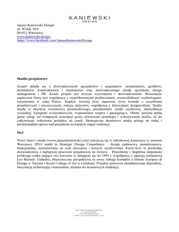 Janusz Kaniewski Design ul. Widok 10/8 00-023 Warszawa www.kaniewski.design https://www.facebook.com/JanuszKaniewskiDesign Studio projektowe Zespół składa się z doświadczonych specjalistów i pasjonatów: projektantów, grafików, architektów, konstruktorów i ilustratorów oraz doświadczonego działu sprzedaży, design management i PR. Każdy projekt jest nowym wyzwaniem i doświadczeniem. Bezcennym zapleczem firmy jest współpraca z wypróbowanymi producentami, rzemieślnikami, technologami, inżynierami w całej Polsce. Dopływ świeżej krwi zapewnia żywy kontakt z uczelniami projektowymi i artystycznymi, rotacja stażystów, współpraca z festiwalami designerskimi. Studio działa w obszarze wzornictwa przemysłowego, przedmiotów sztuki użytkowej, identyfikacji wizualnej, kampanii wizerunkowych, wyposażenia wnętrz i packaging-u. Oferta zawiera pełną gamę usług: od wstępnych koncepcji przez stworzenie prototypu i wykonywanie testów, aż do całkowitego wdrożenia produktu na rynek. Strategiczne doradztwo studia polega na stałej i profesjonalnej opiece nad projektem na każdym etapie realizacji. Styl Nowe biuro i studio (www.januszkaniewski.com) mieszczą się w zabytkowej kamienicy w centrum Warszawy. DNA marki to Strategic Design Consultancy – design zadaniowy, ponadczasowy, funkcjonalny, zorientowany na zysk inwestora i korzyść użytkownika. Know-how to pochodna doświadczenia z najlepszej pracowni projektowej na świecie – Pininfariny i dogłębna znajomość polskiego rynku mająca swe korzenie w datującej się od 1995 r. współpracy z agencją reklamową Leo Burnett. Unikalna, futurystyczna perspektywa to owoc stałego kontaktu z Istituto Europeo di Design w Turynie i Royal College of Art w Londynie. Projekty pracowni charakteryzuje dojrzałość, fascynacja technologią i materiałem, dystans do sezonowych tendencji. Fundator Janusz Kaniewski, ur. 1974, projektant form przemysłowych, absolwent Transportation Design w Istituto Europeo di Design w Turynie; założył pracownię designu, architektury, wizerunku i projektowania strategicznego dla firm i osób prywatnych; był doradcą samorządów miast; wykładowcą uczelni krajowych i zagranicznych. Kurator i współorganizator festiwalu Gdynia Design Days 2012, w czołówce rankingów najbardziej kreatywnych (Brief) i innowacyjnych (Forbes) osób w Polsce. Pierwszy i jedyny nie-architekt w SARP oraz doradca prezydenta Gdyni ds. estetyki miasta, projektowania i urbanistyki. Swoją wiedzą dzielił się jako wykładowca w Instituto Europeo di Design w Turynie i Royal College w Londynie. 18 października 2013 roku odbyła się premiera książki Janusza Kaniewskiego „Design”. ### Kontakt: PR Tel.: 694 028 973 E-mail: [email protected]