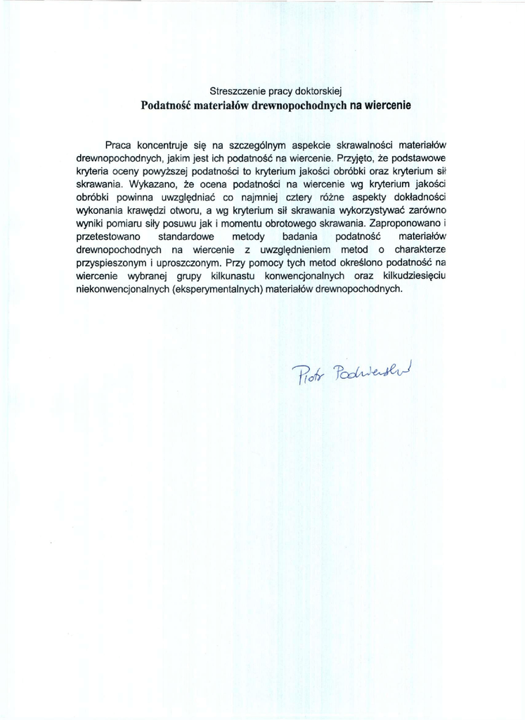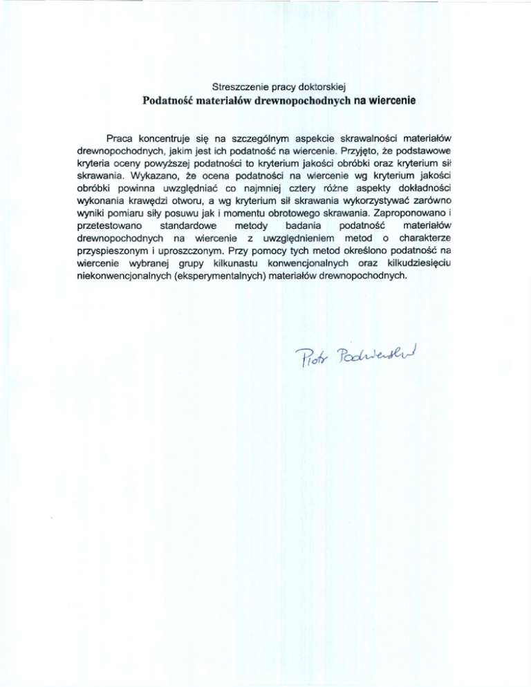 streszczenie pracy doktorskiej Podatność materiałów drewnopochodnych na wiercenie Praca koncentruje się na szczególnym aspekcie skrawalności materiałów drewnopochodnych, jakim jest ich podatność na wiercenie. Przyjęto, że podstawowe kryteria oceny powyższej podatności to kryterium jakości obróbki oraz kryterium sił skrawania. Wykazano, że ocena podatności na wiercenie wg kryterium jakości obróbki powinna uwzględniać co najmniej cztery różne aspekty dokładności wykonania krawędzi otworu, a wg kryterium sił skrawania wykorzystywać zarówno wyniki pomiaru siły posuwu jak i momentu obrotowego skrawania. Zaproponowano i przetestowano standardowe metody badania podatność materiałów drewnopochodnych na wiercenie z uwzględnieniem metod o charakterze przyspieszonym i uproszczonym. Przy pomocy tych metod określono podatność na wiercenie wybranej grupy kilkunastu konwencjonalnych oraz kilkudziesięciu niekonwencjonalnych (eksperymentalnych) materiałów drewnopochodnych.