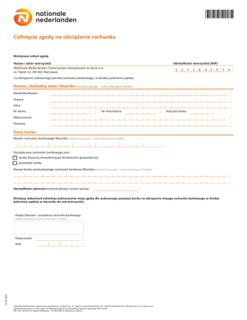 *G006* Cofnięcie zgody na obciążenie rachunku Niniejszym cofam zgodę Nazwa i adres wierzyciela Nationale-Nederlanden Towarzystwo Ubezpieczeń na Życie S.A. ul. Topiel 12, 00-342 Warszawa Identyfikator wierzyciela (NIP) 5 2 7 1 0 0 2 5 7 4 na obciążanie wskazanego poniżej rachunku bankowego, w drodze polecenia zapłaty Nazwa i dokładny adres Dłużnika (Ubezpieczającego – osoby opłacającej składkę) Nazwisko/Nazwa Imiona Ulica Nr domu Nr mieszkania Kod pocztowy Miejscowość Państwo Dane banku Numer rachunku bankowego Dłużnika (Ubezpieczającego – osoby opłacającej składkę) Posiadaczem rachunku bankowego jest: n osoba fizyczna niewykonująca działalności gospodarczej n pozostałe osoby Nazwa banku prowadzącego rachunek bankowy Dłużnika (Ubezpieczającego – osoby opłacającej składkę): Identyfikator płatności (ośmiocyfrowy numer polisy) Niniejszy dokument odwołuje jednocześnie moją zgodę dla wskazanego powyżej banku na obciążanie mojego rachunku bankowego w drodze polecenia zapłaty w stosunku do ww.wierzyciela Podpis Dłużnika – posiadacza rachunku bankowego (podpis zgodny ze wzorem złożonym w banku) Miejscowość Data 12.07.2015 Nationale-Nederlanden Towarzystwo Ubezpieczeń na Życie S.A.; ul. Topiel 12, 00-342 Warszawa; tel. +48 (22) 522 00 00, fax +48 (22) 522 11 11, www.nn.pl Sąd Rejonowy dla m.st. Warszawy; XII Wydział Gospodarczy Krajowego Rejestru Sądowego KRS 25443; NIP: 527-10-02-574, Kapitał zakładowy – 41 000 000 zł, wpłacony w całości