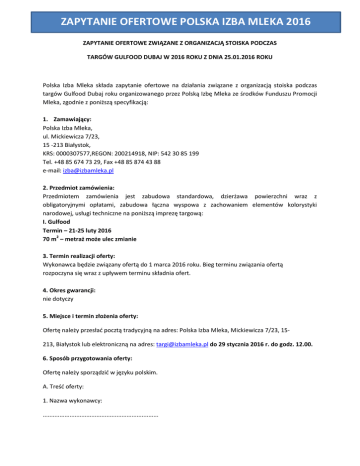 ZAPYTANIE OFERTOWE POLSKA IZBA MLEKA 2016 ZAPYTANIE OFERTOWE ZWIĄZANE Z ORGANIZACJĄ STOISKA PODCZAS TARGÓW GULFOOD DUBAJ W 2016 ROKU Z DNIA 25.01.2016 ROKU Polska Izba Mleka składa zapytanie ofertowe na działania związane z organizacją stoiska podczas targów Gulfood Dubaj roku organizowanego przez Polską Izbę Mleka ze środków Funduszu Promocji Mleka, zgodnie z poniższą specyfikacją: 1. Zamawiający: Polska Izba Mleka, ul. Mickiewicza 7/23, 15 -213 Białystok, KRS: 0000307577,REGON: 200214918, NIP: 542 30 85 199 Tel. +48 85 674 73 29, Fax +48 85 874 43 88 e-mail: [email protected] 2. Przedmiot zamówienia: Przedmiotem zamówienia jest zabudowa standardowa, dzierżawa powierzchni wraz z obligatoryjnymi opłatami, zabudowa łączna wyspowa z zachowaniem elementów kolorystyki narodowej, usługi techniczne na poniższą imprezę targową: I. Gulfood Termin – 21-25 luty 2016 70 m2 – metraż może ulec zmianie 3. Termin realizacji oferty: Wykonawca będzie związany ofertą do 1 marca 2016 roku. Bieg terminu związania ofertą rozpoczyna się wraz z upływem terminu składnia ofert. 4. Okres gwarancji: nie dotyczy 5. Miejsce i termin złożenia oferty: Ofertę należy przesłać pocztą tradycyjną na adres: Polska Izba Mleka, Mickiewicza 7/23, 15213, Białystok lub elektroniczną na adres: [email protected] do 29 stycznia 2016 r. do godz. 12.00. 6. Sposób przygotowania oferty: Ofertę należy sporządzić w języku polskim. A. Treść oferty: 1. Nazwa wykonawcy: ..................................................................... ZAPYTANIE OFERTOWE POLSKA IZBA MLEKA 2016 2. Adres wykonawcy: ...................................................................... 3. Tel, e-mail wykonawcy: .............................................................. 4. Osoba do kontaktu z ramienia wykonawcy: ........................... 5. NIP: ............................................................................................... 6. Regon: .......................................................................................... 7. Nr rachunku bankowego: .......................................................... 8. Cena wykonania zadania: 8.1 cena ogólna wykonania całości zadania powinna być podana w kwocie brutto, 8.2 oferta powinna zawierać informacje o koszcie każdego z wymienionych działań I-IV oraz kosztorys każdego zadania osobno. 9. Oświadczam, że zapoznałem/am się z opisem przedmiotu zamówienia i nie w noszę do niego zastrzeżeń. 10. Termin realizacji zamówienia: .......................................................... 11. Okres gwarancji: NIE DOTYCZY 12. Potwierdzam termin realizacji zamówienia ................................. 13. Wyrażam zgodę na warunki płatności określone w zapytaniu cenowym. ............................................., dnia........................... podpis wykonawcy lub osoby upoważnionej pieczątka wykonawcy 7. Opis kryteriów, którymi Zamawiający będzie się kierował przy wyborze oferty: 7.1 cena oferty–maksymalną liczbę punktów (50) otrzyma Wykonawca, który zaproponuje najniższą całkowitą cenę za wykonanie przedmiotu zamówienia, 7.2 doświadczenie w wydatkowaniu środków pochodzących z Funduszu Promocji Mleka – maksymalną liczbę punktów (30) otrzyma Wykonawca, który wykaże się doświadczeniem w wydatkowaniu środków pochodzących z Funduszu Promocji Mleka poprzez ZAPYTANIE OFERTOWE POLSKA IZBA MLEKA 2016 przeprowadzenie co najmniej 3 (słownie: trzech) zadań finansowanych ze środków FPM. Wraz z ofertą należy wówczas przedłożyć wykaz tych przeprowadzonych zadań oraz referencje podmiotów z branży mleczarskiej, 7.3 załączony projekt graficzny stoiska wyspowego - maksymalną liczbę punktów (20) otrzyma Wykonawca, który przedstawi najciekawszy projekt graficzny stoiska branżowego. 8. Termin rozstrzygnięcia zapytania: do 1 lutego 2016 r. 9. Warunki płatności za działania zrealizowane w ramach oferty: Przelew po wykonaniu usługi danego działania na podstawie wystawionej faktury VAT, dostarczonej do siedziby Zamawiającego, w terminie do 60 dni. 10. Osoba upoważniona do kontaktu z wykonawcami: Jakub Wszeborowski [email protected] 11. Zamawiający zastrzega sobie prawo do zmiany lub rezygnacji z poszczególnych terminów, ilości osób, liczby zamówionych przedmiotów lub usług itp., zawartych w przedmiocie zamówienia. 12. Zamawiający zastrzega sobie prawo do unieważnienia postępowania w każdym czasie bez podania przyczyny. Białystok, 25 stycznia 2016