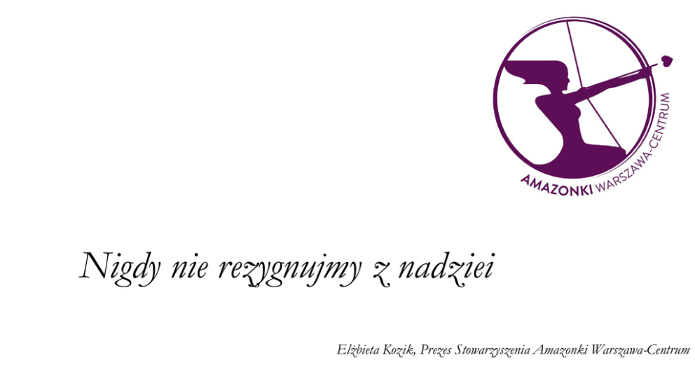 Nigdy nie rezygnujmy z nadziei Elżbieta Kozik, Prezes Stowarzyszenia Amazonki Warszawa-Centrum Kobieta z rakiem piersi - zakryta milczeniem? Choć dziś trudno w to uwierzyć 27 lat temu rak piersi był tematem tabu, a diagnoza choroby przede wszystkim kojarzyła się z wyrokiem. Kobieta z rakiem piersi była zakryta milczeniem. Postęp w medycynie odwraca biografię tych kobiet, bieg historii, sprawia, że możemy żyć (herceptyna). Choroby, które jeszcze niedawno były śmiertelne, dziś mogą być z sukcesem i bezpiecznie leczone. Dla kobiet z zaawansowanym rakiem piersi Dziś takim tematem tabu są kobiety z zaawansowanym rakiem piersi. Kiedy choroba wraca, czujemy lęk i pustkę wokół siebie. Wszystko sprowadza się do tego, że chory zostaje sam ze sobą – to życie w cieniu diagnoz, braku leczenia i społecznego odizolowania. Priorytet na rok 2014 – odwrócenie biegu historii dla kobiet z zaawansowanym rakiem piersi Szansa na życie Nieustannie trwają poszukiwania innowacyjnych, bardziej skutecznych i bezpiecznych terapii. Współczesna medycyna oferuje pacjentkom wiele rodzajów terapii, które wpływają pozytywnie nie tylko na długość ale także na jakość ich życia. Trwają prace nad lekami, które będą niszczyć nowotwór w sposób celowany bez szkody dla komórek zdrowych. Powstają leki, które przedłużają życie, co daje czas na odkrycie nowych terapii. To są możliwości – jak wygląda nasza rzeczywistość? Dlaczego musimy działać? Co dla osoby chorej oznacza świadomość, ze istnieje lek, który może uratować życie, ale nie jest on dostępny? Czy możemy sobie pozwolić na solidaryzm społeczny czyli finansowanie nowoczesnych, często drogich terapii? Środki przeznaczane na innowacyjne leki traktujmy jako inwestycje w zdrowie i życie – jako szanse, które odmienią bieg historii kolejnych kobiet z zaawansowanym rakiem piersi. To szansa na ŻYCIE dlatego pacjenci muszą przyjmować aktywną postawę. Dziękuję!