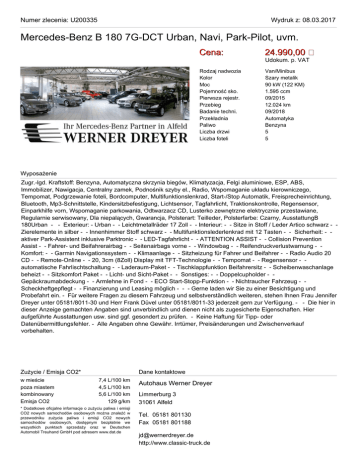 Numer zlecenia: U200335 Wydruk z: 08.03.2017 Mercedes-Benz B 180 7G-DCT Urban, Navi, Park-Pilot, uvm. Cena: 24.990,00 Rodzaj nadwozia Kolor Moc Pojemność sko. Pierwsza rejestr. Przebieg Badanie techni. Przekładnia Paliwo Liczba drzwi Liczba foteli Van/Minibus Szary metalik 90 kW (122 KM) 1.595 ccm 09/2015 12.024 km 09/2018 Automatyka Benzyna 5 5 Udokum. p. VAT Wyposażenie Zugr.-lgd. Kraftstoff: Benzyna, Automatyczna skrzynia biegów, Klimatyzacja, Felgi aluminiowe, ESP, ABS, Immobilizer, Nawigacja, Centralny zamek, Podnośnik szyby el., Radio, Wspomaganie układu kierowniczego, Tempomat, Podgrzewanie foteli, Bordcomputer, Multifunktionslenkrad, Start-/Stop Automatik, Freisprecheinrichtung, Bluetooth, Mp3-Schnittstelle, Kindersitzbefestigung, Lichtsensor, Tagfahrlicht, Traktionskontrolle, Regensensor, Einparkhilfe vorn, Wspomaganie parkowania, Odtwarzacz CD, Lusterko zewnętrzne elektrycznie przestawiane, Regularnie serwisowany, Dla niepalących, Gwarancja, Polsterart: Teilleder, Polsterfarbe: Czarny, AusstattungB 180Urban - - Exterieur: - Urban - - Leichtmetallräder 17 Zoll - - Interieur: - - Sitze in Stoff / Leder Artico schwarz - Zierelemente in silber - - Innenhimmer Stoff schwarz - - Multifunktionslederlenkrad mit 12 Tasten - - Sicherheit: - aktiver Park-Assistent inklusive Parktronic - - LED-Tagfahrlicht - - ATTENTION ASSIST - - Collision Prevention Assist - - Fahrer- und Beifahrerairbag - - Seitenairbags vorne - - Windowbag - - Reifendruckverlustwarnung - Komfort: - - Garmin Navigationssystem - - Klimaanlage - - Sitzheizung für Fahrer und Beifahrer - - Radio Audio 20 CD - - Remote-Online - - 20, 3cm (8Zoll) Display mit TFT-Technologie - - Tempomat - - Regensensor - automatische Fahrlischtschaltung - - Laderaum-Paket - - Tischklappfunktion Beifahrersitz - - Scheibenwaschanlage beheizt - - Sitzkomfort Paket - - Licht- und Sicht-Paket - - Sonstiges: - - Doppelcupholder - Gepäckraumabdeckung - - Armlehne in Fond - - ECO Start-Stopp-Funktion - - Nichtraucher Fahrzeug - Scheckheftgepflegt - - Finanzierung und Leasing möglich - - - Gerne laden wir Sie zu einer Besichtigung und Probefahrt ein. - Für weitere Fragen zu diesem Fahrzeug und selbstverständlich weiteren, stehen Ihnen Frau Jennifer Dreyer unter 05181/8011-30 und Herr Frank Düvel unter 05181/8011-33 jederzeit gern zur Verfügung. - - Die hier in dieser Anzeige gemachten Angaben sind unverbindlich und dienen nicht als zugesicherte Eigenschaften. Hier aufgeführte Ausstattungen usw. sind ggf. gesondert zu prüfen. - Keine Haftung für Tipp- oder Datenübermittlungsfehler. - Alle Angaben ohne Gewähr. Irrtümer, Preisänderungen und Zwischenverkauf vorbehalten. Zużycie / Emisja CO2* w mieście poza miastem kombinowany Emisja CO2 Dane kontaktowe 7,4 L/100 km 4,5 L/100 km 5,6 L/100 km 129 g/km * Dodatkowe oficjalne informacje o zużyciu paliwa i emisji CO2 nowych samochodów osobowych można znaleźć w przewodniku zużycia paliwa i emisji CO2 nowych samochodów osobowych, dostępnym bezpłatnie we wszystkich punktach sprzedaży oraz w Deutschen Automobil Treuhand GmbH pod adresem www.dat.de Autohaus Werner Dreyer Limmerburg 3 31061 Alfeld Tel. 05181 801130 Fax 05181 801188 [email protected] http://www.classic-truck.de Numer zlecenia: U200335 Wydruk z: 08.03.2017 Mercedes-Benz B 180 7G-DCT Urban, Navi, Park-Pilot, uvm.