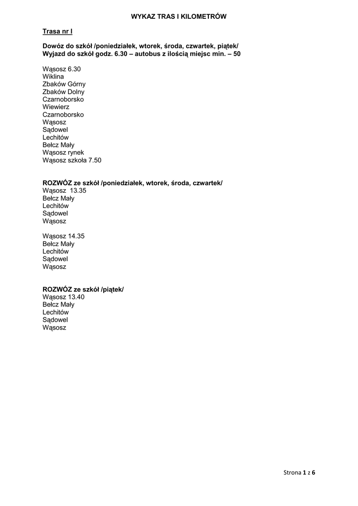WYKAZ TRAS I KILOMETRÓW Trasa nr I Dowóz do szkół /poniedziałek, wtorek, środa, czwartek, piątek/ Wyjazd do szkół godz. 6.30 – autobus z ilością miejsc min. – 50 Wąsosz 6.30 Wiklina Zbaków Górny Zbaków Dolny Czarnoborsko Wiewierz Czarnoborsko Wąsosz Sądowel Lechitów Bełcz Mały Wąsosz rynek Wąsosz szkoła 7.50 ROZWÓZ ze szkół /poniedziałek, wtorek, środa, czwartek/ Wąsosz 13.35 Bełcz Mały Lechitów Sądowel Wąsosz Wąsosz 14.35 Bełcz Mały Lechitów Sądowel Wąsosz ROZWÓZ ze szkół /piątek/ Wąsosz 13.40 Bełcz Mały Lechitów Sądowel Wąsosz Strona 1 z 6 Trasa nr II Dowóz do szkół /poniedziałek, wtorek, środa, czwartek, piątek/ Wyjazd do szkół godz. 6.35 – autobus z ilością miejsc min. – 50 Wodniki 6.50 Borowna Świniary Pobiel Unisławice Ługi Bartków Pobiel Wąsosz ROZWÓZ ze szkół /poniedziałek, wtorek, środa, czwartek/ Kurs I Pobiel /szkoła/ 12.40 Świniary Borowna Wodniki Zubrza Unisławice Ługi Bartków Pobiel Kurs II Pobiel /szkoła/ 13.30 Świniary Borowna Wodniki Zubrza Unisławice Ługi Bartków Wąsosz Kurs III Wąsosz 14.30 Młynary Pobiel /szkoła/ Świniary Borowna Wodniki Zubrza Unisławice Ługi Bartków Wąsosz ROZWÓZ ze szkół /piątek/ Kurs I Pobiel /szkoła/ 12.40 Świniary Strona 2 z 6 Borowna Wodniki Zubrza Unisławice Ługi Bartków Pobiel Kurs II Pobiel /szkoła/ 13.30 Świniary Borowna Wodniki Zubrza Unisławice Ługi Bartków Wąsosz Strona 3 z 6 Trasa nr III Dowóz do szkół /poniedziałek, wtorek, środa, czwartek, piątek/ Wyjazd do szkół godz. 6.30 – autobus z ilością miejsc min. – 50 Lubiel 6.30 Czaplewo Płoski Kamień Górowski Wrząca Wielka Wrząca Śląska Drozdowice Małe Drozdowice Wielkie Wąsosz Chocieborowice Jawor Marysin Wąsosz 7.55 ROZWÓZ ze szkół /poniedziałek, wtorek, środa, czwartek/ Wąsosz 13.40 Chocieborowice Jawor Marysin Drozdowice Wielkie Drozdowice Małe Kobylniki Płoski Ostrawa Lubiel Czaplewo Wąsosz Drozdowice Wielkie Drozdowice Małe Wrząca Śląska Kamień Górowski Wrząca Wielka Płoski Lubiel Czaplewo Wąsosz ROZWÓZ ze szkół /piątek/ Kobylniki 12.05 Płoski Ostrawa Lubiel Czaplewo Wąsosz Wąsosz 13.40 Chocieborowice Jawor Marysin Drozdowice Wielkie Płoski Kobylniki Lubiel Czaplewo Wąsosz Strona 4 z 6 Trasa nr IV Dowóz do szkół /poniedziałek, wtorek, środa, czwartek, piątek/ Wyjazd do szkół godz. 7.30 – autobus z ilością miejsc min. – 50 Czeladź Wielka 7.30 Baranowice Kowalowo Wąsosz 7.40 Drozdowice Wielkie Drozdowice Małe Wrząca Śląska Wrząca Wielka Kamień Górowski Płoski Kobylniki Wąsosz 8.30 ROZWÓZ ze szkół /poniedziałek, wtorek, środa, czwartek/ Wąsosz 13.40 Kowalowo Czeladź Wielka Baranowice Płoski Kobylniki Kamień Górowski Wrząca Wielka Wrząca Śląska Drozdowice Małe Drozdowice Wielkie Wąsosz 14.55 Kowalowo Czeladź Wielka Baranowice Chocieborowice Marysin Jawor Wąsosz ROZWÓZ ze szkół /piątek/ Wąsosz 11.50 Kobylniki Płoski Kamień Górowski Wrząca Wielka Wrząca Śląska Drozdowice Małe Drozdowice Wielkie Wąsosz Wąsosz 13.40 Kowalowo Czeladź Wielka Baranowice Wąsosz Płoski Strona 5 z 6 Kobylniki Kamień Górowski Wrząca Wielka Wrząca Śląska Drozdowice Małe Drozdowice Wielkie Wąsosz Liczba kilometrów do przejechania wg tras Trasy Trasa nr 1 Poniedziałek 82 Trasa nr 2 Środa Wtorek Piątek 82 82 Czwartek 82 185 185 185 185 152 Trasa nr 3 135 135 135 135 130 Trasa nr 4 120 120 120 120 120 68 Strona 6 z 6