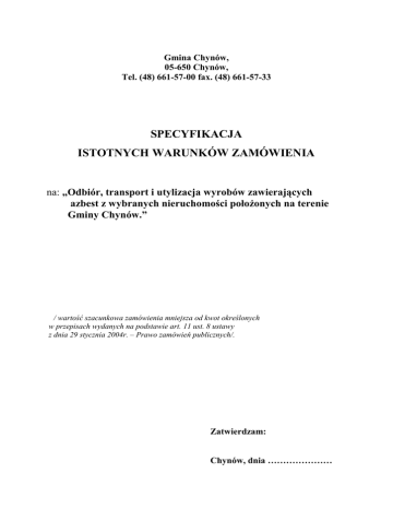Gmina Chynów, 05-650 Chynów, Tel. (48) 661-57-00 fax. (48) 661-57-33 SPECYFIKACJA ISTOTNYCH WARUNKÓW ZAMÓWIENIA na: „Odbiór, transport i utylizacja wyrobów zawierających azbest z wybranych nieruchomości połoŜonych na terenie Gminy Chynów.” / wartość szacunkowa zamówienia mniejsza od kwot określonych w przepisach wydanych na podstawie art. 11 ust. 8 ustawy z dnia 29 stycznia 2004r. – Prawo zamówień publicznych/. Zatwierdzam: Chynów, dnia ………………… Chynów, dnia 13.08.2012r. Znak sprawy: ZP.272.12.2012 SPECYFIKACJA ISTOTNYCH WARUNKÓW ZAMÓWIENIA na „Odbiór, transport i utylizacja wyrobów zawierających azbest z wybranych nieruchomości połoŜonych na terenie Gminy Chynów.” /wartość szacunkowa zamówienia mniejsza od kwot określonych w przepisach wydanych na podstawie art. 11 ust. 8 ustawy z dnia 29 stycznia 2004r. – Prawo zamówień publicznych / §1 Nazwa / firma/ oraz adres zamawiającego. Gmina Chynów 05-650 Chynów, woj. mazowieckie REGON: 670223570 www.bip.chynow.pl e-mail: [email protected] Tel. /48/ 66-15-700 fax /48/ 66-15-733 Prowadzący sprawę: Urząd Gminy w Chynowie §2 Tryb udzielenia zamówienia 1. Przetarg nieograniczony dla zamówienia o wartości szacunkowej mniejszej od kwot określonych w przepisach wydanych na podstawie art. 11 ust. 8 ustawy z dnia 29 stycznia 2004r. – Prawo zamówień publicznych (tekst jednolity: Dz.U. z 2010r. Nr 113, poz. 759 z późniejszymi zmianami). 2. Wartość szacunkowa zamówienia nie przekracza wyraŜonej w złotych równowartości kwoty 200.000 euro, natomiast przekracza wyraŜoną w złotych równowartości kwoty 14.000 euro. §3 Opis przedmiotu zamówienia. Nomenklatura: Wspólny Słownik Zamówień (CPV) – 90.65.00.00-8 1.Przedmiotem zamówienia jest usługa polegająca na odbiorze, transporcie i utylizacji wyrobów zawierających azbest z wybranych nieruchomości połoŜonych na terenie Gminy Chynów. Wykonanie powyŜszego zadania powinno być zrealizowane według zasad określonych w obowiązujących przepisach i procedurach w zakresie postępowania z wyrobami i odpadami zawierającymi azbest. 2. Realizacja przedmiotu zamówienia polegać będzie na usunięciu wyrobów zawierających azbest z wybranych nieruchomości połoŜonych na terenie gminy Chynów, wg poniŜszego zakresu: załadunek, transport wyrobów zawierających azbest z wybranych nieruchomości do miejsca unieszkodliwiania, rozładunek i zdeponowanie na składowisku wskazanym przez Wykonawcę - w ilości 60 Mg. 3. Podane wielkości mają charakter szacunkowy, w związku z tym zakres zamówienia moŜe ulec zmianie i będzie określony na podstawie faktycznych ilości odebranych wyrobów zawierających azbest. 4. Termin oraz zakres wykonania prac kaŜdorazowo powinien być ustalany przez Wykonawcę z Zamawiającym w formie pisemnej lub telefonicznie. §4 Opis części zamówienia, jeŜeli zamawiający dopuszcza składanie ofert częściowych. Zamawiający nie podzielił zamówienia na poszczególne części i nie dopuszcza składania ofert częściowych. §5 Informacje o przewidywanych zamówieniach uzupełniających, o których mowa w art. 67 ust. 1 pkt 6 i 7 ustawy z dnia 29 stycznia 2004r. – Prawo zamówień publicznych / tekst jednolity: Dz.U. z 2010r. Nr 113, poz. 759 z późniejszymi zmianami /. Zamawiający nie przewiduje zamówień uzupełniających, o których mowa w art. 67 ust. 1 pkt 6 i 7. §6 Opis sposobu przedstawienia ofert wariantowych oraz minimalne warunki, jakim muszą odpowiadać oferty wariantowe, jeŜeli zamawiający dopuszcza ich składanie. Zamawiający nie dopuszcza składania ofert wariantowych. §7 Termin wykonania zamówienia. Wymagany okres realizacji zamówienia – do dnia 31.12.2012r. §8 Warunki udziału w postępowaniu oraz opis sposobu dokonywania oceny spełnienia tych warunków. 1. O udzielenie zamówienia mogą ubiegać się wykonawcy, którzy spełniają warunki dotyczące: 1.1. Posiadania uprawnień do wykonywania określonej działalności lub czynności, jeŜeli przepisy prawa nakładają obowiązek ich posiadania, Opis sposobu dokonywania oceny spełnienia tego warunku Wykonawca musi wykazać, Ŝe posiada zezwolenia niezbędne do prowadzenia tego typu działalności. Wykonawca jest zobowiązany do przedłoŜenia: 1. Decyzji Marszałka Województwa zatwierdzająca Wykonawcy program gospodarki odpadami, obejmująca wytwarzanie odpadów niebezpiecznych (w tym zawierających azbest). 2.Zezwolenie Wykonawcy na prowadzenie działalności w zakresie transportu odpadów niebezpiecznych. 3.Decyzja dla właściciela składowiska, na którym będą deponowane odpady zawierające azbest zezwalająca na prowadzenie działalności w zakresie unieszkodliwiania odpadów niebezpiecznych zawierających azbest poprzez składowanie. 4. Umowa ze składowiskiem, na którym będą deponowane odpady zawierające azbest. Ocena spełnienia warunku dokonana będzie metodą „zero – jedynkową”. Oznacza to, Ŝe wystarczającym powodem do wykluczenia wykonawcy moŜe być brak w ofercie wymaganego oświadczenia lub jego nie uzupełnienie, we wskazanym przez zamawiającego terminie, w trybie art. 26 ust. 3 ustawy z dnia 29 stycznia 2004r. – Prawo zamówień publicznych (tekst jednolity: Dz.U. z 2010r. Nr 113, poz. 759 z późniejszymi zmianami). 1.2. Posiadania wiedzy i doświadczenia; Opis sposobu dokonywania oceny spełnienia tego warunku Zamawiający uzna za spełnienie tego warunku wykazanie przez Wykonawcę , Ŝe w ostatnich 3 latach przed upływem terminu składania ofert, a jeŜeli okres prowadzenia działalności jest krótszy – w tym okresie co najmniej 2 zadań podobnych do przedmiotu zamówienia oraz załączą dokumenty potwierdzające, Ŝe usługi te zostały zrealizowane naleŜycie. Do sporządzenia wykazu usług moŜna wykorzystać załączony do SIWZ wzór. Ocena spełnienia warunku dokonana będzie metodą „zero – jedynkową”. Oznacza to, Ŝe wystarczającym powodem do wykl