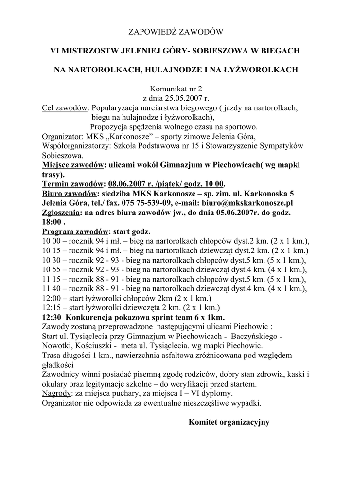 ZAPOWIEDŻ ZAWODÓW VI MISTRZOSTW JELENIEJ GÓRY- SOBIESZOWA W BIEGACH NA NARTOROLKACH, HULAJNODZE I NA ŁYŻWOROLKACH Komunikat nr 2 z dnia 25.05.2007 r. Cel zawodów: Popularyzacja narciarstwa biegowego ( jazdy na nartorolkach, biegu na hulajnodze i łyżworolkach), Propozycja spędzenia wolnego czasu na sportowo. Organizator: MKS „Karkonosze” – sporty zimowe Jelenia Góra, Współorganizatorzy: Szkoła Podstawowa nr 15 i Stowarzyszenie Sympatyków Sobieszowa. Miejsce zawodów: ulicami wokół Gimnazjum w Piechowicach( wg mapki trasy). Termin zawodów: 08.06.2007 r. /piątek/ godz. 10 00. Biuro zawodów: siedziba MKS Karkonosze – sp. zim. ul. Karkonoska 5 Jelenia Góra, tel./ fax. 075 75-539-09, e-mail: [email protected] Zgłoszenia: na adres biura zawodów jw., do dnia 05.06.2007r. do godz. 18:00 . Program zawodów: start godz. 10 00 – rocznik 94 i mł. – bieg na nartorolkach chłopców dyst.2 km. (2 x 1 km.), 10 15 – rocznik 94 i mł. – bieg na nartorolkach dziewcząt dyst.2 km. (2 x 1 km.) 10 30 – rocznik 92 - 93 - bieg na nartorolkach chłopców dyst.5 km. (5 x 1 km.), 10 55 – rocznik 92 - 93 - bieg na nartorolkach dziewcząt dyst.4 km. (4 x 1 km.), 11 15 – rocznik 88 - 91 - bieg na nartorolkach chłopców dyst.5 km. (5 x 1 km.), 11 40 – rocznik 88 - 91 - bieg na nartorolkach dziewcząt dyst.4 km. (4 x 1 km.), 12:00 – start łyżworolki chłopców 2km (2 x 1 km.) 12:15 – start łyżworolki dziewczęta 2 km. (2 x 1 km.) 12:30 Konkurencja pokazowa sprint team 6 x 1km. Zawody zostaną przeprowadzone następującymi ulicami Piechowic : Start ul. Tysiąclecia przy Gimnazjum w Piechowicach - Baczyńskiego Nowotki, Kościuszki - meta ul. Tysiąclecia. wg mapki Piechowic. Trasa długości 1 km., nawierzchnia asfaltowa zróżnicowana pod względem gładkości Zawodnicy winni posiadać pisemną zgodę rodziców, dobry stan zdrowia, kaski i okulary oraz legitymacje szkolne – do weryfikacji przed startem. Nagrody: za miejsca puchary, za miejsca I – VI dyplomy. Organizator nie odpowiada za ewentualne nieszczęśliwe wypadki. Komitet organizacyjny
