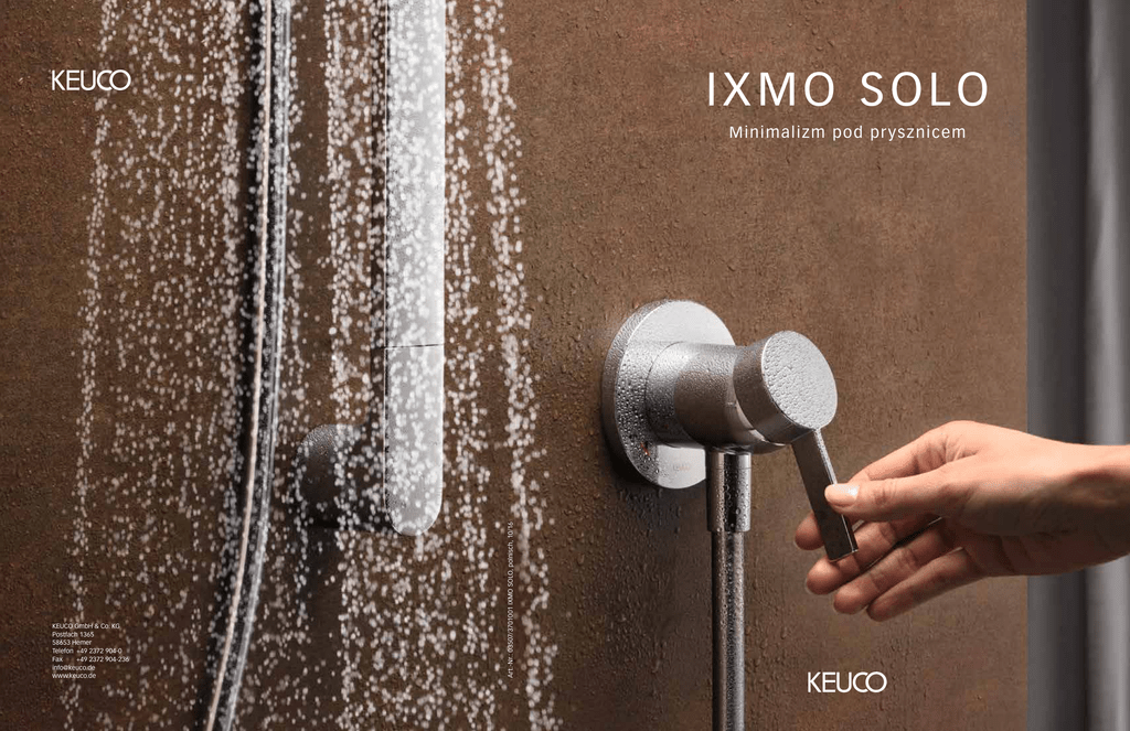 IXMO SOLO KEUCO GmbH & Co. KG Postfach 1365 58653 Hemer Telefon +49 2372 904-0 Fax +49 2372 904-236 [email protected] www.keuco.de Art.-Nr.: 03507/3701001 IXMO SOLO, polnisch, 10/16 M inim alizm pod pr y sznic em Konsekwentny, dalszy rozwój „W odniesieniu do projektów łazienek często mówi się o redukcji. Ale niewielu z tych, którzy o niej mówią, są w stanie tę redukcję konsekwentnie wprowadzać w życie. Stworzenie koncepcji armatury IXMO w roku 2015 pozwoliło nam na utorowanie nowych dróg. Doprowadziliśmy do innowacyjnych integracji w zakresie funkcji i radykalnych redukcji w zakresie wzornictwa. IXMO SOLO to zatem kolejny krok na nowo utorowanej drodze. Od tego czasu oferujemy dla ambitnych klientów tylko jeden, jedyny element armatury naściennej, który w pełni wystarczy do obsługi prysznica. Taki minimalizm ustala obecnie nowy wzorzec w projektowaniu łazienek.“ Hartmut Dalheimer, Dyrektor Zarządzający KEUCO 3 Nowy minimalizm pod prysznicem Hasło „Mniej potrafi zdziałać więcej“ jest w odniesieniu do nowego członka rodziny IXMO bardziej trafne niż dotychczas. IXMO SOLO to kolejny cud funkcjonalności: niewyobrażalnie mały moduł wyróżnia się minimalistycznym projektem w inteligentnym połączeniu z nowatorską technologią. Na rynku pojawiła się armatura, łącząca charakter jednouchwytowej baterii i przyłącza wężowego. Minimalny wysiłek przy montażu – maksymalny komfort, ponieważ kompletne rozwiązanie armatury prysznicowej to wyłącznie IXMO SOLO, nie ma potrzeby korzystania z jakiegokolwiek innego elementu doprowadzającego wodę. Produkt IXMO SOLO wyróżnia się konsekwentnym projektem i małymi wymiarami, dzięki jego zastosowaniu łazienka nabiera bardzo uporządkowanego charakteru. A dzięki możliwości zastosowania okrągłej lub wielokątnej rozety, IXMO SOLO doskonale komponuje się z innymi liniami KEUCO. 4 Doskonałość przed ścianą i za ścianą Moduł IXMO SOLO przekonuje małymi 59552 wymiarami i jednolitym kształtem. Stała długość elementu wystającego ze ściany wynosi dokładnie 90 mm. Również średnica w przypadku rozety okrągłej lub odległość między krawędziami dla rozety wielokątnej wynosi 90 mm. Bezproblemowy montaż jednostki podtyn- 59552 51187 51587 59587 59552 Zestaw składa się z: 51187 Zestaw prysznicowy składający się z: – Relingu o długości 900 mm z uchwytem na słuchawkę, systemem regulacji wysokości z uchwytem, możliwość bezstopniowej regulacji kąta przechyłu – S łuchawki prysznicowej dającej normalny strumień wody – Węża prysznicowego, 1600 mm – Płytki kompensującej (5 mm) 51587 Zestaw prysznicowy składający się z: –R elingu o długości 900 mm z uchwytem na słuchawkę, systemem regulacji wysokości z uchwytem, możliwość bezstopniowej regulacji kąta przechyłu –S łuchawki prysznicowej dającej normalny, łagodny lub masażowy strumień wody – Węża prysznicowego, 1600 mm – Płytki kompensującej (5 mm) 59587 Zestaw prysznicowy składający się z: – Relingu o długości 800 mm z uchwytem na słuchawkę, systemem regulacji wysokości z uchwytem, możliwość bezstopniowej regulacji kąta przechyłu – S łuchawki prysznicowej dającej normalny strumień wody – Węża prysznicowego, 1600 mm – Płytki kompensującej (5 mm) kowej w cienkich ścianach lub w przypadku późniejszej modernizacji jest możliwy dzięki niewielkiej głębokości zabudowy, wynoszącej minimalnie 65 mm. Dzięki inteligentnej metodzie kompensacji głębokości, możliwe jest jej elastyczne i bezstopniowe regulowanie w zakresie 65 – 95 mm. 90 mm IXMO SOLO posiada też inne zalety: możliwe jest w razie potrzeby, w każdym czasie, ograniczenie temperatury wody i jej ilości. Ponadto ograniczający się do jednego elementu model IXMO SOLO 65 – 95 mm – Armatury jednouchwytowej z przyłączem wężowym DN 15 Głowica mieszająca z ceramicznymi tarczami uszczelniającymi, ograniczenie temperatury i ograniczenie przepływu, przyłącze wężowe, zabezpieczone samoczynnie przed powrotem cieczy wg DIN EN 1717 Długość elementu wystającego poza ścianę wynosi 90 mm Zestaw gotowy składa się z: Dźwigni, tulei, rozet (okrągłych i wielokątnych), jednostki funkcyjnej i przyłącza wężowego – J ednostka funkcjonalna UP do armatury jednouchwytowej z przyłączem wężowym DN 15 Korpus podstawowy do zabudowy ściennej Głębokość zabudowy 65 – 95 mm jest szczególnie łatwy do pielęgnacji. Klasyfikacja według grupy emisji hałasu I i klasy przepływu A Dowiedz się więcej o IXMO i skorzystaj z naszego narzędzia do projektowania online na stronie www.ixmo.de 6 7