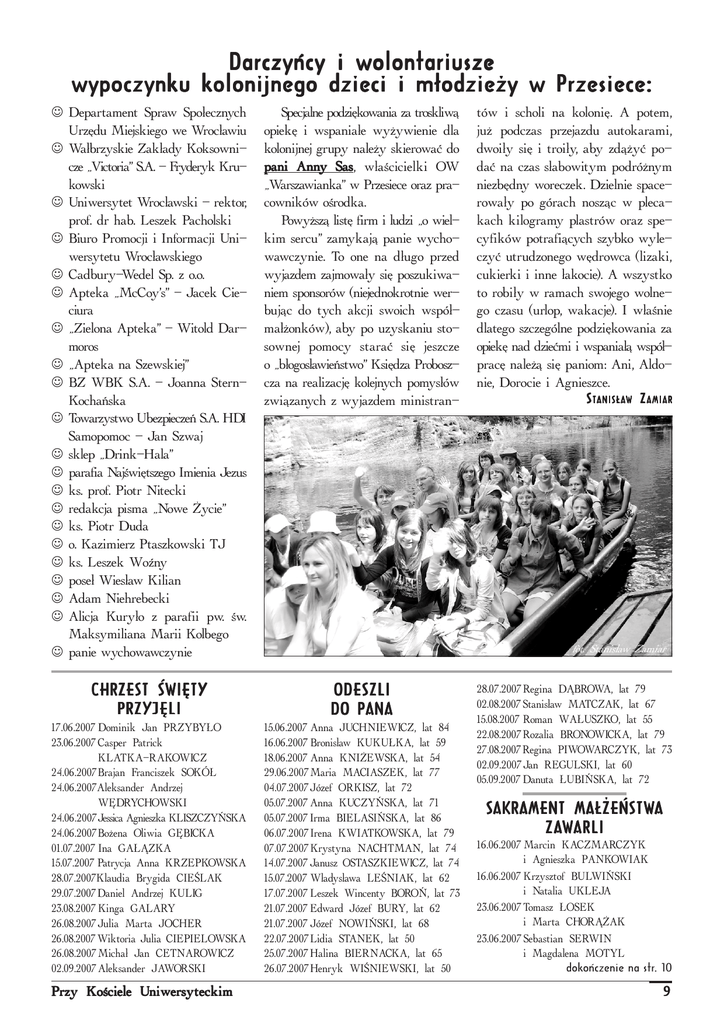 Darczyñcy i wolontariusze olonijnego dzieci i m³odzie¿y w Przesiece: wypoczynku kkolonijnego J Departament Spraw Spo³ecznych Urzêdu Miejskiego we Wroc³awiu J Wa³brzyskie Zak³ady Koksownicze Victoria S.A. - Fryderyk Krukowski J Uniwersytet Wroc³awski - rektor, prof. dr hab. Leszek Pacholski J Biuro Promocji i Informacji Uniwersytetu Wroc³awskiego J Cadbury-Wedel Sp. z o.o. J Apteka McCoys - Jacek Cieciura J Zielona Apteka - Witold Darmoros J Apteka na Szewskiej J BZ WBK S.A. - Joanna SternKochañska J Towarzystwo Ubezpieczeñ S.A. HDI Samopomoc - Jan Szwaj J sklep Drink-Hala J parafia Najwiêtszego Imienia Jezus J ks. prof. Piotr Nitecki J redakcja pisma Nowe ¯ycie J ks. Piotr Duda J o. Kazimierz Ptaszkowski TJ J ks. Leszek Wony J pose³ Wies³aw Kilian J Adam Niehrebecki J Alicja Kury³o z parafii pw. w. Maksymiliana Marii Kolbego J panie wychowawczynie Specjalne podziêkowania za troskliw¹ opiekê i wspania³e wy¿ywienie dla kolonijnej grupy nale¿y skierowaæ do pani Ann y Sas Anny Sas, w³acicielki OW Warszawianka w Przesiece oraz pracowników orodka. Powy¿sz¹ listê firm i ludzi o wielkim sercu zamykaj¹ panie wychowawczynie. To one na d³ugo przed wyjazdem zajmowa³y siê poszukiwaniem sponsorów (niejednokrotnie werbuj¹c do tych akcji swoich wspó³ma³¿onków), aby po uzyskaniu stosownej pomocy staraæ siê jeszcze o b³ogos³awieñstwo Ksiêdza Proboszcza na realizacjê kolejnych pomys³ów zwi¹zanych z wyjazdem ministran- CHRZEST WIÊTY PRZYJÊLI ODESZLI DO PANA 17.06.2007 Dominik Jan PRZYBY£O 23.06.2007 Casper Patrick KLATKA-RAKOWICZ 24.06.2007Brajan Franciszek SOKÓ£ 24.06.2007Aleksander Andrzej WÊDRYCHOWSKI 24.06.2007Jessica Agnieszka KLISZCZYÑSKA 24.06.2007Bo¿ena Oliwia GÊBICKA 01.07.2007 Ina GA£¥ZKA 15.07.2007 Patrycja Anna KRZEPKOWSKA 28.07.2007Klaudia Brygida CIELAK 29.07.2007Daniel Andrzej KULIG 23.08.2007 Kinga GALARY 26.08.2007 Julia Marta JOCHER 26.08.2007 Wiktoria Julia CIEPIELOWSKA 26.08.2007 Micha³ Jan CETNAROWICZ 02.09.2007 Aleksander JAWORSKI Pr zy K oci el niw ersyt eckim Przy Koci ociel elee U Uniw niwersyt ersyteckim tów i scholi na koloniê. A potem, ju¿ podczas przejazdu autokarami, dwoi³y siê i troi³y, aby zd¹¿yæ podaæ na czas s³abowitym podró¿nym niezbêdny woreczek. Dzielnie spacerowa³y po górach nosz¹c w plecakach kilogramy plastrów oraz specyfików potrafi¹cych szybko wyleczyæ utrudzonego wêdrowca (lizaki, cukierki i inne ³akocie). A wszystko to robi³y w ramach swojego wolnego czasu (urlop, wakacje). I w³anie dlatego szczególne podziêkowania za opiekê nad dzieæmi i wspania³¹ wspó³pracê nale¿¹ siê paniom: Ani, Aldonie, Dorocie i Agnieszce. S T ANIS£A W Z AMIAR ANIS£AW fot. Stanis³aw Zamiar 15.06.2007 Anna JUCHNIEWICZ, lat 84 16.06.2007 Bronis³aw KUKU£KA, lat 59 18.06.2007 Anna KNI¯EWSKA, lat 54 29.06.2007Maria MACIASZEK, lat 77 04.07.2007Józef ORKISZ, lat 72 05.07.2007 Anna KUCZYÑSKA, lat 71 05.07.2007 Irma BIELASIÑSKA, lat 86 06.07.2007 Irena KWIATKOWSKA, lat 79 07.07.2007 Krystyna NACHTMAN, lat 74 14.07.2007 Janusz OSTASZKIEWICZ, lat 74 15.07.2007 W³adys³awa LENIAK, lat 62 17.07.2007 Leszek Wincenty BOROÑ, lat 73 21.07.2007 Edward Józef BURY, lat 62 21.07.2007 Józef NOWIÑSKI, lat 68 22.07.2007Lidia STANEK, lat 50 25.07.2007 Halina BIERNACKA, lat 65 26.07.2007Henryk WINIEWSKI, lat 50 28.07.2007 Regina D¥BROWA, lat 79 02.08.2007 Stanis³aw MATCZAK, lat 67 15.08.2007 Roman WA£USZKO, lat 55 22.08.2007 Rozalia BRONOWICKA, lat 79 27.08.2007 Regina PIWOWARCZYK, lat 73 02.09.2007 Jan REGULSKI, lat 60 05.09.2007 Danuta £UBIÑSKA, lat 72 SAKRAMENT MA£¯EÑSTW A MA£¯EÑSTWA ZA W ARLI ZAW 16.06.2007 Marcin KACZMARCZYK i Agnieszka PANKOWIAK 16.06.2007 Krzysztof BULWIÑSKI i Natalia UKLEJA 23.06.2007 Tomasz £OSEK i Marta CHOR¥¯AK 23.06.2007 Sebastian SERWIN i Magdalena MOTYL dokoñczenie na str. 10 9