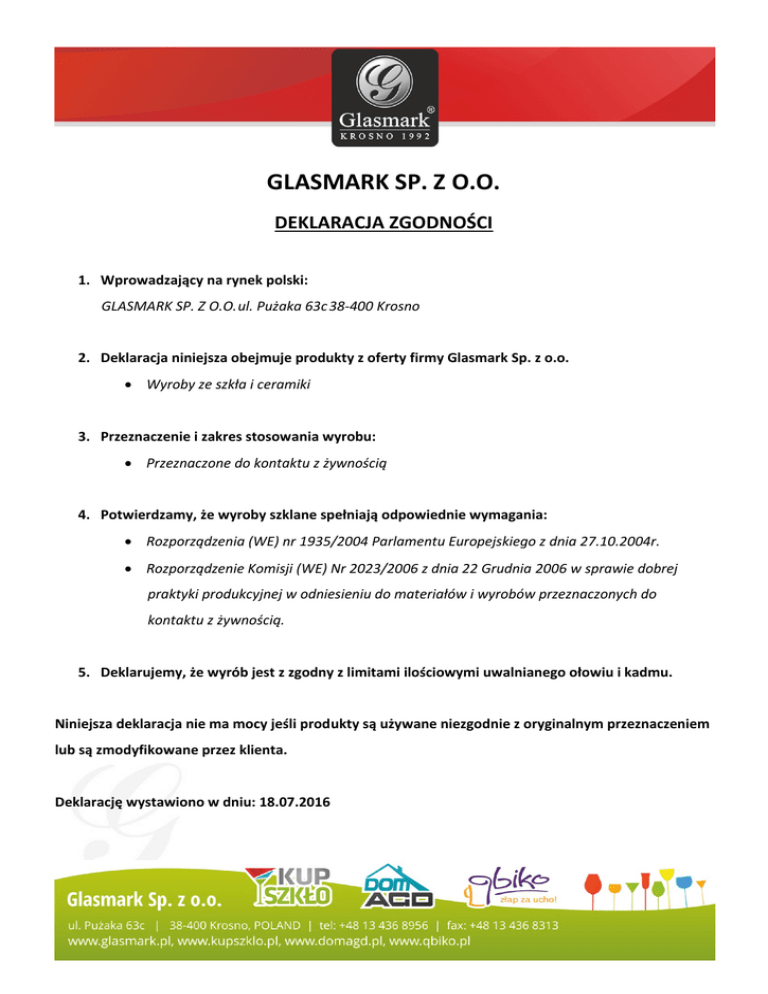 GLASMARK SP. Z O.O. DEKLARACJA ZGODNOŚCI 1. Wprowadzający na rynek polski: GLASMARK SP. Z O.O. ul. Pużaka 63c 38-400 Krosno 2. Deklaracja niniejsza obejmuje produkty z oferty firmy Glasmark Sp. z o.o. Wyroby ze szkła i ceramiki 3. Przeznaczenie i zakres stosowania wyrobu: Przeznaczone do kontaktu z żywnością 4. Potwierdzamy, że wyroby szklane spełniają odpowiednie wymagania: Rozporządzenia (WE) nr 1935/2004 Parlamentu Europejskiego z dnia 27.10.2004r. Rozporządzenie Komisji (WE) Nr 2023/2006 z dnia 22 Grudnia 2006 w sprawie dobrej praktyki produkcyjnej w odniesieniu do materiałów i wyrobów przeznaczonych do kontaktu z żywnością. 5. Deklarujemy, że wyrób jest z zgodny z limitami ilościowymi uwalnianego ołowiu i kadmu. Niniejsza deklaracja nie ma mocy jeśli produkty są używane niezgodnie z oryginalnym przeznaczeniem lub są zmodyfikowane przez klienta. Deklarację wystawiono w dniu: 18.07.2016