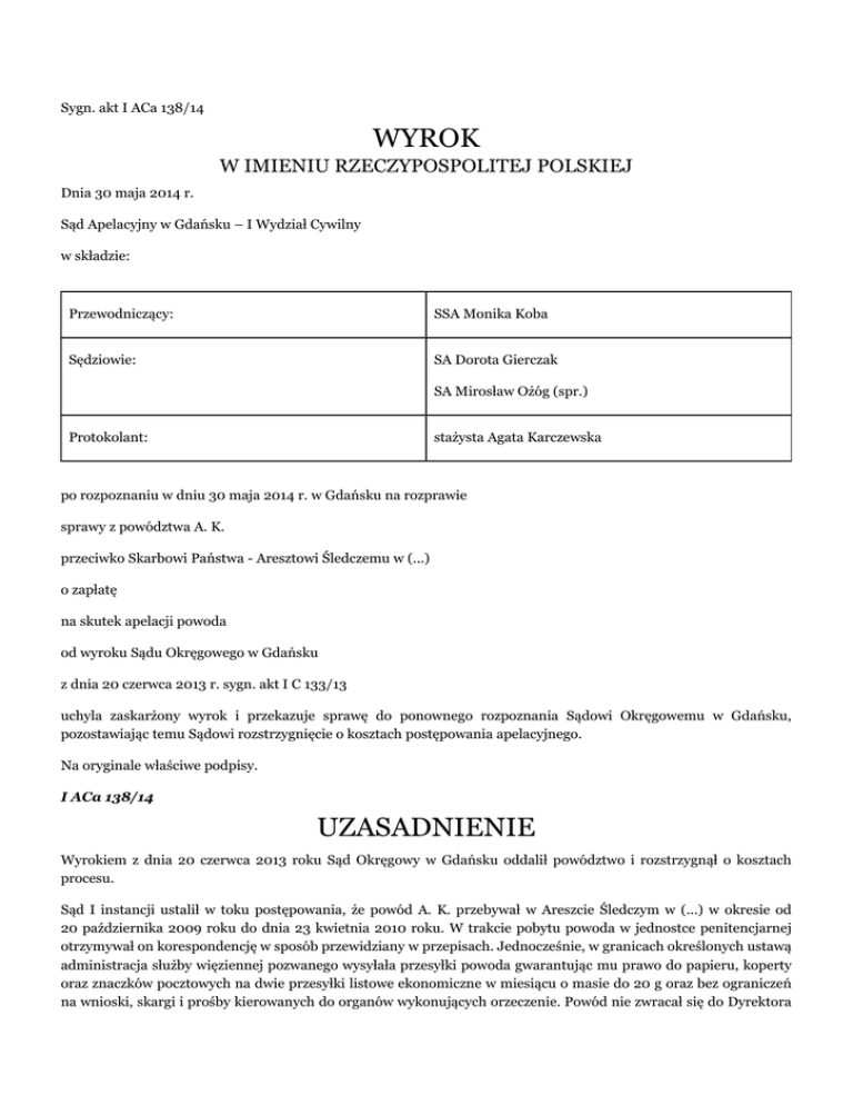 Sygn. akt I ACa 138/14 WYROK W IMIENIU RZECZYPOSPOLITEJ POLSKIEJ Dnia 30 maja 2014 r. Sąd Apelacyjny w Gdańsku – I Wydział Cywilny w składzie: Przewodniczący: SSA Monika Koba Sędziowie: SA Dorota Gierczak SA Mirosław Ożóg (spr.) Protokolant: stażysta Agata Karczewska po rozpoznaniu w dniu 30 maja 2014 r. w Gdańsku na rozprawie sprawy z powództwa A. K. przeciwko Skarbowi Państwa - Aresztowi Śledczemu w (...) o zapłatę na skutek apelacji powoda od wyroku Sądu Okręgowego w Gdańsku z dnia 20 czerwca 2013 r. sygn. akt I C 133/13 uchyla zaskarżony wyrok i przekazuje sprawę do ponownego rozpoznania Sądowi Okręgowemu w Gdańsku, pozostawiając temu Sądowi rozstrzygnięcie o kosztach postępowania apelacyjnego. Na oryginale właściwe podpisy. I ACa 138/14 UZASADNIENIE Wyrokiem z dnia 20 czerwca 2013 roku Sąd Okręgowy w Gdańsku oddalił powództwo i rozstrzygnął o kosztach procesu. Sąd I instancji ustalił w toku postępowania, że powód A. K. przebywał w Areszcie Śledczym w (...) w okresie od 20 października 2009 roku do dnia 23 kwietnia 2010 roku. W trakcie pobytu powoda w jednostce penitencjarnej otrzymywał on korespondencję w sposób przewidziany w przepisach. Jednocześnie, w granicach określonych ustawą administracja służby więziennej pozwanego wysyłała przesyłki powoda gwarantując mu prawo do papieru, koperty oraz znaczków pocztowych na dwie przesyłki listowe ekonomiczne w miesiącu o masie do 20 g oraz bez ograniczeń na wnioski, skargi i prośby kierowanych do organów wykonujących orzeczenie. Powód nie zwracał się do Dyrektora Aresztu Śledczego w (...) z wnioskiem o przekazanie mu dodatkowych znaczków powołując się szczególnie uzasadnioną potrzebę. Oceniając zasadność roszczenia o zadośćuczynienie Sąd Okręgowy zważył, że należało w pierwszej kolejności ustalić, czy rzeczywiście doszło do naruszenia dóbr osobistych powoda, a w dalszej kolejności, czy działanie pozwanego było obiektywnie bezprawne, to jest sprzeczne z normami prawnymi lub zasadami współżycia społecznego. Na podstawie zgromadzonego materiału dowodowego Sąd I instancji uznał, że działanie administracji służby więziennej Aresztu Śledczego w (...) w żadnej mierze nie naruszyło obowiązujących norm prawnych, w tym przepisów Rozporządzenia Ministra Sprawiedliwości z dnia 25 sierpnia 2003 roku w sprawie regulaminu organizacyjno – porządkowego wykonywania kary pozbawienia wolności, jak i kodeksu karnego wykonawczego, czy norm prawa międzynarodowego. Co do zasady, zgodnie z § 16 ust. 3 wskazanego Rozporządzenia przesyłka listowa powinna być właściwie opłacona przez skazanego. Jednakże § 18 stanowi, że skazany nieposiadający środków pieniężnych otrzymuje od administracji zakładu karnego papier, koperty oraz znaczki pocztowe na dwie przesyłki listowe ekonomiczne w miesiącu o masie do 20 g a w szczególnie uzasadnionych przypadkach może otrzymać także na dalszą korespondencję. Wobec braku własnych środków pieniężnych powód był uprawniony jedynie do wysyłania dwóch listów w miesiącu. Wbrew twierdzeniu powoda prawo do większej liczby znaczków pocztowych mogło być przyznane przez Dyrektora jednostki jedynie na wyraźną, uzasadnioną pisemnie prośbę osadzonego. Z ustaleń Sądu Okręgowego nie wynika natomiast, by powód w okresie pobytu w Areszcie Śledczym w (...) zwracał się z jakimikolwiek wnioskami o przekazanie mu dodatkowych znaczków powołując się na szczególnie uzasadnioną potrzebę. Co więcej, niektóre z wymienionych podmiotów do których powód kierował swoją korespondencję ( Ministerstwo Zdrowia, Minister Sprawiedliwości, Ambasada w Holandii, ONZ) nie są w świetle przedstawionych przepisów prawa organami wykonującymi orzeczenia. W konsekwencji, do takiej korespondencji nie znajduje zastosowania zasada dostarczania skazanemu nielimitowanej ilości znaczków. W tej sytuacji Sąd I instancji uznał, że powód w toku postępowania nie wykazał, aby w trakcie pobytu w Areszcie Śledczym w (...) poniósł szkodę niemajątkową z uwagi na naruszenie jego dóbr osobistych. W apelacji powód wnosił o uchylenie zaskarżonego wyroku i przekazanie sprawy Sądowi I instancji do ponownego rozpoznania wskazując między innymi, że otrzymał od administracji pozwanego Aresztu Śledczego 31 potwierdzeń nadania korespondencji dostarczonej przez powoda, która zgodnie z przepisami powinna być wysłana do adresatów a w rzeczywistości listy te nie zostały wysłane a Państwo wprowadziło powoda w błąd wystawiając potwierdzenie wysłania. Sąd Apelacyjny zważył co następuje : Apelacja powoda zasługuje na uwzględnienie, jednakże nie z przyczyn w niej wskazanych. Zgodzić się bowiem należy z twierdzeniem pozwanego zawartym w odpowiedzi na apelację, że pisemne potwierdzenie odbioru korespondencji urzędowej o którym stanowi przepis art. 105 § 7 k.k.w. potwierdza jedynie odbiór od skazanego korespondencji składanej w zakładzie karnym a nie stanowi dowodu jej wysłania. Cytowany przez Sąd I instancji przepis art. 8a § 2 i 3 kodeksu karnego wykonawczego według którego nie podlega cenzurze, nadzorowi oraz zatrzymaniu korespondencja skazanego pozbawionego wolności z obrońcą lub pełnomocnikiem będącym adwokatem lub radcą prawnym i powinna być bezzwłocznie przekazywana do adresata, przy czym zasady te stosuje się także do korespondencji skazanego prowadzonej z organami ścigania, wymiaru sprawiedliwości i innymi organami państwowymi, organami samorządu terytorialnego, Rzecznikiem Praw Obywatelskich, Rzecznikiem Praw Dziecka oraz organami powołanymi na podstawie ratyfikowanych przez Rzeczpospolitą Polską umów międzynarodowych dotyczących ochrony praw człowieka nie znajduje zastosowania w rozstrzyganym przypadku. Przepis art. 8a k.k.w. obowiązuje dopiero od 1 stycznia 2012 roku a zarzuty pozwu dotyczące niedoręczania korespondencji powód wywod