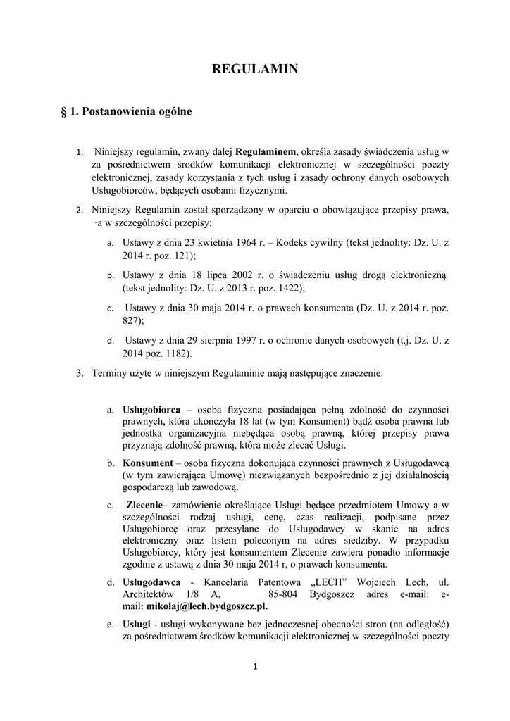 REGULAMIN § 1. Postanowienia ogólne 1. Niniejszy regulamin, zwany dalej Regulaminem, określa zasady świadczenia usług w za pośrednictwem środków komunikacji elektronicznej w szczególności poczty elektronicznej, zasady korzystania z tych usług i zasady ochrony danych osobowych Usługobiorców, będących osobami fizycznymi. 2. Niniejszy Regulamin został sporządzony w oparciu o obowiązujące przepisy prawa, ·a w szczególności przepisy: a. Ustawy z dnia 23 kwietnia 1964 r. – Kodeks cywilny (tekst jednolity: Dz. U. z 2014 r. poz. 121); b. Ustawy z dnia 18 lipca 2002 r. o świadczeniu usług drogą elektroniczną (tekst jednolity: Dz. U. z 2013 r. poz. 1422); c. Ustawy z dnia 30 maja 2014 r. o prawach konsumenta (Dz. U. z 2014 r. poz. 827); d. Ustawy z dnia 29 sierpnia 1997 r. o ochronie danych osobowych (t.j. Dz. U. z 2014 poz. 1182). 3. Terminy użyte w niniejszym Regulaminie mają następujące znaczenie: a. Usługobiorca – osoba fizyczna posiadająca pełną zdolność do czynności prawnych, która ukończyła 18 lat (w tym Konsument) bądź osoba prawna lub jednostka organizacyjna niebędąca osobą prawną, której przepisy prawa przyznają zdolność prawną, która może zlecać Usługi. b. Konsument – osoba fizyczna dokonująca czynności prawnych z Usługodawcą (w tym zawierająca Umowę) niezwiązanych bezpośrednio z jej działalnością gospodarczą lub zawodową. c. Zlecenie– zamówienie określające Usługi będące przedmiotem Umowy a w szczególności rodzaj usługi, cenę, czas realizacji, podpisane przez Usługobiorcę oraz przesyłane do Usługodawcy w skanie na adres elektroniczny oraz listem poleconym na adres siedziby. W przypadku Usługobiorcy, który jest konsumentem Zlecenie zawiera ponadto informacje zgodnie z ustawą z dnia 30 maja 2014 r, o prawach konsumenta. d. Usługodawca - Kancelaria Patentowa „LECH” Wojciech Lech, ul. Architektów 1/8 A, 85-804 Bydgoszcz adres e-mail: email: [email protected]. e. Usługi - usługi wykonywane bez jednoczesnej obecności stron (na odległość) za pośrednictwem środków komunikacji elektronicznej w szczególności poczty 1 elektronicznej przez Usługodawcę na rzecz Usługobiorców w oparciu o Regulamin, polegające w szczególności na umożliwieniu przeglądania i odczytywania przez Usługobiorców treści Bloga, dodawania komentarzy, umożliwieniu Usługobiorcom zapisu na listę subskrybentów Bloga i otrzymywaniu w ramach usługi nowych artykułów publikowanych na Blogu, udzielaniu przez Usługodawcę na rzecz Usługobiorców płatnych porad i konsultacji prawnych, sporządzaniu opinii prawnych, opracowywaniu dokumentów (min. umów, wniosków, odwołań itp.) oraz zawieraniu umów o reprezentację klientów w sprawach spornych. f. Umowa - umowa świadczenia Usług zgodnie ze Zleceniem, zawierana przez Strony na odległość. g. Strony – Usługobiorca i Usługodawca. h. Serwis lub Blog – system informatyczny witryny internetowej www.znakitowarowe-blog.pl lub www.wzoryprzemyslowe-blog.pl, za pośrednictwem których Usługodawca prowadzi blogi prawnicze o tematyce prawnej ochrony znaków towarowych oraz prawnej ochrony wzorów przemysłowych oraz świadczy Usługi zgodnie z niniejszym Regulaminem. § 2. Świadczenie usług drogą elektroniczną. 1. Świadczenie Usług odbywa się przy wykorzystaniu systemu teleinformatycznego, zapewniającego przetwarzanie i przechowywanie, a także wysłanie i odbieranie danych poprzez sieci telekomunikacyjne zgodnie z ustawą z dnia 18 lipca 2002 r. o świadczeniu usług drogą elektroniczną. 2. Świadczone usługi obejmują: a. Przeglądanie stron Usługodawcy, w tym możliwość przeglądania i odczytywania przez Usługobiorców treści Bloga, b. Dodawanie komentarzy zamieszczanych na Blogu przez każdego użytkownika sieci Internet bez konieczności rejestracji, c. Umożliwienie Usługobiorcom zapisu na listę subskrybentów Bloga i otrzymywanie w ramach usługi nowych artykułów publikowanych na Blogu a także dodatkowych informacji na temat znaków towarowych i wzorów przemysłowych, d. Udzielanie przez Usługodawcę na rzecz Usługobiorców porad i konsultacji prawnych, sporządzaniu opinii prawnych, opracowywaniu dokumentów (min. umów, wniosków, odwołań itp.), e. Zawarcie umowy o reprezentację klientów przed organami lub sądami w sprawach spornych. 3. W celu właściwego korzystania z Usług Usługobiorca powinien posiadać komputer lub urządzenie z zainstalowanym oprogramowaniem pozwalającym na przeglądanie 2 stron internetowych (Internet Explorer 7, FireFox 3, Opera 10, Chrome 4, Safari 6 lub nowsze) oraz dostęp do sieci Internet. 4. W celu zlecenia Usługi Usługobiorca powinien posiadać adres elektroniczny (e-mail) oraz aktywny numer telefonu u operatora korzystającego z polskich zasobów numeracji (+48). 5. Przed rozpoczęciem korzystania z Serwisu, w tym przed Zleceniem Usługi, Usługobiorca powinien zapoznać się z treścią niniejszego Regulaminu oraz polityką prywatności, dostępnymi na stronach Usługodawcy. § 3. Zawarcie umowy świadczenia usług 1. Zawarcie umowy świadczenia Usług, o których mowa w § 2 ust 2 pkt a następuje w momencie dokonania jakiejkolwiek czynności w Serwisie przez Usługobiorcę (np. kliknięcie w celu odczytania treści bloga lub komentarza do bloga). 2. Zawarcie umowy o świadczenie Usługi, o której mowa w § 2 ust 2 pkt b następuje w momencie wysłania przez Usługobiorcę do Usługodawcy komentarza do określonego artykułu. Do zawarcia umowy konieczne jest podanie: 1) nazwy Usługobiorcy, którą może być imię, nazwisko lub pseudonim 2) adresu poczty elektronicznej Usługobiorcy 3. Zawarcie umowy o świadczenie usługi, o której mowa w § 2 pkt 2 c następuje przez podanie adresu poczty elektronicznej w formularzu zapisu na newsletter, zamieszczonym na Blogu. § 4. Subskrypcja Bloga 1. Subskrypcja Bloga następuje przez podanie przez Usługobiorcę adresu poczty elektronic