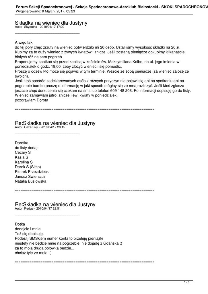 Forum Sekcji Spadochronowej - Sekcja Spadochronowa-Aeroklub Białostocki - SKOKI SPADOCHRONOW Wygenerowano: 8 March, 2017, 05:23 Składka na wieniec dla Justyny Autor: Skydotka - 2010/04/17 17:22 _____________________________________ A więc tak: do tej pory chęć zrzuty na wieniec potwierdziło mi 20 osób. Ustaliliśmy wysokość składki na 20 zł. Kupimy za to duży wieniec z żywych kwiatów i znicze. Jeśli zostaną pieniądze dokupimy kilkanaście białych róż na sam pogrzeb. Proponujemy spotkać się przed kaplicą w kościele św. Maksymiliana Kolbe, na ul. jego imienia w poniedziałek o godz. 18.00 żeby złożyć wieniec i się pomodlić. Proszę o odzew kto może się pojawić w tym terminie. Weźcie ze sobą pieniądze (za wieniec założę ze swoich). Jeśli ktoś spośród zadeklarowanych osób z różnych przyczyn nie pojawi się ani na spotkaniu ani na pogrzebie bardzo proszę o informację w jaki sposób mógłby się ze mną rozliczyć. Jeśli ktoś zgłasza jeszcze chęć dorzucenia się czekam na sms lub telefon 609 148 208. Po informacji dopisuję go do listy. Wieniec zamawiam jutro, znicze i ew. kwiaty w poniedziałek. pozdrawiam Dorota ============================================================================ Re:Składka na wieniec dla Justyny Autor: CezarSky - 2010/04/17 20:15 _____________________________________ Dorotka do listy dodaj: Cezary S Kasia S Karolina S Darek S (Sitko) Piotrek Przezdziecki Janusz Swierszcz Natalia Buslowska ============================================================================ Re:Składka na wieniec dla Justyny Autor: Redge - 2010/04/17 22:51 _____________________________________ Dotka dodajcie i mnie. Też się dopisuję. Podeślij SMSkiem numer konta to przeleję pieniążki niestety nie będzie mnie na pogrzebie, nie dojadę z Gdańska :( za to moja druga połówka będzie... chciaż tyle ze mnie :( ============================================================================ 1/3 Forum Sekcji Spadochronowej - Sekcja Spadochronowa-Aeroklub Białostocki - SKOKI SPADOCHRONOW Wygenerowano: 8 March, 2017, 05:23 Re:Składka na wieniec dla Justyny Autor: Kejt - 2010/04/18 13:44 _____________________________________ Będę w poniedziałek ============================================================================ Re:Składka na wieniec dla Justyny Autor: Skydotka - 2010/04/18 14:00 _____________________________________ Robaczki wy moje kochane, jestem bardzo mile zaskoczona ilością osób która się do mnie zgłosiła:) do tej pory chęć zrzutki zadeklarowało 35 osób :woohoo: wieniec już jest zamówiony, dostarczą go w poniedziałek przed 18 pod kościół. Zostało nam jeszcze sporo kasy na białe róże i znicze więc niech nikt już nic nie dokupuje. Jak już mówiłam wieniec będzie jutro. Z tego co wiem kilka osób nie może się pojawić ale kto da radę niech przybywa. Im nas więcej tym lepiej. Róże dostarczę przed mszą w poniedziałek i tu moja prośba, chciałabym rozdać je jeszcze przed mszą całej sekcji, bo w tym czasie zdechłyby w samochodzie. Będę robić wszystko by dotrzeć tam na kwadrans przed mszą (ale domyślam się, że będzie problem z miejscem parkingowym), dobrze by było gdybyście się zebrali w jednym miejscu (w kościele lub przed) żebym nie musiała z tym latać. Na chwilę obecną to wszystko co mam do przekazania. Ew. pytania proszę telefonicznie 609 148 208 (tylko nie w okolicach 20 bo bubu się kąpie:) ) pozdrawiam Dorota ============================================================================ Re:Składka na wieniec dla Justyny Autor: tomek - 2010/04/18 22:09 _____________________________________ We wtorek nie wiem czy dam rade, ale w poniedziałek postaram się być ============================================================================ Re:Składka na wieniec dla Justyny Autor: Ola - 2010/04/18 22:41 _____________________________________ Ja będę na pewno, w poniedziałek i we wtorek. ============================================================================ Re:Składka na wieniec dla Justyny Autor: Skybabe - 2010/04/19 09:20 _____________________________________ Ja też będę i w poniedziałek i we wtorek 2/3 Forum Sekcji Spadochronowej - Sekcja Spadochronowa-Aeroklub Białostocki - SKOKI SPADOCHRONOW Wygenerowano: 8 March, 2017, 05:23 ============================================================================ Re:Składka na wieniec dla Justyny Autor: Skydotka - 2010/04/23 21:12 _____________________________________ Podsumowując: do zrzuty zadeklarowało się 37 osób, co daje 740zł. Wieniec kosztował 300 zł, do tego 263 zł białe róże i 24 zł znicze, co daje 587 zł. Prostą kalkulacją wychodzi, że zostaje nam 153 zł, wpadliśmy więc na pomysł żeby przeznaczyć je na znicze i małą wiązankę, którą będzie można położyć, kiedy zostaną usunięte kwiaty z pogrzebu. Sądzę, że ten pomysł powinien się wszystkim spodobać. Do tej pory pieniążki dostałam od 28 osób. Chciałabym wiedzieć, w jaki sposób pozostałe 9 osób chciałoby się rozliczyć. Jurku z tego co słyszałam, ktoś zostawił jakąś kasę tobie. Można to też przelać do mnie na konto. Zainteresowanym mogę wysłać dane smsem 609 148 208. Skoro już zajęłam się składką, podejmuję się też zakupu tego mniejszego wianuszka i zawiezienia go tam. Pewnie znając mnie i tak będę tam zaglądać. Dam znać na forum kiedy jadę, jeśli ktoś by chciał się przyłączyć. Czekam więc na info i pozdrawiam. Dorota ============================================================================ 3/3