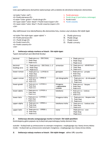 LISTY Lista uporządkowana domyślnie wykorzystuje cyfry arabskie do określania kolejności elementów. <ol style="color: red"> <li> Punkt pierwszy</li> <li style="color: green"> Punkt drugi</li> <li><span style="color: black"> Punkt trzeci</span></li> <li><span style="color: blue"> Punkt czwarty</span></li> </ol> 1. 2. 3. 4. Punkt pierwszy Punkt drugi (2 jest koloru zielonego) Punkt trzeci Punkt czwarty Aby zdefiniować inne identyfikatory dla elementów listy, możesz użyć atrybutu list-style-type <ol style="list-style-type: upper-alpha" > <li> Punkt pierwszy</li> <li > Punkt drugi</li> <li> Punkt trzeci</li> <li> Punkt czwarty</li> </ol> A. B. C. D. Punkt pierwszy Punkt drugi Punkt trzeci Punkt czwarty 1. Deklaracja rodzaju markera w listach: list-style-type: Typem domyślnym jest decimal (liczby) decimal hebrew decimalleading-zero armenian lower-roman georgian upper-roman cjk-ideographic lower-greek Hiragana + odpowiednia czcionka lower-alpha katakana lower-latin hiragana-iroha upper-alpha katakana-iroha upper-latin none 2. Deklaracja obrazka zastępującego marker w listach list-style-position: Kontrolujemy gdzie pojawia się liczba/znak poprzedzający każdy element listy. outside – liczba/znak są umieszczone na zewnątrz marginesu znajdującego się z lewej strony tekstu inside – liczba/znak są umieszczone wewnątrz marginesu znajdującego się z lewej strony tekstu 3. Deklaracja rodzaju markera w listach: list-style-image: adres URL rysunka