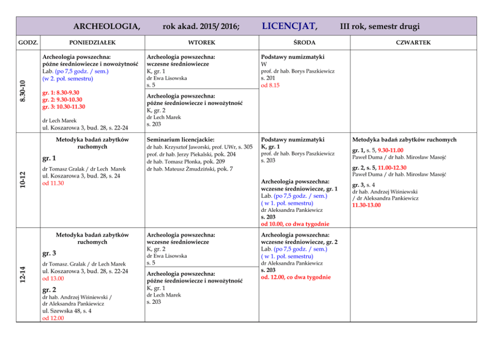 ARCHEOLOGIA, 8.30-10 GODZ. PONIEDZIAŁEK Archeologia powszechna: późne średniowiecze i nowożytność Lab. (po 7,5 godz. / sem.) (w 2. poł. semestru) gr. 1: 8.30-9.30 gr. 2: 9.30-10.30 gr. 3: 10.30-11.30 dr Lech Marek ul. Koszarowa 3, bud. 28, s. 22-24 Metodyka badań zabytków ruchomych gr. 1 10-12 rok akad. 2015/ 2016; dr Tomasz Gralak / dr Lech Marek LICENCJAT, WTOREK Archeologia powszechna: wczesne średniowiecze K, gr. 1 dr Ewa Lisowska s. 5 ŚRODA Podstawy numizmatyki W prof. dr hab. Borys Paszkiewicz s. 201 od 8.15 dr Lech Marek s. 203 Seminarium licencjackie: dr hab. Krzysztof Jaworski, prof. UWr, s. 305 prof. dr hab. Jerzy Piekalski, pok. 204 dr hab. Tomasz Płonka, pok. 209 dr hab. Mateusz Żmudziński, pok. 7 Podstawy numizmatyki K, gr. 1 prof. dr hab. Borys Paszkiewicz s. 203 s. 203 od 10.00, co dwa tygodnie 12-14 dr Tomasz. Gralak / dr Lech Marek ul. Koszarowa 3, bud. 28, s. 22-24 od 13.00 dr Ewa Lisowska s. 5 gr. 2 Archeologia powszechna: późne średniowiecze i nowożytność K, gr. 1 dr hab. Andrzej Wiśniewski / dr Aleksandra Pankiewicz s. 203 ul. Szewska 48, s. 4 od 12.00 dr Lech Marek gr. 1, s. 5, 9.30-11.00 Paweł Duma / dr hab. Mirosław Masojć Paweł Duma / dr hab. Mirosław Masojć Archeologia powszechna: wczesne średniowiecze, gr. 1 Lab. (po 7,5 godz. / sem.) ( w 1. poł. semestru) Archeologia powszechna: wczesne średniowiecze K, gr. 2 Metodyka badań zabytków ruchomych gr. 2, s. 5, 11.00-12.30 dr Aleksandra Pankiewicz gr. 3 CZWARTEK Archeologia powszechna: późne średniowiecze i nowożytność K, gr. 2 ul. Koszarowa 3, bud. 28, s. 24 od 11.30 Metodyka badań zabytków ruchomych III rok, semestr drugi Archeologia powszechna: wczesne średniowiecze, gr. 2 Lab. (po 7,5 godz. / sem.) ( w 1. poł. semestru) dr Aleksandra Pankiewicz s. 203 od. 12.00, co dwa tygodnie gr. 3, s. 4 dr hab. Andrzej Wiśniewski / dr Aleksandra Pankiewicz 11.30-13.00 Blok językowy 14-18 godz. 15.00-18.15 Archeologia powszechna: wczesne średniowiecze / późne średniowiecze i nowożytność W dr hab. Krzysztof Jaworski, prof. UWr / prof. dr hab. Jerzy Piekalski s. 201 14.00-15.30 Podstawy numizmatyki K, gr. 2 prof. dr hab. Borys Paszkiewicz s. 203 15.30-17.00 Archeologia powszechna: wczesne średniowiecze, gr. 3 Lab. (po 7,5 godz. / sem.) ( w 1. poł. semestru) dr Aleksandra Pankiewicz s. 203 od. 14.00, co dwa tygodnie EGZAMINY: Archeologia powszechna: wczesne średniowiecze Archeologia powszechna późne średniowiecze i nowożytność Podstawy numizmatyki PROSZĘ PAMIĘTAĆ O MINIMUM 30 PKT. ECTS, NIEZBĘDNYCH DO ZALICZENIA SEMESTRU (może być więcej, w ramach 30 pkt. kredytowych)