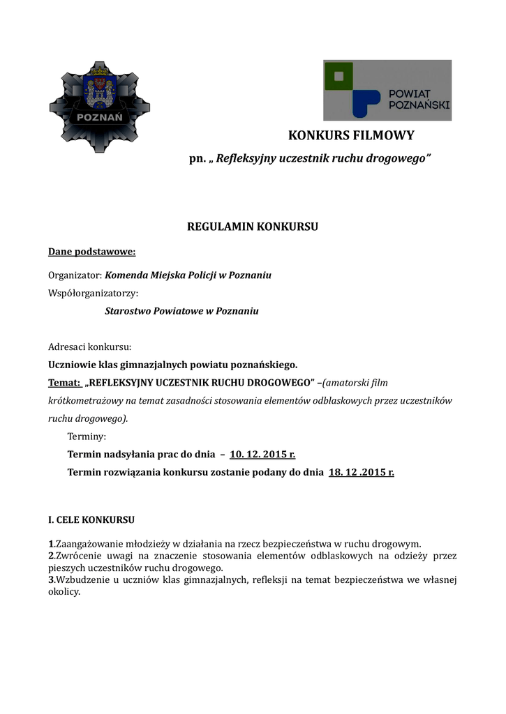 KONKURS FILMOWY pn. „ Refleksyjny uczestnik ruchu drogowego” REGULAMIN KONKURSU Dane podstawowe: Organizator: Komenda Miejska Policji w Poznaniu Współorganizatorzy: Starostwo Powiatowe w Poznaniu Adresaci konkursu: Uczniowie klas gimnazjalnych powiatu poznańskiego. Temat: „REFLEKSYJNY UCZESTNIK RUCHU DROGOWEGO” –(amatorski film krótkometrażowy na temat zasadności stosowania elementów odblaskowych przez uczestników ruchu drogowego). Terminy: Termin nadsyłania prac do dnia – 10. 12. 2015 r. Termin rozwiązania konkursu zostanie podany do dnia 18. 12 .2015 r. I. CELE KONKURSU 1.Zaangażowanie młodzieży w działania na rzecz bezpieczeństwa w ruchu drogowym. 2.Zwrócenie uwagi na znaczenie stosowania elementów odblaskowych na odzieży przez pieszych uczestników ruchu drogowego. 3.Wzbudzenie u uczniów klas gimnazjalnych, refleksji na temat bezpieczeństwa we własnej okolicy. II. ZAŁOŻENIA ORGANIZACYJNE 1. Organizatorem konkursu jest Komenda Miejska Policji w Poznaniu ul. A. Szylinga 2 oraz Starostwo Powiatowe w Poznaniu ul. Jackowskiego 18; 2. Udział w konkursie jest bezpłatny; 3. Prace należy dostarczyć do Komendy Miejskiej Policji w Poznaniu, adres: 60-787 Poznań ul. A. Szylinga 2. 4. Termin nadsyłania prac upływa 10 grudnia 2015r. 5. Jeden twórca może nadesłać na konkurs jedną pracę. 6. Organizator nie ponosi odpowiedzialności za uszkodzenia nadsyłanych prac, powstałe w wyniku transportu pocztowego, dlatego prosi o odpowiednie opakowanie. Materiały przesłane na konkurs nie podlegają zwrotowi i są przesyłane na koszt i ryzyko własne uczestnika. 7. Prace nadesłane na konkurs muszą być pracami własnymi, nigdzie wcześniej niepublikowanymi i nieprzedstawianymi na innych konkursach. Nadesłanie pracy na konkurs jest jednoznaczne ze złożeniem deklaracji o tych faktach. 8. Biorąc udział w konkursie uczestnicy akceptują zasady zawarte w regulaminie konkursu. 9. Film konkursowy powinien spełniać następujące wymagania: a) powinien przedstawiać: - różnice pomiędzy dostrzeganiem na drodze osób stosujących elementy odblaskowe, a tymi którzy ich nie stosują . b) prace mogą zostać wykonane w dowolnym formacie; c) każda praca powinna zawierać następujące dane: - adres przedstawionego miejsca, - imię i nazwisko autora, - nr szkoły i klasy, - zgodę rodziców na wzięcie udziału w konkursie oraz na przetwarzanie danych osobowych w rozumieniu ustawy o ochronie danych osobowych (Dz. U. Nr 133, poz. 833) 1. Prace nadesłane na konkurs stają się własnością organizatora konkursu i mogą być wykorzystane do organizowania pokazów, prelekcji, wystaw, w ramach publikacji (także elektronicznych), udostępniane osobom trzecim itp. Nadsyłając pracę na konkurs autor zgadza się na jej późniejsze upowszechnianie przez organizatora, w tym na zamieszczenie swojego imienia i nazwiska oraz danych szkoły przez organizatora oraz na wykorzystanie prac konkursowych w celach promocyjnych, reklamowych i marketingowych. 2. Organizator zastrzega sobie prawo zmiany regulaminu. 3. Sytuacje nieobjęte niniejszym regulaminem rozstrzyga organizator konkursu. 4. W sprawach nie uregulowanych powyższym regulaminem obowiązują przepisy kodeksu cywilnego. III. OCENA PRAC 1. W skład komisji konkursowej wejdą: - przedstawiciel Komendy Miejskiej Policji w Poznaniu; - przedstawiciel Starostwa Powiatowego w Poznaniu; Prace będą oceniane pod względem merytorycznym i artystycznym. 2. Kryteriami oceny będą: a) zgodność doboru pracy z tematem , b) walory zagadnienia, c) oryginalność. 3. Nagradzani będą autorzy najlepszych prac. Laureatami konkursu będą osoby wyłonione przez Komisję Konkursową. 4. Decyzje Komisji Konkursowej są ostateczne. Komisja zastrzega sobie prawo do swobody w wyborze najlepszych prac. IV. OGŁOSZENIE WYNIKÓW KONKURSU I ROZDANIE NAGRÓD 1. Uroczyste podsumowanie konkursu i rozdanie nagród głównych nastąpi do 14 stycznia 2016r. w siedzibie Komendy Miejskiej Policji w Poznaniu ul. Szylinga 2. ogłoszone zostanie na stronach internetowych organizatora (www.poznan.policja.gov.pl), a także przesłane uczestnikom konkursu. V. NAGRODY 1. Nagrody główne dla uczestników za zajęcie I, II, i III miejsca; 2. Drobne upominki dla wszystkich uczestników konkursu; 3. Planuje się publikację najlepszych prac na stronach internetowych oraz w innych mediach; 4. Nagrody nie podlegają wymianie na ich równowartość pieniężną. Opracował :asp. Marcin Fiedler Wydział Prewencji KMP w Poznaniu Tel. 156-97.